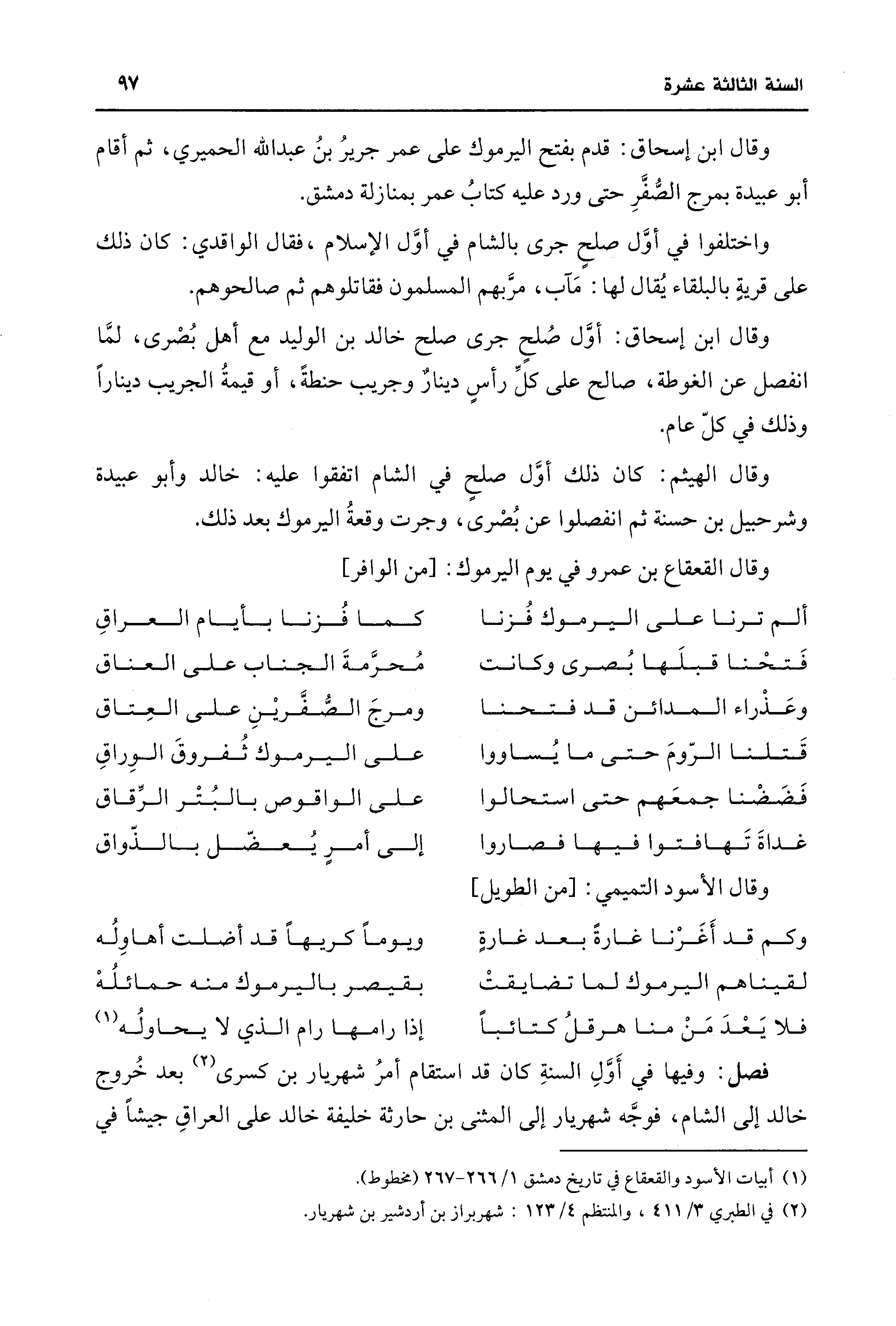 وقال ابن إسحاق: قدم بفتح اليرموك على عمر جريرُ بنُ عبد اللَّه الحميري، ثم أقام أبو عبيدة بمرج الصُّفَّرِ حتى ورد عليه كتابُ عمر بمنازلة دمشق.