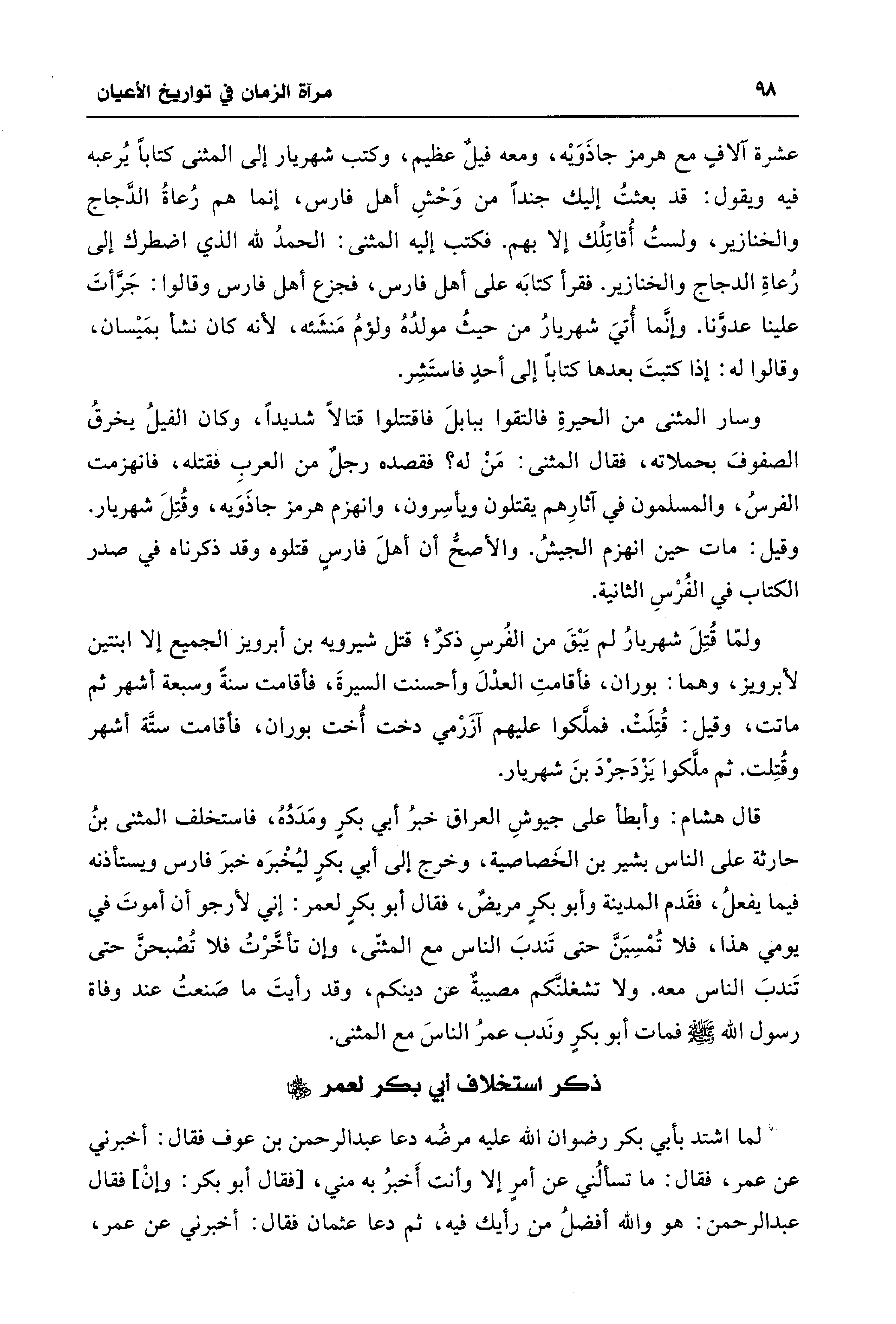 قال هشام: وأبطأ على جيوشِ العراق خبرُ أبي بكرٍ ومَدَدُهُ، فاستخلف المثنى بنُ حارثة على الناس بشير بن الخَصاصية، وخرج إلى أبي بكر ليُخْبرَه خبرَ فارس ويستأذنه فيما يفعلُ، فقَدم المدينة وأبو بكرٍ مريضٌ، فقال أبو بكرٍ لعمر: إني لأرجو أن أموتَ في يومي هذا، فلا تُمْسِيَنَّ حتى تَندبَ الناس مع المثنّى، وإن تأخَرْتُ فلا تُصْبحنَّ حتى تَندبَ الناس معه. ولا تشغلنكَم مصيبةٌ عن دينكم، وقد رأيتَ ما صَنعتُ عند وفاة رسول اللَّه -صلى اللَّه عليه وسلم- فمات أبو بكرٍ ونَدب عمرُ الناسَ مع المثنى.