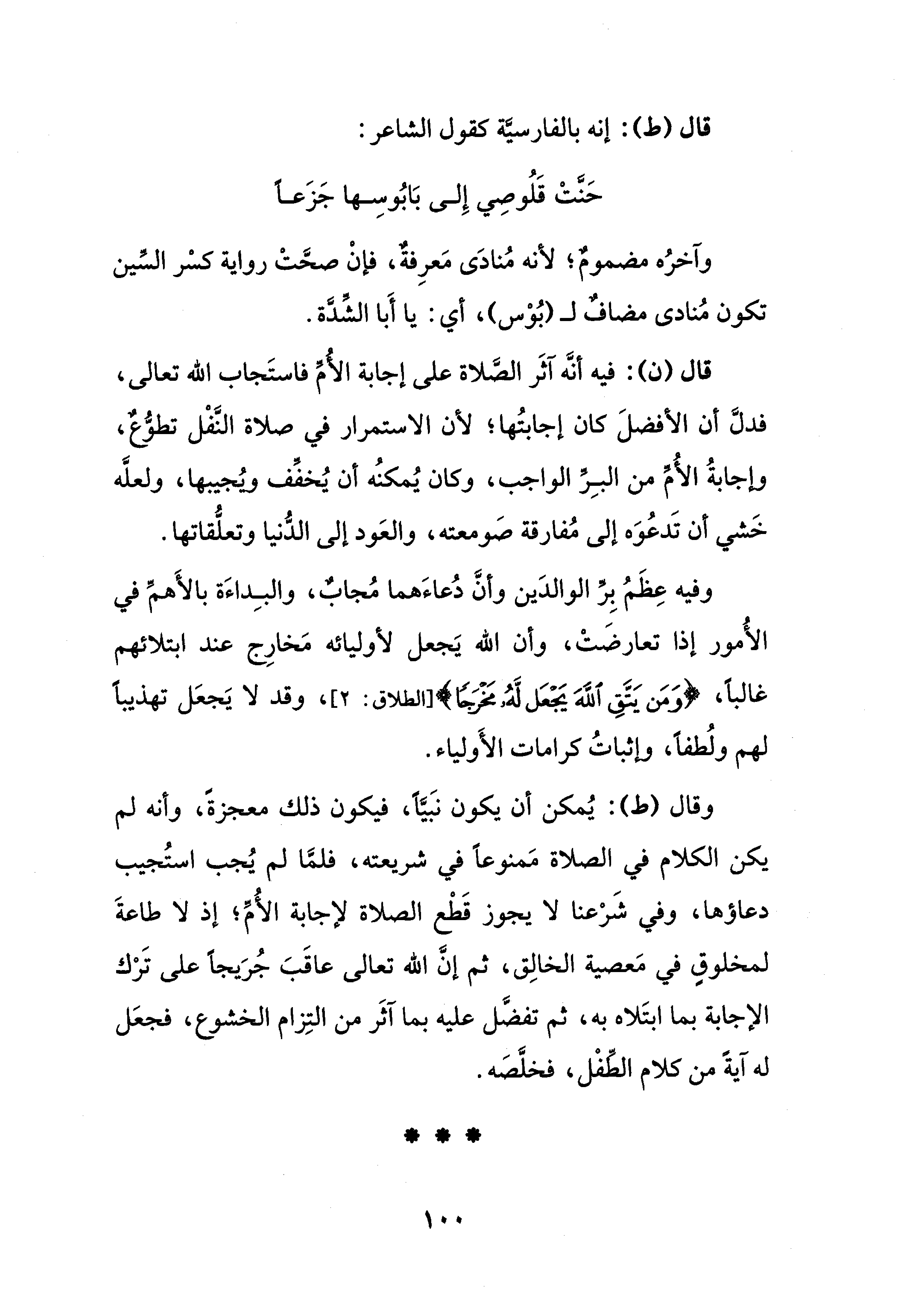 وقال (ط): يُمكن أن يكون نبَيًّا، فيكون ذلك معجزةً، وأنه لم يكن الكلام في الصلاة مَمنوعًا في شريعته، فلمَّا لم يُجب استُجيب دعاؤها، وفي شَرْعنا لا يجوز قَطْع الصلاة لإجابة الأُمِّ؛ إذ لا طاعةَ لمخلوقٍ في مَعصية الخالِق، ثم إنَّ الله تعالى عاقَبَ جُرَيجًا على تَرْك الإجابة بما ابتَلاه به، ثم تفضَّل عليه بما آثَر من التِزام الخشوع، فجعَل له آيةً من كلام الطِّفْل، فخلَّصَه.