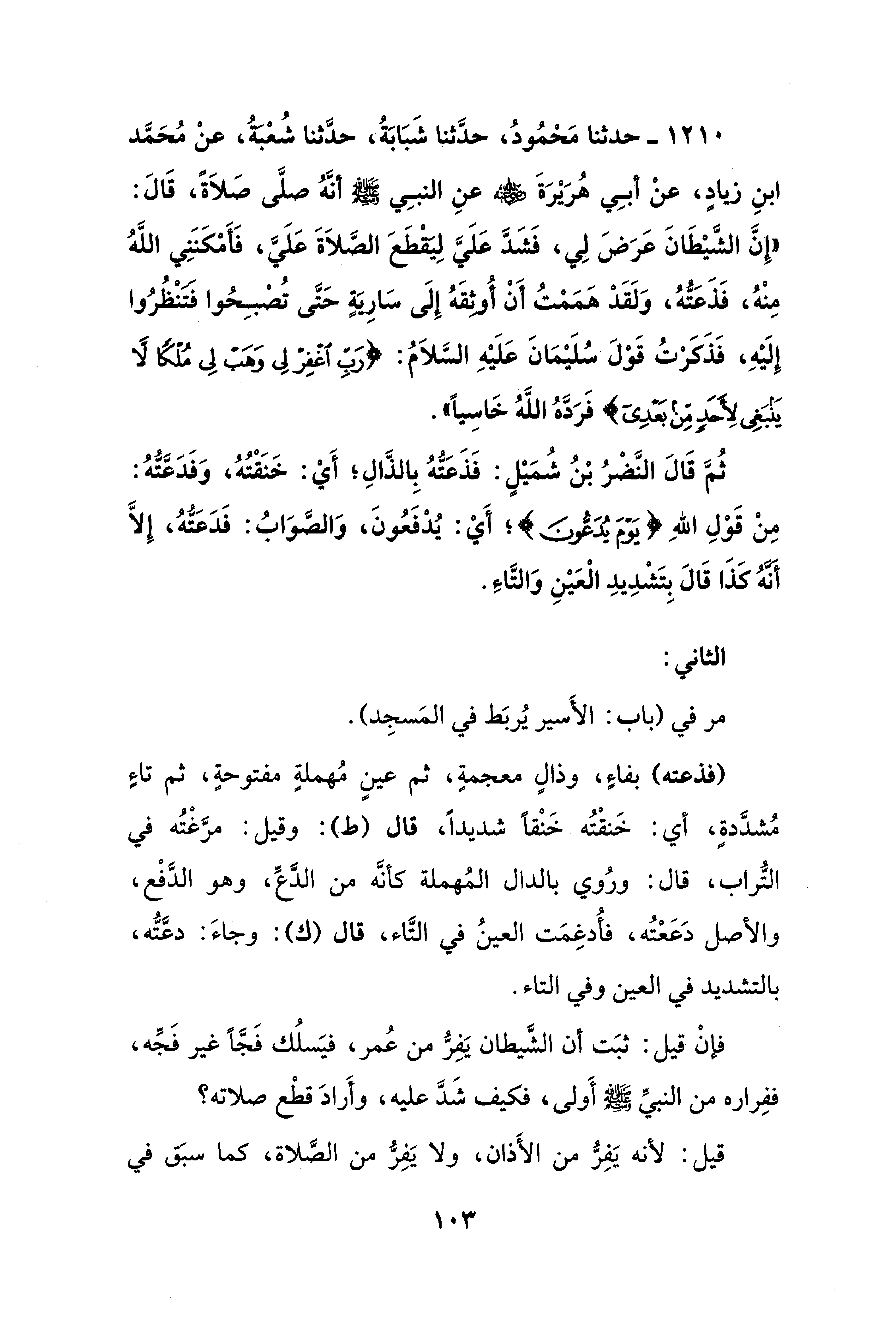 1210 - حدثنا مَحْمُودُ، حدَّثنا شَبَابَةُ، حدَّثنا شُعْبَةُ، عنْ مُحَمَّد ابنِ زيادٍ، عنْ أبِي هُرَيرَةَ - رضي الله عنه - عنِ النبِي - صلى الله عليه وسلم - أنَّهُ صلَّى صَلَاةً، قَالَ: "إِنَّ الشَّيْطَانَ عَرَضَ لِي، فَشَدَّ عَلَيَّ لِيَقْطَعَ الصَّلَاةَ عَلَيَّ، فَأَمْكَنَنِي اللهُ مِنْهُ، فَذَعَتُّهُ، وَلَقَدْ هَمَمْتُ أَنْ أُوثقَهُ إِلَى سَارِيةٍ حَتَّى تُصْبِحُوا فَتَنْظُرُوا إِلَيْهِ، فَذَكَرْتُ قَوْلَ سُلَيْمَانَ عَلَيْهِ السَّلَامُ: {رَبِّ اغْفِرْ لِي وَهَبْ لِي مُلْكًا لَا يَنْبَغِي لِأَحَدٍ مِنْ بَعْدِي} فَرَدَّهُ الله خَاسِيًا".