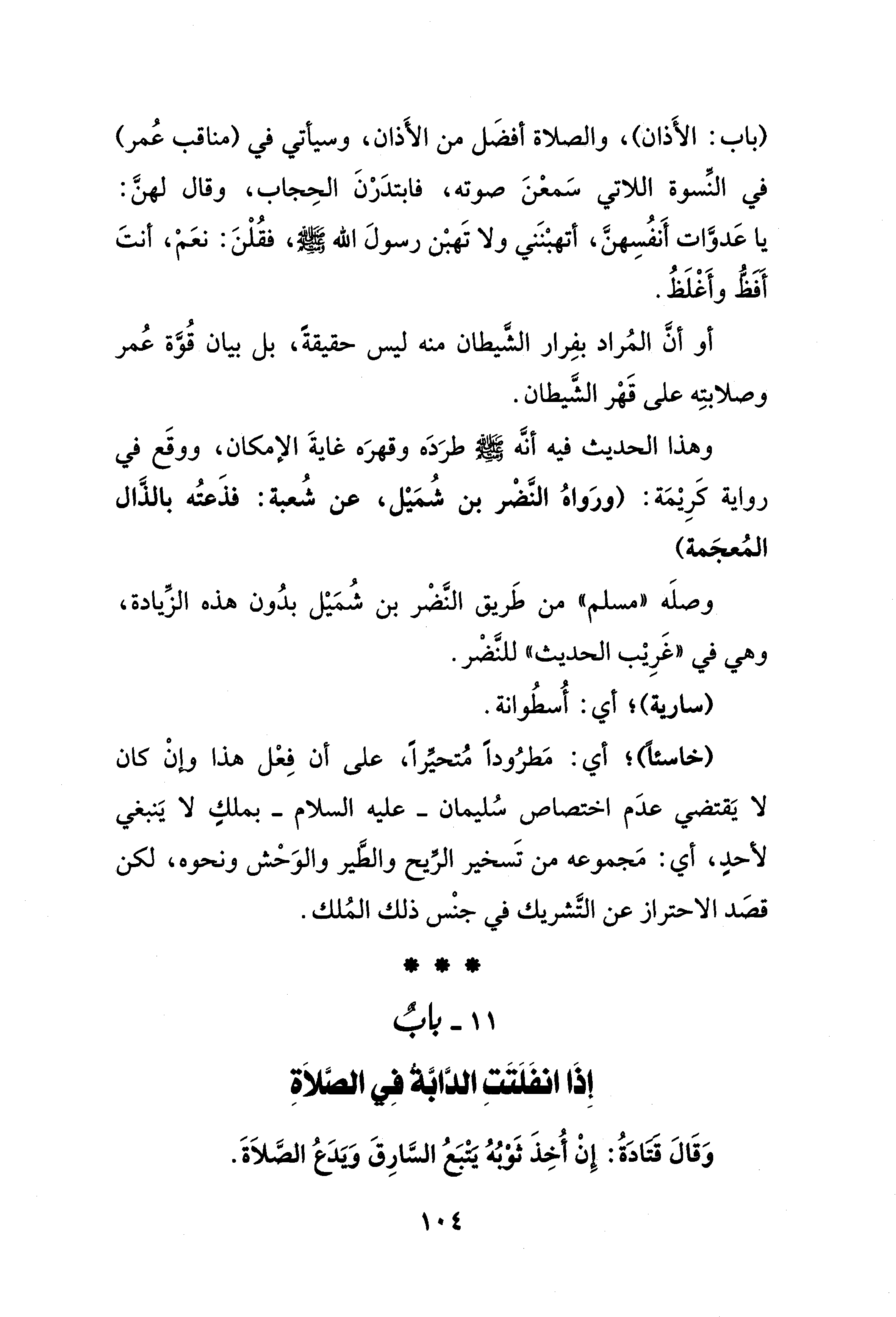 (باب: الأَذان)، والصلاة أفضَل من الأَذان، وسيأتي في (مناقب عُمر) في النِّسوة اللاتي سَمعْنَ صوته، فابتدَرْنَ الحِجاب، وقال لهنَّ: يا عَدوَّات أَنفُسِهنَّ، أتهبْنَني ولا تَهبْن رسولَ الله - صلى الله عليه وسلم -، فقُلْنَ: نعَمْ، أنتَ أَفَظُّ وأَغْلَظُ.