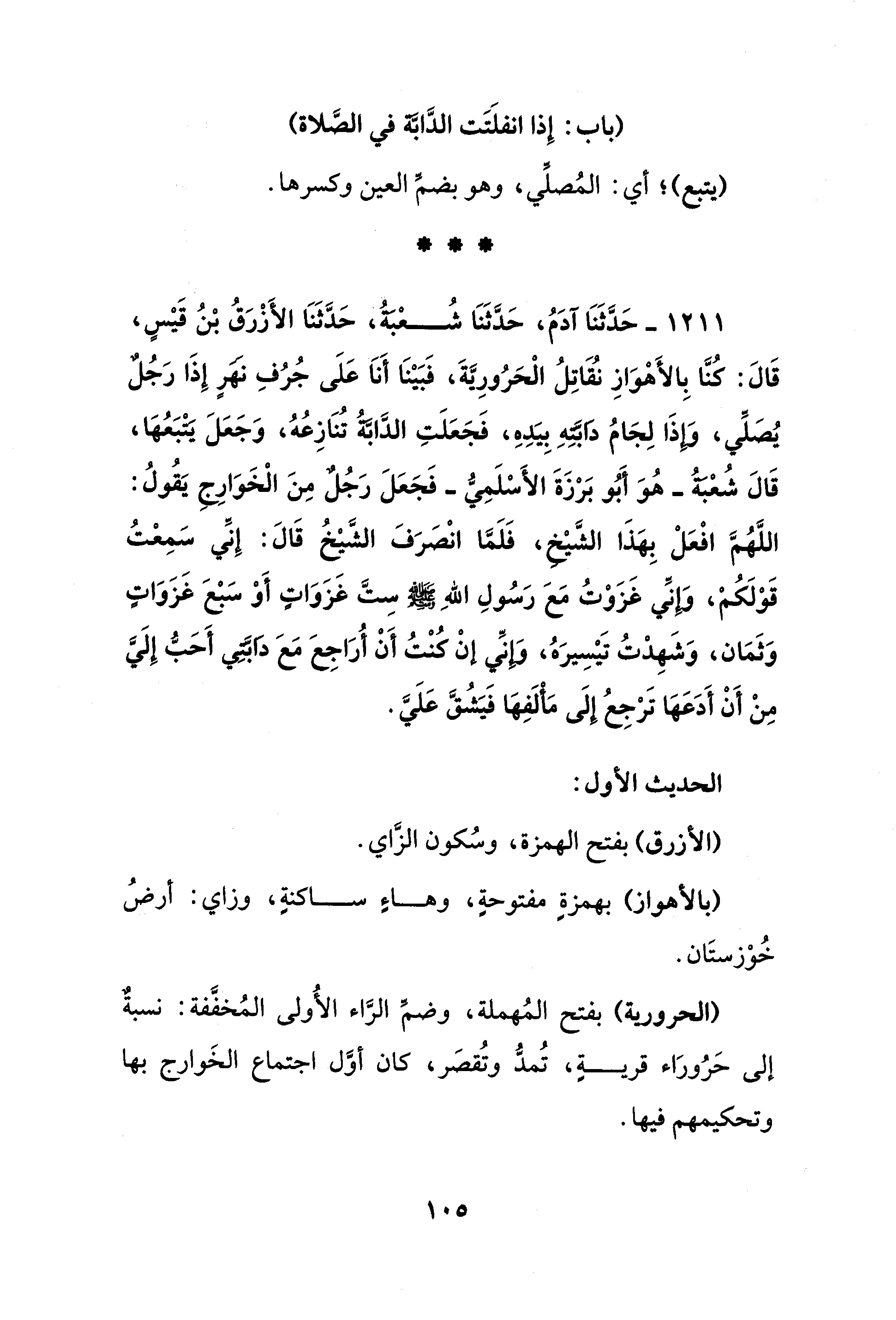 1211 - حَدَّثَنَا آدَمُ، حَدَّثَنَا شُعْبَةُ، حَدَّثَنَا الأَزْرَقُ بْنُ قَيْسٍ، قَالَ: كُنَّا بِالأَهْوَازِ نُقَاتِلُ الْحَرُورِّيةَ، فَبَيْنَا أَنَا عَلَى جُرُفِ نهرٍ إِذَا رَجُلٌ يُصَلِّي، وَإِذَا لِجَامُ دَابَّتِهِ بِيَدِهِ، فَجَعَلَتِ الدَّابَّةُ تُنَازِعُهُ، وَجَعَلَ يَتْبَعُهَا، قَالَ شُعْبَةُ -هُوَ أَبُو بَرْزَةَ الأَسْلَمِيُّ- فَجَعَلَ رَجُلٌ مِنَ الْخَوَارِجِ يَقُولُ: اللَّهُمَّ افْعَلْ بِهَذَا الشَّيْخ، فَلَمَّا انْصَرَفَ الشَّيْخُ قَالَ: إِنِّي سَمِعْتُ قَوْلَكُمْ، وَإِنِّي غَزَوْتُ مَعَ رَسُولِ اللهِ - صلى الله عليه وسلم - ستَّ غَزَوَاتٍ أَوْ سَبع عَزَوَاتٍ وَثَمَان، وَشَهِدْتُ تَيْسِيرَهُ، وإِنِّي إنْ كُنْتُ أَنْ أُرَاجِعَ مَعَ دَابَّتيِ أَحَبُّ إِلَيَّ مِنْ أَنْ أَدَعَهَا تَرْجِعُ إِلَى مَأْلَفِهَا فَيَشُقَّ عَلَيَّ.