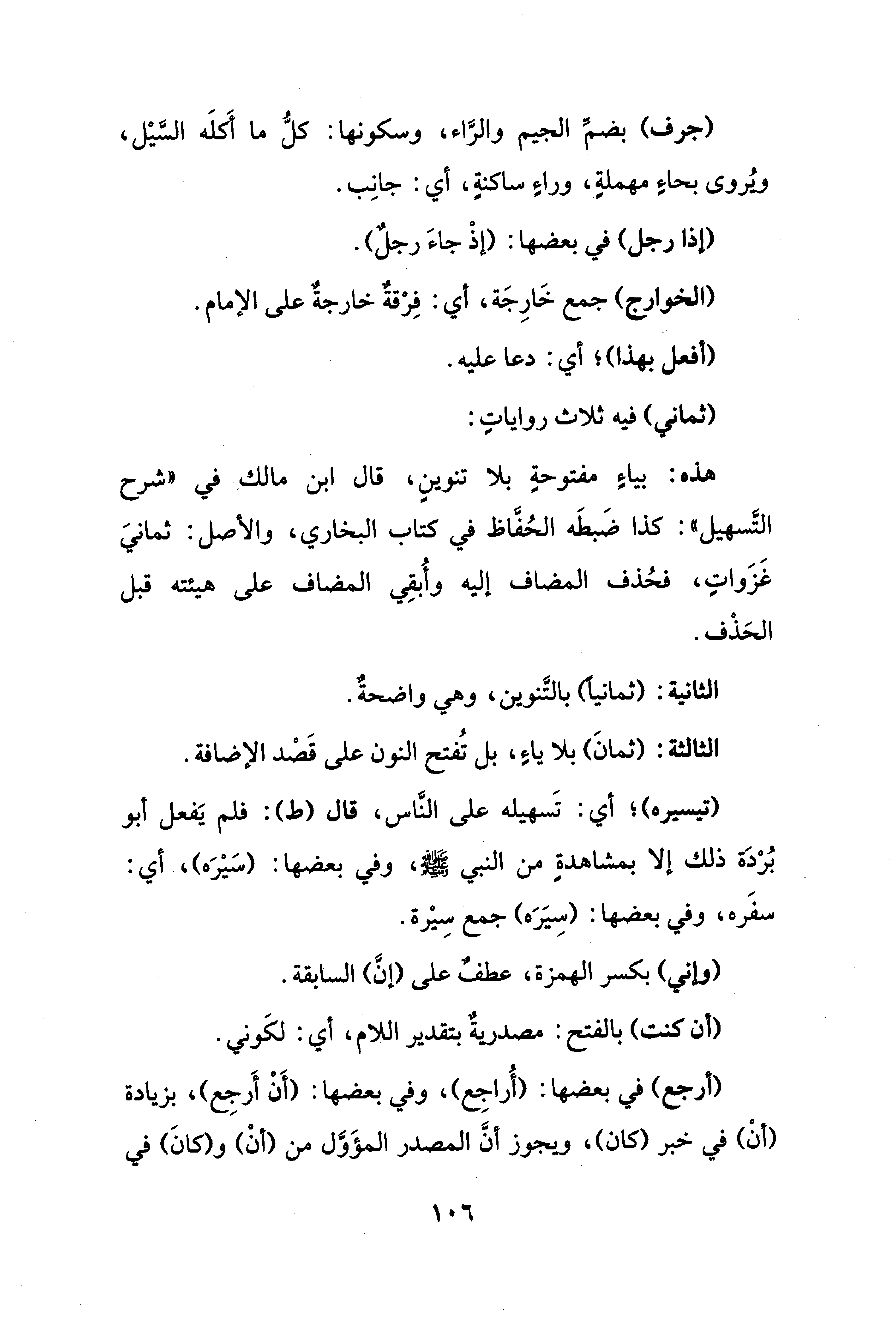 (جرف) بضمِّ الجيم والرَّاء، وسكونها: كلُّ ما أَكَلَه السَّيْل، ويُروى بحاءٍ مهملةٍ، وراءٍ ساكنةٍ، أي: جانِب.