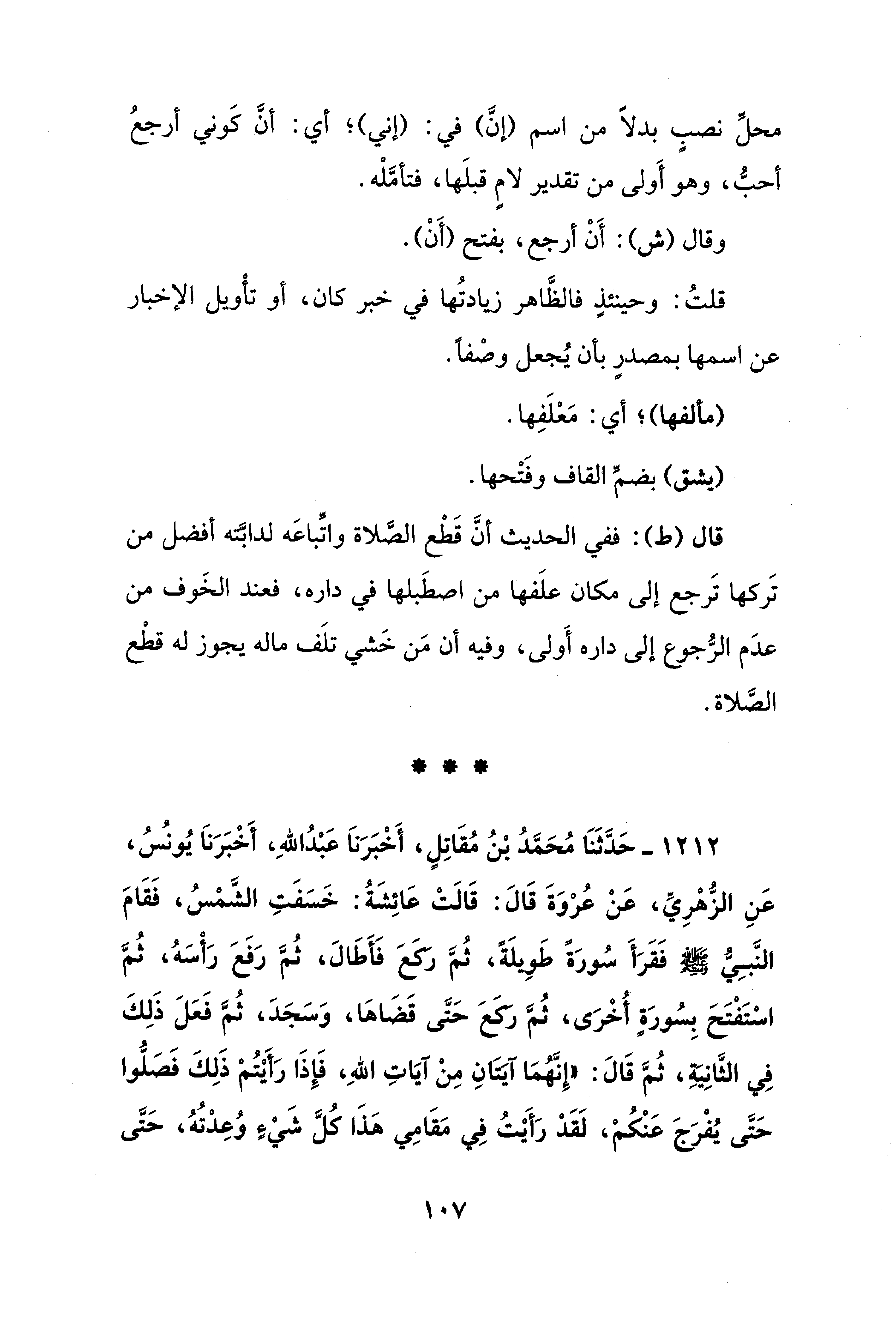 قال (ط): ففي الحديث أنَّ قَطْع الصَّلاة واتِّباعَه لدابَّته أفضل من تَركها تَرجع إلى مكان علَفها من اصطَبلها في دأره، فعند الخَوف من عدَم الرُّجوع إلى داره أَولى، وفيه أن مَن خَشي تلَف ماله يجوز له قطْع الصَّلاة.
