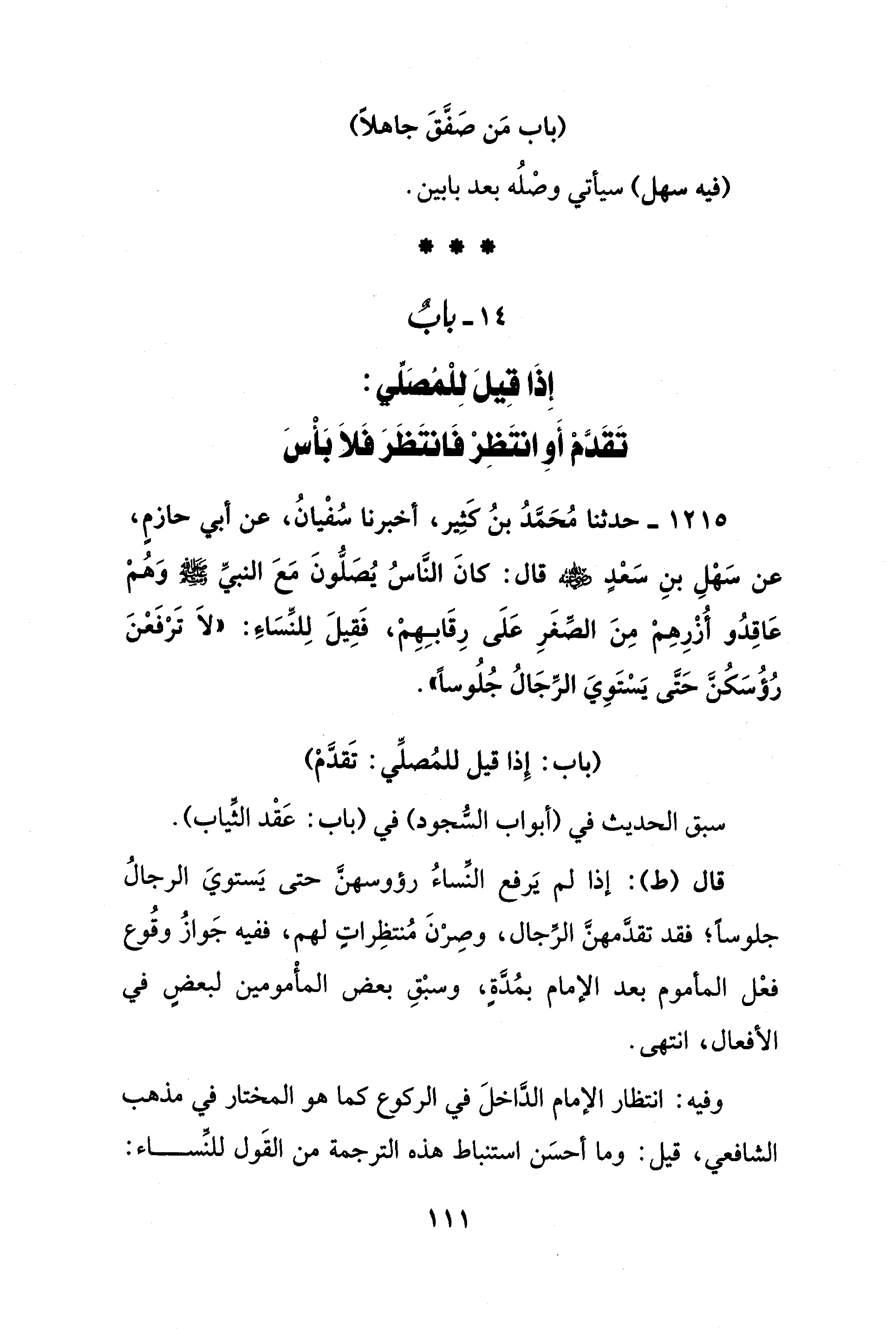 1215 - حدثنا مُحَمَّدُ بنُ كَثِير، أخبرنا سُفْيانُ، عن أبي حازمٍ، عن سَهْلِ بنِ سَعْدٍ - رضي الله عنه - قال: كانَ النَّاسُ يُصَلُّونَ مَعَ النَّبيِّ - صلى الله عليه وسلم - وَهُمْ عَاقِدُو أُزْرِهِمْ مِنَ الصِّغَرِ عَلَى رِقَابِهِمْ، فَقِيلَ لِلنِّسَاءِ: "لَا تَرْفَعْنَ رُؤُسَكُنَّ حَتَّى يَسْتَوِيَ الرِّجَالُ جُلُوسًا".