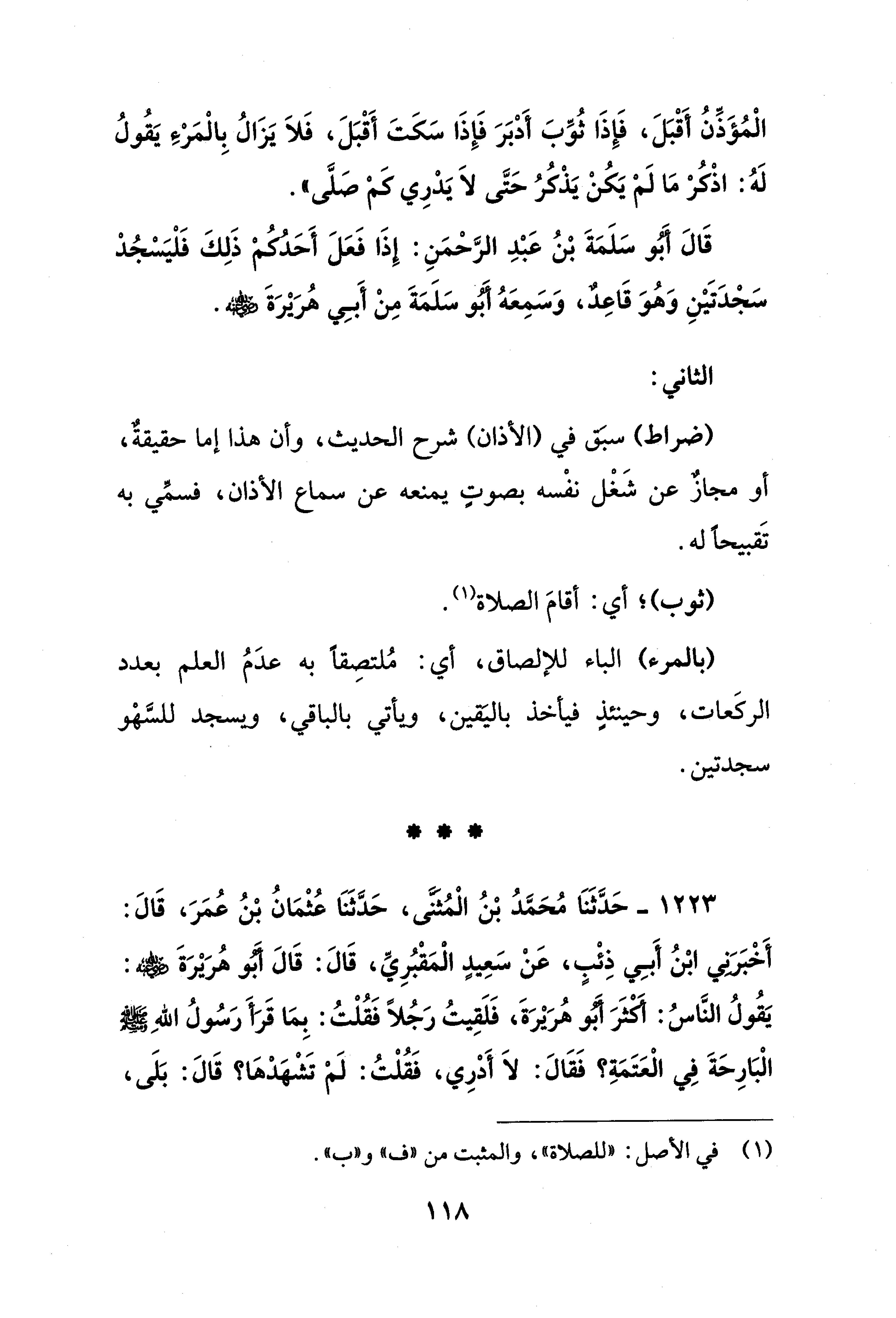1223 - حَدَّثَنَا مُحَمَّدُ بْنُ الْمُثنَّى، حَدَّثَنَا عُثْمَانُ بْنُ عُمَرَ، قَالَ: أَخْبَرَنِي ابْنُ أَبِي ذِئْبٍ، عَنْ سَعِيدٍ الْمَقْبُرِيِّ، قَالَ: قَالَ أَبَو هُرَيْرَةَ - رضي الله عنه -: يَقُولُ النَّاسُ: أَكثَرَ أَبَو هُرَيْرَةَ، فَلَقِيتُ رَجُلًا فَقُلْتُ: بِمَا قَرَأَ رَسُولُ اللهِ - صلى الله عليه وسلم - الْبَارِحَةَ في الْعَتَمَةِ؟ فَقَالَ: لَا أَدْرِي، فَقُلْتُ: لَمْ تَشْهدْهَا؟ قَالَ: بَلَى،