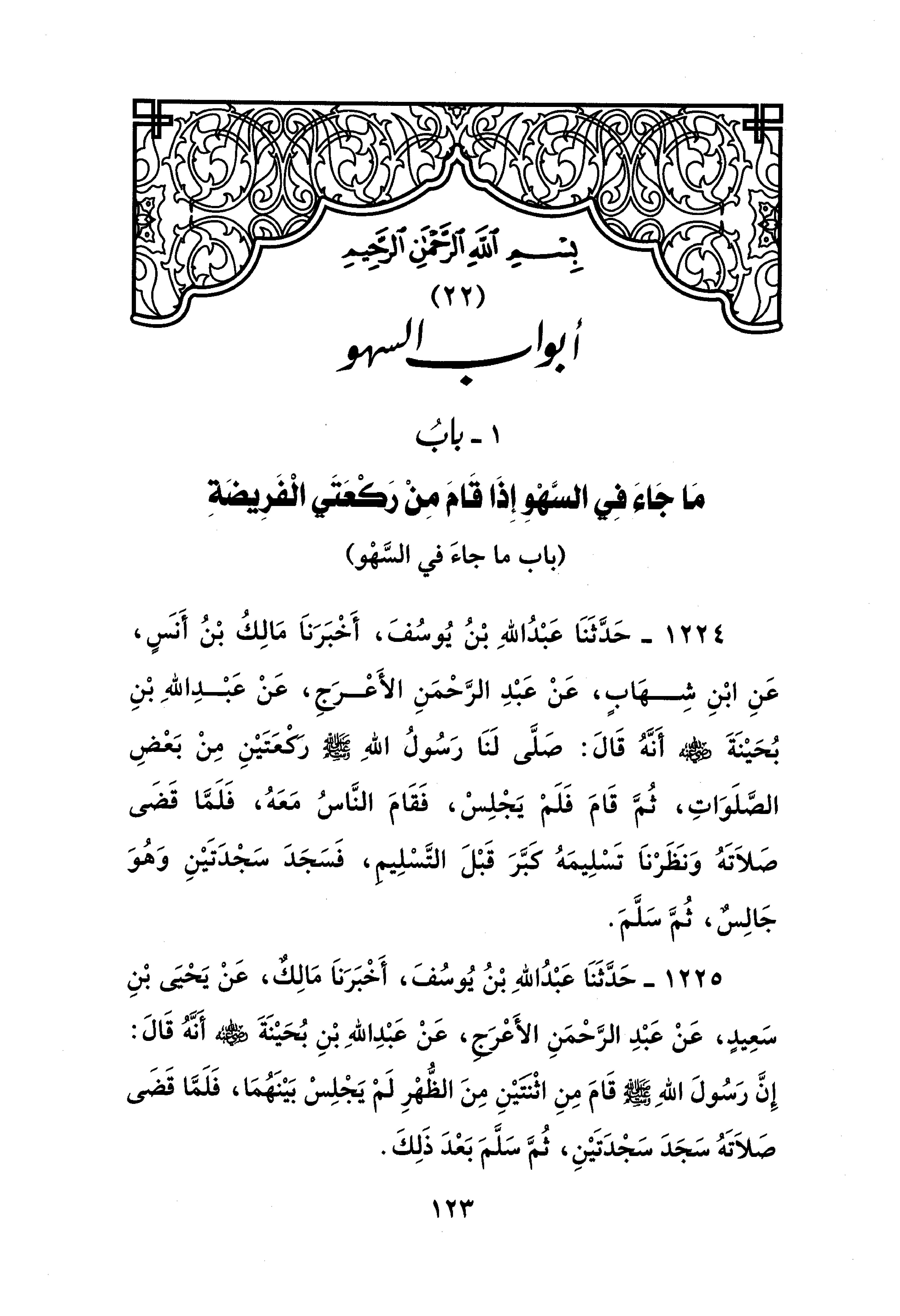 1225 - حَدَّثَنَا عَبْدُ اللهِ بْنُ يُوسُفَ، أَخْبَرَنَا مَالِكٌ، عَنْ يَحْيَى بْنِ سَعِيدٍ، عَنْ عَبْدِ الرَّحْمَنِ الأَعْرَجِ، عَنْ عَبْدِ اللهِ بْنِ بُحَيْنَةَ - رضي الله عنه - أَنَّهُ قَالَ: إِنَّ رَسُولَ اللهِ - صلى الله عليه وسلم - قَامَ مِنِ اثْنتَيْنِ مِنَ الظُّهْرِ لَمْ يَجْلِسْ بَيْنَهُمَا، فَلَمَّا قَضَى صَلَاتَهُ سَجَدَ سَجْدَتَيْنِ، ثُمَّ سَلَّمَ بَعْدَ ذَلِكَ.