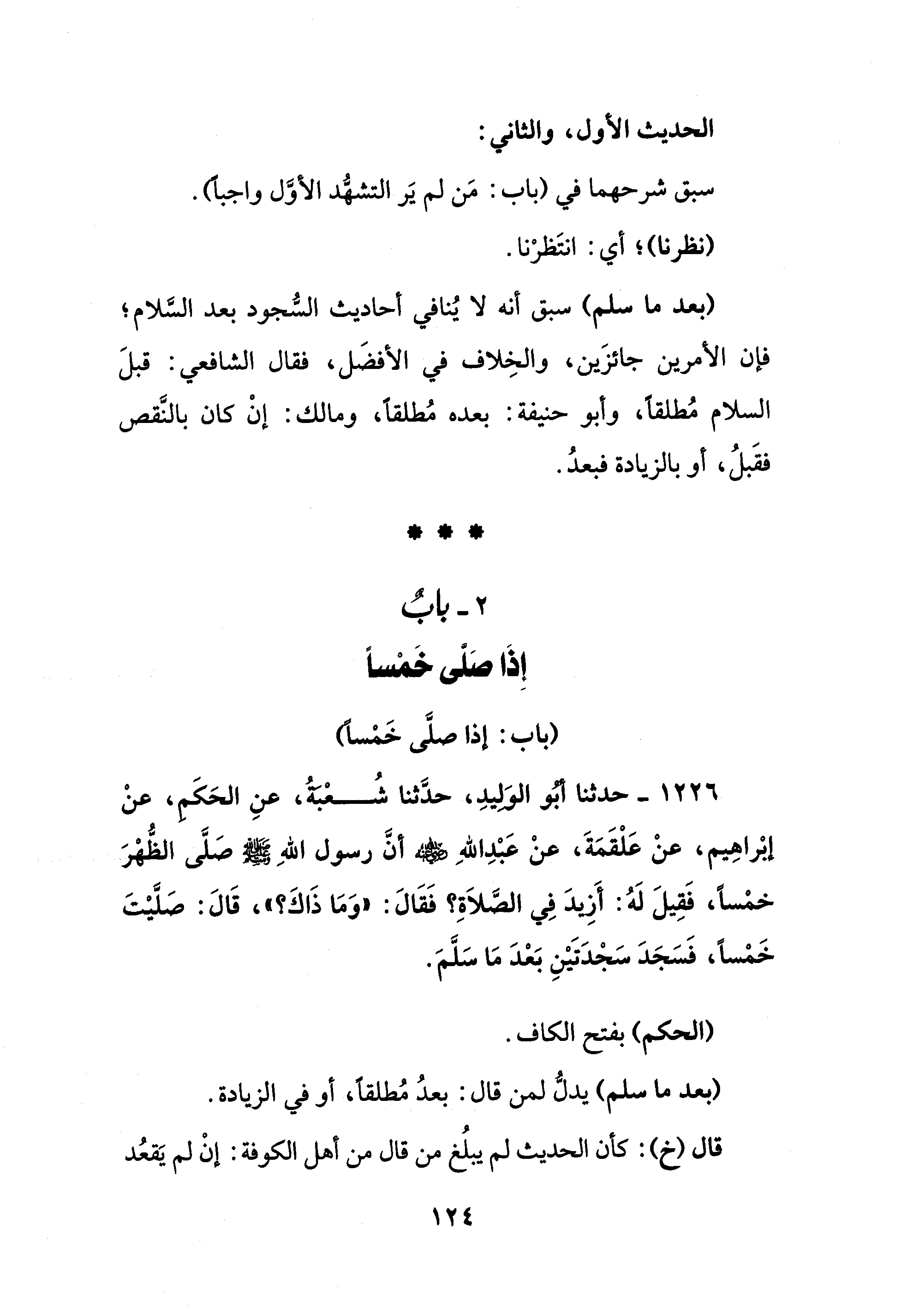 1226 - حدثنا أبُو الوَلِيدِ، حدَّثنا شُعْبَةُ، عنِ الحَكَم، عنْ إبْراهِيم، عنْ عَلْقَمَةَ، عنْ عَبْدِ اللهِ - رضي الله عنه - أنَّ رسول اللهِ - صلى الله عليه وسلم - صَلَّى الظُّهْرَ خمْسًا، فَقِيلَ لَهُ: أَزِيدَ في الصَّلَاةِ؟ فَقَالَ: "وَمَا ذَاكَ؟ "، قَالَ: صَلَّيْتَ خَمْسًا، فَسَجَدَ سَجْدَتَيْنِ بَعْدَ مَا سَلَّمَ.