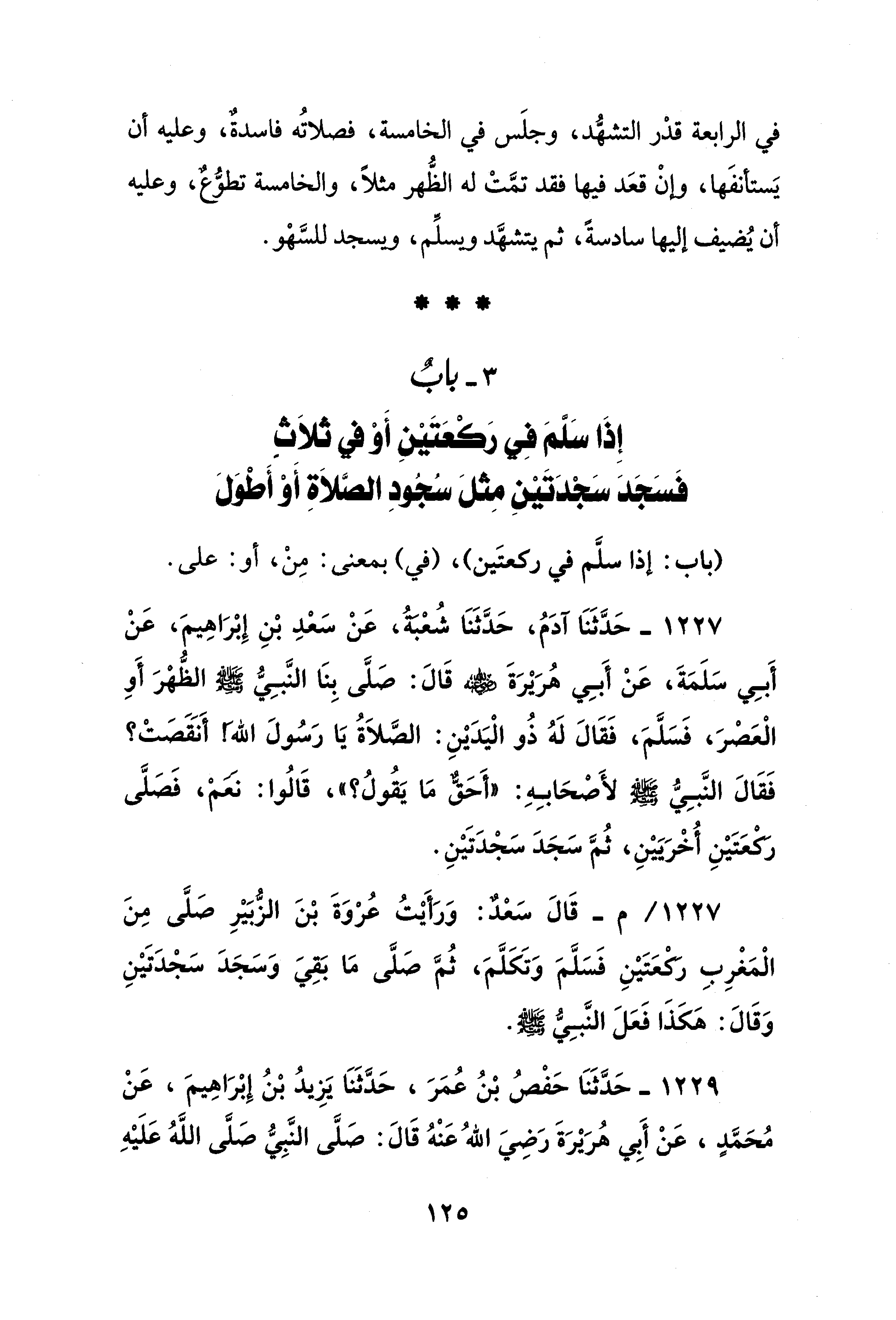 1227 - حَدَّثَنَا آدَمُ، حَدَّثَنَا شُعْبَةُ، عَنْ سَعْدِ بْنِ إِبْرَاهِيمَ، عَنْ أَبِي سَلَمَةَ، عَنْ أَبِي هُرَيْرَةَ - رضي الله عنه - قَالَ: صَلَّى بِنَا النَّبِيُّ - صلى الله عليه وسلم - الظُّهْرَ أَوِ الْعَصْرَ، فَسَلَّمَ، فَقَالَ لَهُ ذُو الْيَدَيْنِ: الصَّلَاةُ يَا رَسُولَ الله! أَنَقَصَتْ؟ فَقَالَ النَّبِيُّ - صلى الله عليه وسلم - لأَصْحَابِهِ: "أَحَقٌّ مَا يَقُولُ؟ "، قَالُوا: نعمْ، فَصَلَّى رَكعَتَيْنِ أُخْرَيَيْنِ، ثُمَّ سَجَدَ سَجْدَتَيْنِ.
