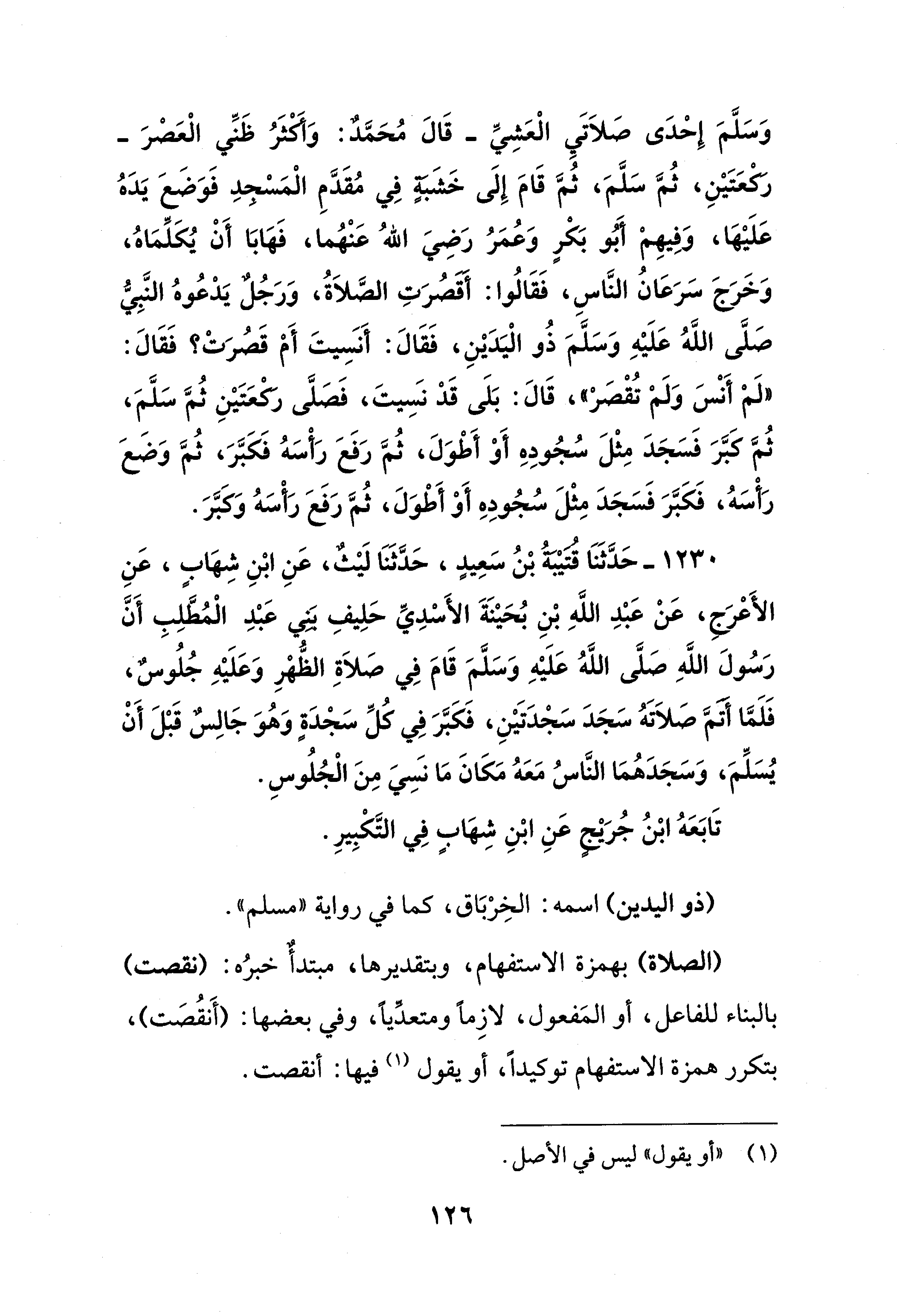 وَسَلَّمَ إِحْدَى صَلَاتَيِ الْعَشِيِّ -قَالَ مُحَمَّد: وَأَكْثرُ ظَنِّي الْعَصْرَ- رَكعَتَيْنِ، ثُمَّ سَلَّمَ، ثُمَّ قَامَ إِلَى خَشَبَةٍ في مُقَدَّمِ الْمَسْجدِ فَوَضَعَ يَدَهُ عَلَيْهَا، وَفِيهِمْ أَبُو بَكْرٍ وَعُمَرُ رَضِيَ اللهُ عَنْهُما، فَهَابَا أَنْ يُكَلِّمَاهُ، وَخَرَجَ سَرَعَانُ النَّاسِ، فَقَالُوا: أَقَصُرَتِ الصَّلَاةُ، وَرَجُلٌ يَدْعُوهُ النَّبِيُّ صلَّى الله عَلَيْهِ وَسَلَّمَ ذُو الْيَدَيْنِ، فَقَالَ: أَنَسِيتَ أَمْ قَصُرَتْ؟ فَقَالَ: "لَمْ أَنْسَ وَلَمْ تُقْصَرْ"، قَالَ: بَلَى قَدْ نَسِيتَ، فَصَلَّى رَكعَتَيْنِ ثُمَّ سَلَّمَ، ثُمَّ كبَّرَ فَسَجَدَ مِثْلَ سُجُودِهِ أَوْ أَطْوَلَ، ثُمَّ رَفَعَ رَأْسَهُ فَكَبَّرَ، ثُمَّ وَضَعَ رَأْسَهُ، فَكَبَّرَ فَسَجَدَ مِثْلَ سُجُودِهِ أَوْ أَطْوَلَ، ثُمَّ رَفَعَ رَأْسَهُ وَكبَّرَ.
