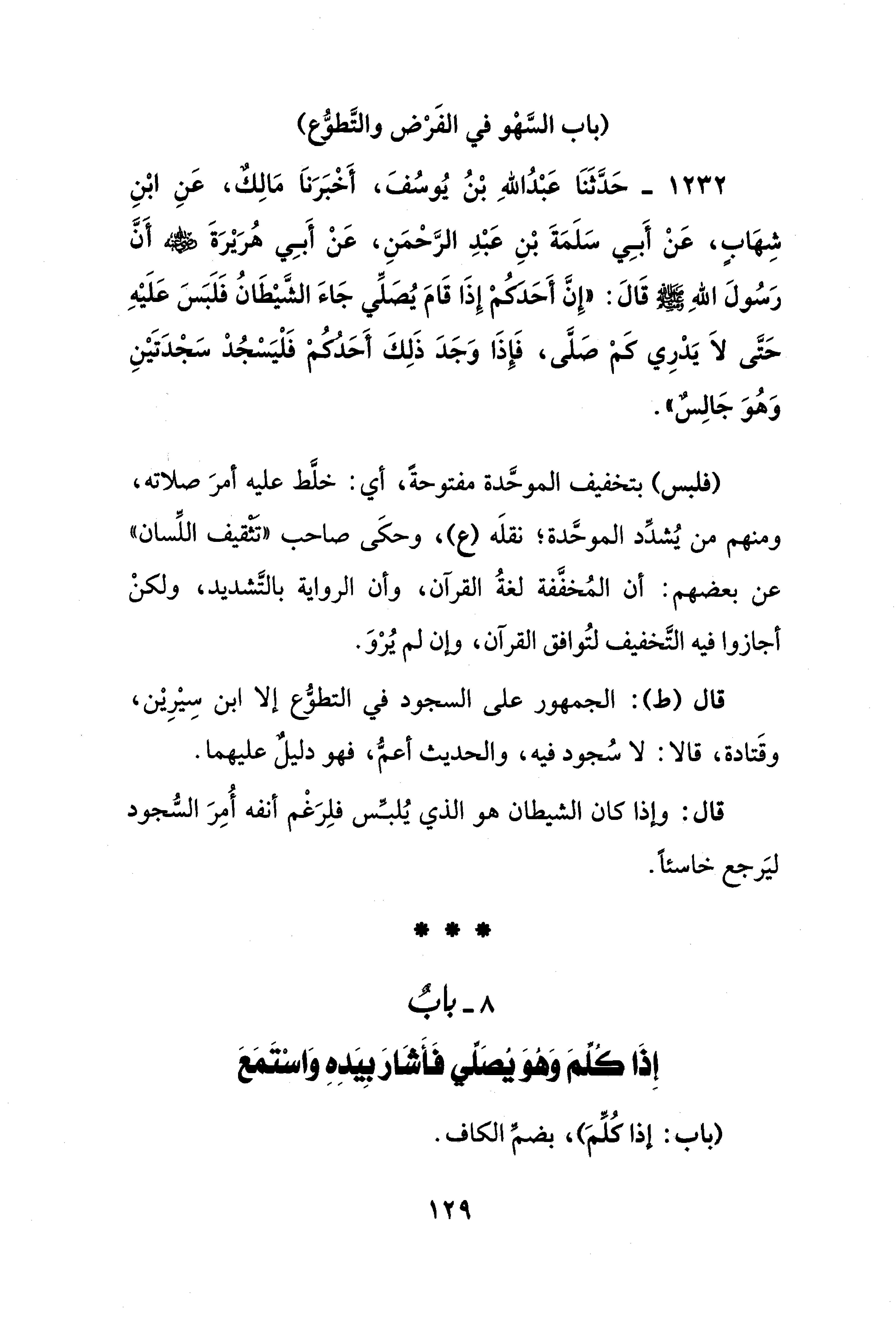 1232 - حَدَّثَنَا عَبْدُ اللهِ بْنُ يُوسُفَ، أَخْبَرَنَا مَالِكٌ، عَنِ ابْنِ شِهَابٍ، عَنْ أَبِي سَلَمَةَ بْنِ عَبْدِ الرَّحْمَنِ، عَنْ أَبِي هُرَيْرَةَ - رضي الله عنه - أَنَّ رَسُولَ اللهِ - صلى الله عليه وسلم - قَالَ: "إِنَّ أَحَدَكُمْ إِذَا قَامَ يُصَلِّي جَاءَ الشَّيْطَانُ فَلَبَسَ عَلَيْهِ حَتَّى لَا يَدْرِي كَمْ صَلَّى، فَإِذَا وَجَدَ ذَلِكَ أَحَدُكُمْ فَلْيَسْجُدْ سَجْدَتَيْنِ وَهُوَ جَالِسٌ".