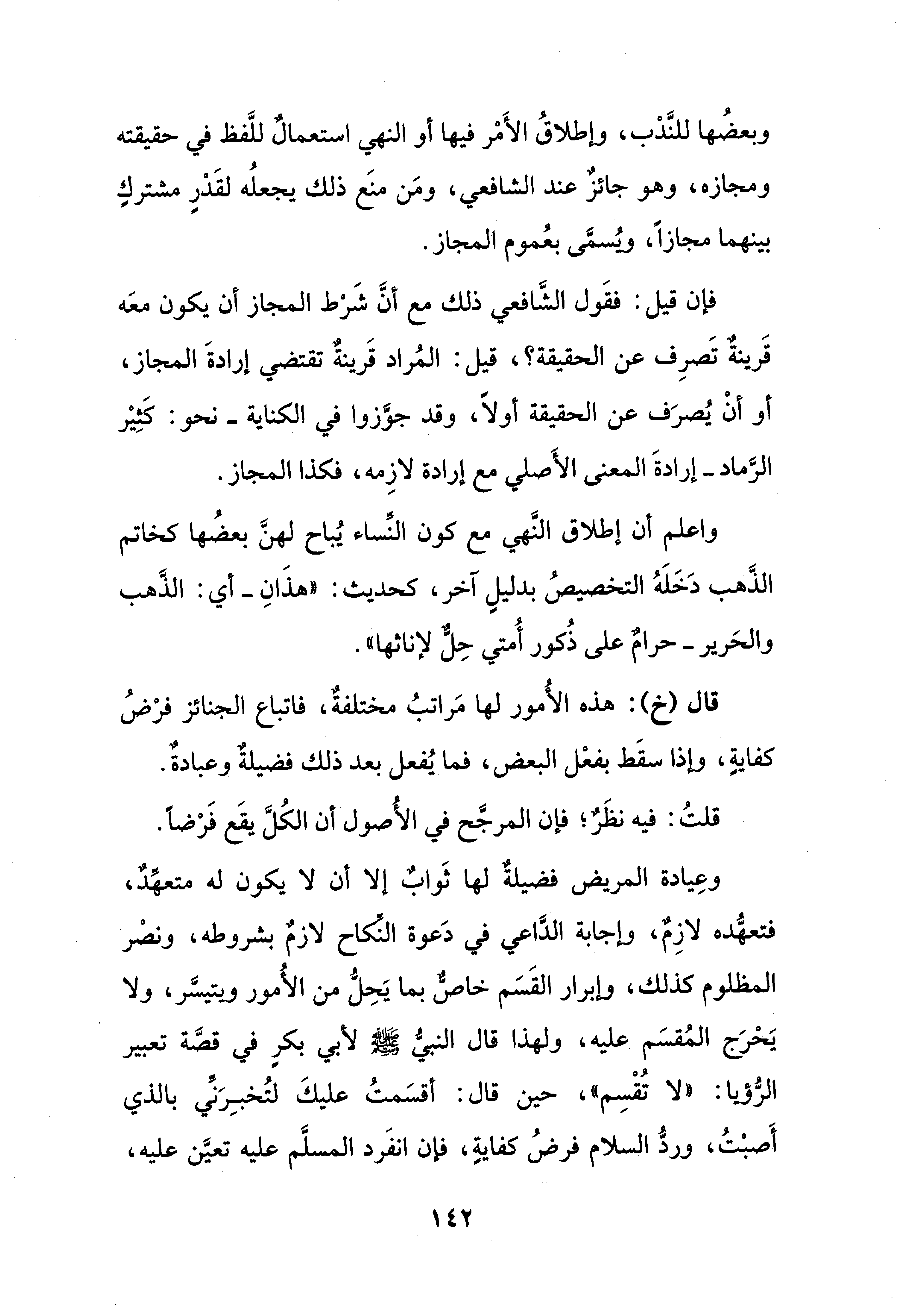 وبعضُها للنَّدْب، وإطلاقُ الأَمْر فيها أو النهي استعمالٌ للَّفظ في حقيقته ومجازه، وهو جائزٌ عند الشافعي، ومَن منعَ ذلك يجعلُه لقَدْرٍ مشتركٍ بينهما مجازًا، ويُسمَّى بعُموم المجاز.