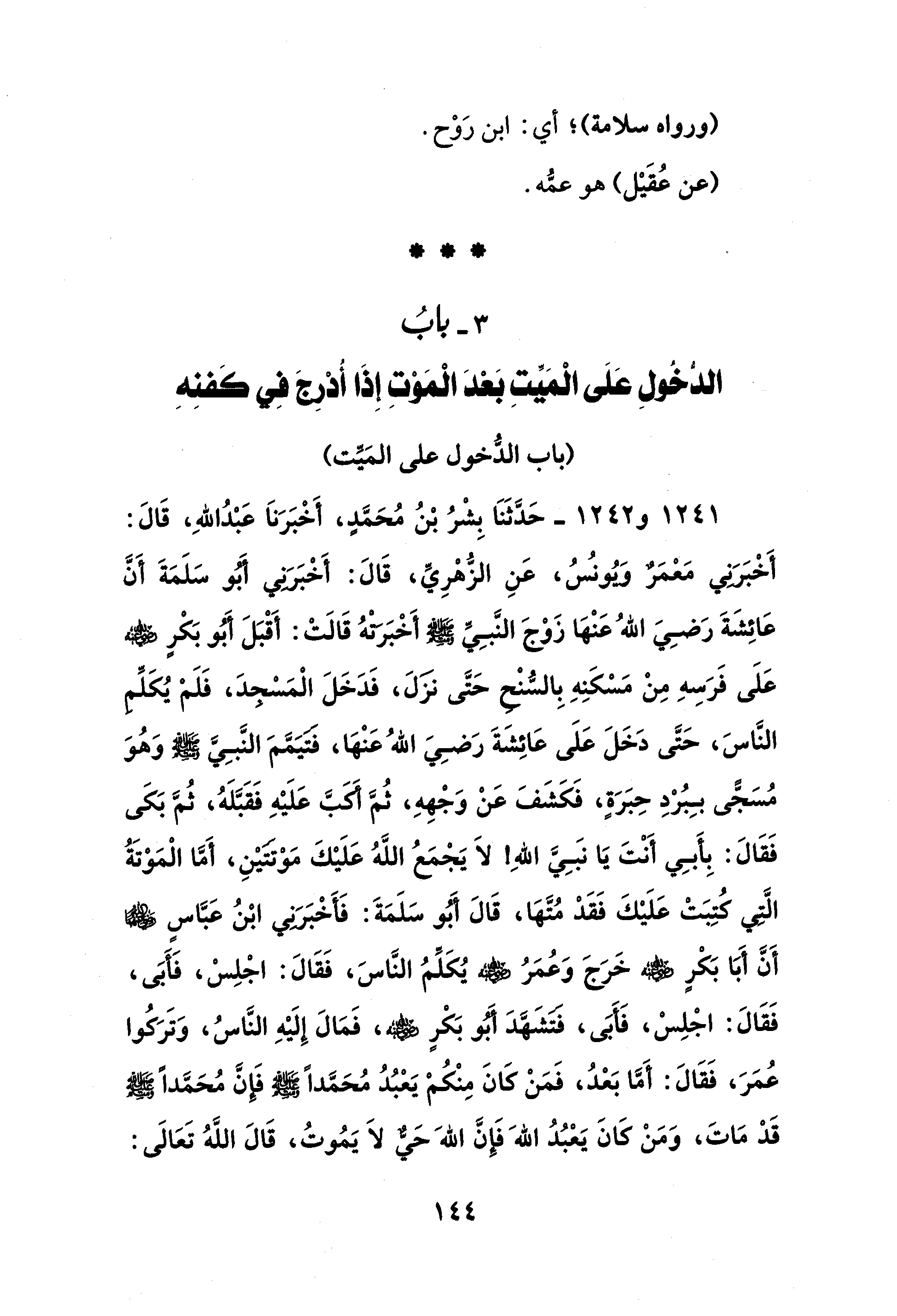 1241 - و 1242 - حَدَثَنَا بِشْرُ بْنُ مُحَمَّدٍ، أَخْبَرَناَ عَبْدُ اللهِ، قَالَ: أَخْبَرَنِي مَعْمَرٌ وَيُونُسُ، عَنِ الزُّهْرِيِّ، قَالَ: أَخْبَرَنِي أَبُو سَلَمَةَ أَنَّ عَائِشَةَ رَضِيَ اللهُ عَنْهَا زَوْجَ النَّبِيِّ - صلى الله عليه وسلم - أَخْبَرَتْهُ قَالَتْ: أَقْبَلَ أَبُو بَكْرٍ - رضي الله عنه - عَلَى فَرَسِهِ مِنْ مَسْكَنِهِ بِالسُّنْحِ حَتَّى نزَلَ، فَدَخَلَ الْمَسْجِدَ، فَلَمْ يُكَلِّمِ النَّاسَ، حَتَّى دَخَلَ عَلَى عَائِشَةَ رَضِيَ اللهُ عَنْهَا، فَتَيَمَّمَ النَّبِيَّ - صلى الله عليه وسلم - وَهُوَ مُسَجًّى بِبُرْدِ حِبَرَةٍ، فَكَشَفَ عَنْ وَجْهِهِ، ثُمَّ أَكَبَّ عَلَيْهِ فَقَبَّلَهُ، ثُمَّ بَكَى فَقَالَ: بِأَبِي أَنْتَ يَا نَبِيَّ اللهِ! لاَ يَجْمَعُ اللَّهُ عَلَيْكَ مَوْتَتَيْنِ، أَمَّا الْمَوْتَةُ الَّتِي كُتِبَتْ عَلَيْكَ فَقَدْ مُتَّهَا، قَالَ أَبُو سَلَمَةَ: فَأَخْبَرَنِي ابْنُ عَبَّاسٍ - رضي الله عنهما - أَنَّ أَبَا بَكْرٍ - رضي الله عنه - خَرَجَ وَعُمَرُ - رضي الله عنه - يُكَلِّمُ النَّاسَ، فَقَالَ: اجْلِسْ، فَأَبَى، فَقَالَ: اجْلِسْ، فَأَبَى، فَتَشَهَّدَ أَبُو بَكْرٍ - رضي الله عنه -، فَمَالَ إِلَيْهِ النَّاسُ، وَتَرَكُوا عُمَرَ، فَقَالَ: أَمَّا بَعْدُ، فَمَنْ كَانَ مِنْكُمْ يَعْبُدُ مُحَمَّدًا - صلى الله عليه وسلم - فَإِنَّ مُحَمَّدًا - صلى الله عليه وسلم - قَدْ مَاتَ، وَمَنْ كَانَ يَعْبُدُ اللهَ فَإِنَّ اللهَ حَيٌّ لاَ يَمُوتُ، قَالَ اللَّهُ تَعَالَى: