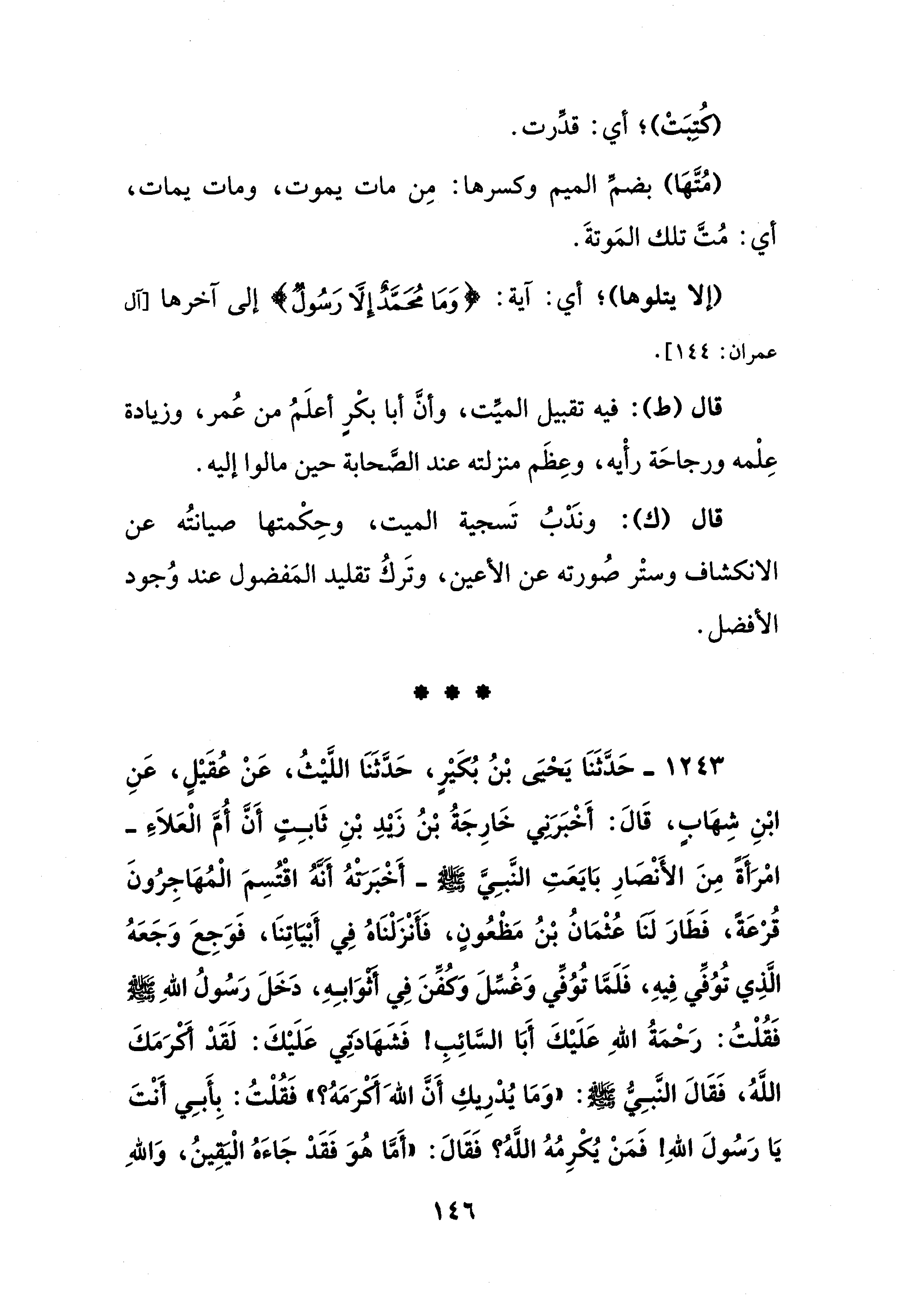 1243 - حَدَّثَنَا يَحْيَى بْنُ بُكَيْرٍ، حَدَّثَنَا اللَّيْثُ، عَنْ عُقَيْلٍ، عَنِ ابْنِ شِهَابٍ، قَالَ: أَخْبَرَنِي خَارِجَةُ بْنُ زيدِ بْنِ ثَابِتٍ أَنَّ أُمَّ الْعَلاَءِ -امْرَأَةً مِنَ الأَنْصَارِ بَايَعَتِ النَّبِيَّ - صلى الله عليه وسلم - أَخْبَرَتْهُ أَنَّهُ اقْتُسِمَ الْمُهَاجِرُونَ قُرْعَةً، فَطَارَ لَنَا عُثْمَانُ بْنُ مَظْعُونٍ، فَأَنْزَلْنَاهُ فِي أَبْيَاتِنَا، فَوَجِعَ وَجَعَهُ الَّذِي تُوُفِّي فِيهِ، فَلَمَّا تُوُفِّي وَغُسِّلَ وَكُفِّنَ فِي أَثْوَابِهِ، دَخَلَ رَسُولُ اللهِ - صلى الله عليه وسلم - فَقُلْتُ: رَحْمَةُ اللهِ عَلَيْكَ أَبَا السَّائِبِ! فَشَهَادَتِي عَلَيْكَ: لَقَدْ أَكْرَمَكَ اللَّهُ، فَقَالَ النَّبِيُّ - صلى الله عليه وسلم -: "وَمَا يُدْرِيكِ أَنَّ اللهَ أَكْرَمَهُ؟ " فَقُلْتُ: بِأَبِي أَنْتَ يَا رَسُولَ اللهِ! فَمَنْ يُكرِمُهُ اللَّهُ؟ فَقَالَ: "أَمَّا هُوَ فَقَدْ جَاءَهُ الْيَقِينُ، وَاللهِ