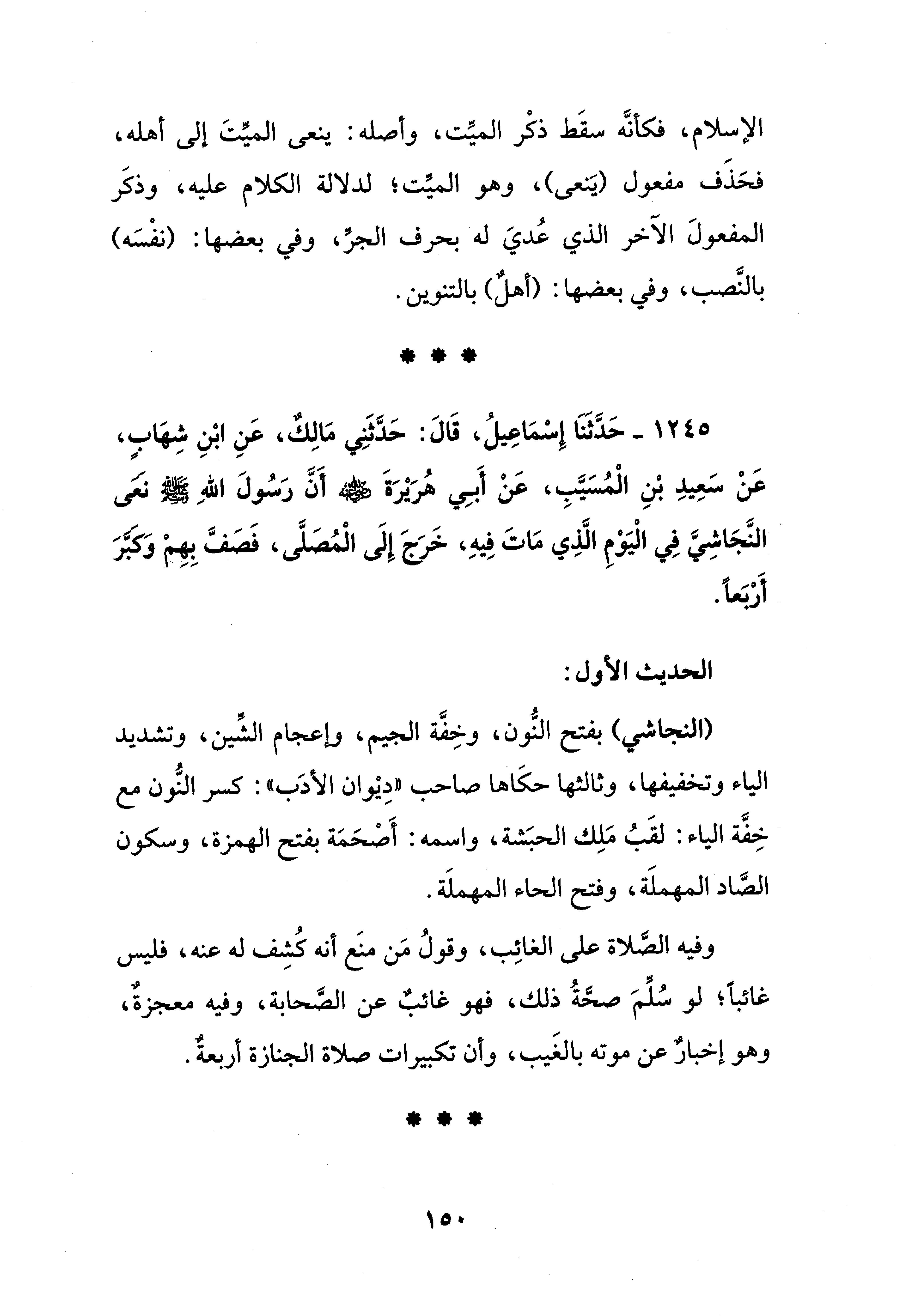 1245 - حَدَّثَنَا إِسْمَاعِيلُ، قَالَ: حَدَّثَنِي مَالِكٌ، عَنِ ابْنِ شِهَابٍ، عَنْ سَعِيدِ بْنِ الْمُسَيَّبِ، عَنْ أَبِي هُرَيْرَةَ - رضي الله عنه - أَنَّ رَسُولَ اللهِ - صلى الله عليه وسلم - نَعَى النَّجَاشِيَّ فِي الْيَوْمِ الَّذِي مَاتَ فِيهِ، خَرَجَ إِلَى الْمُصَلَّى، فَصَفَّ بِهِمْ وَكَبَّرَ أَرْبَعًا.
