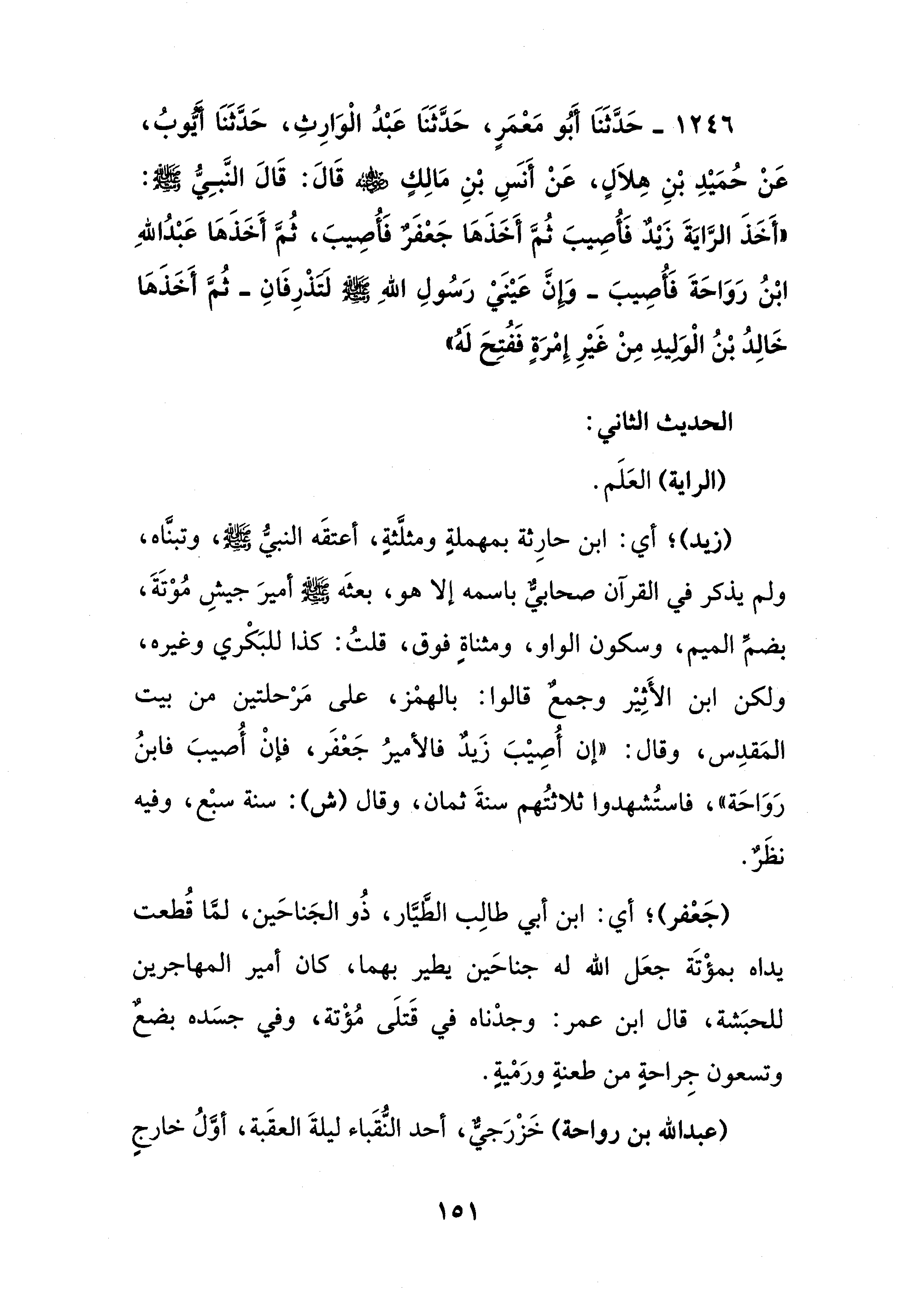 1246 - حَدَّثَنَا أَبُو مَعْمَرٍ، حَدَّثَنَا عَبْدُ الْوَارِثِ، حَدَّثَنَا أَيُّوبُ، عَنْ حُمَيْدِ بْنِ هِلاَلٍ، عَنْ أَنَسَ بْنِ مَالِكٍ - رضي الله عنه - قَالَ: قَالَ النَّبِيُّ - صلى الله عليه وسلم -: "أَخَذَ الرَّايَةَ زَيْدٌ فَأُصِيبَ ثُمَّ أَخَذَهَا جَعْفَرٌ فَأُصِيبَ، ثُمَّ أَخَذَهَا عَبْدُ اللهِ ابْنُ رَوَاحَةَ فَأُصِيبَ -وَإِنَّ عَيْنَيْ رَسُولِ اللهِ - صلى الله عليه وسلم - لَتَذْرِفَانِ- ثُمَّ أَخَذَهَا خَالِدُ بْنُ الْوَلِيدِ مِنْ غَيْرِ إِمْرَةٍ فَفُتِحَ لَهُ"