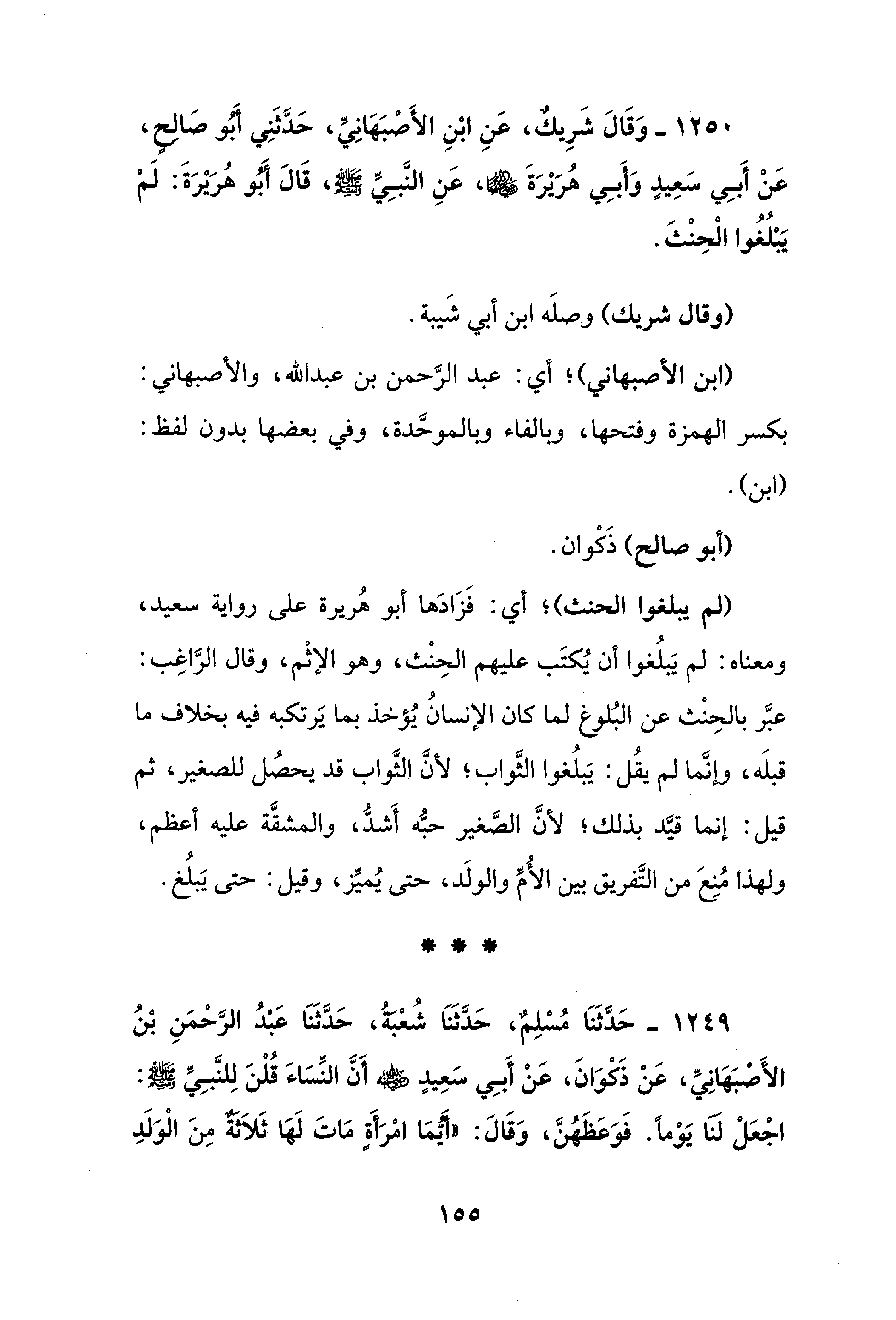 1250 - وَقَالَ شَرِيكٌ، عَنِ ابْنِ الأَصْبَهَانِيِّ، حَدَّثَنِي أَبُو صَالِحٍ، عَنْ أَبِي سَعِيدٍ وَأَبِي هُرَيْرَةَ - رضي الله عنه -، عَنِ النَّبِيِّ - صلى الله عليه وسلم -، قَالَ أَبُو هُرَيْرَةَ: لَمْ يَبْلُغُوا الْحِنْثَ.