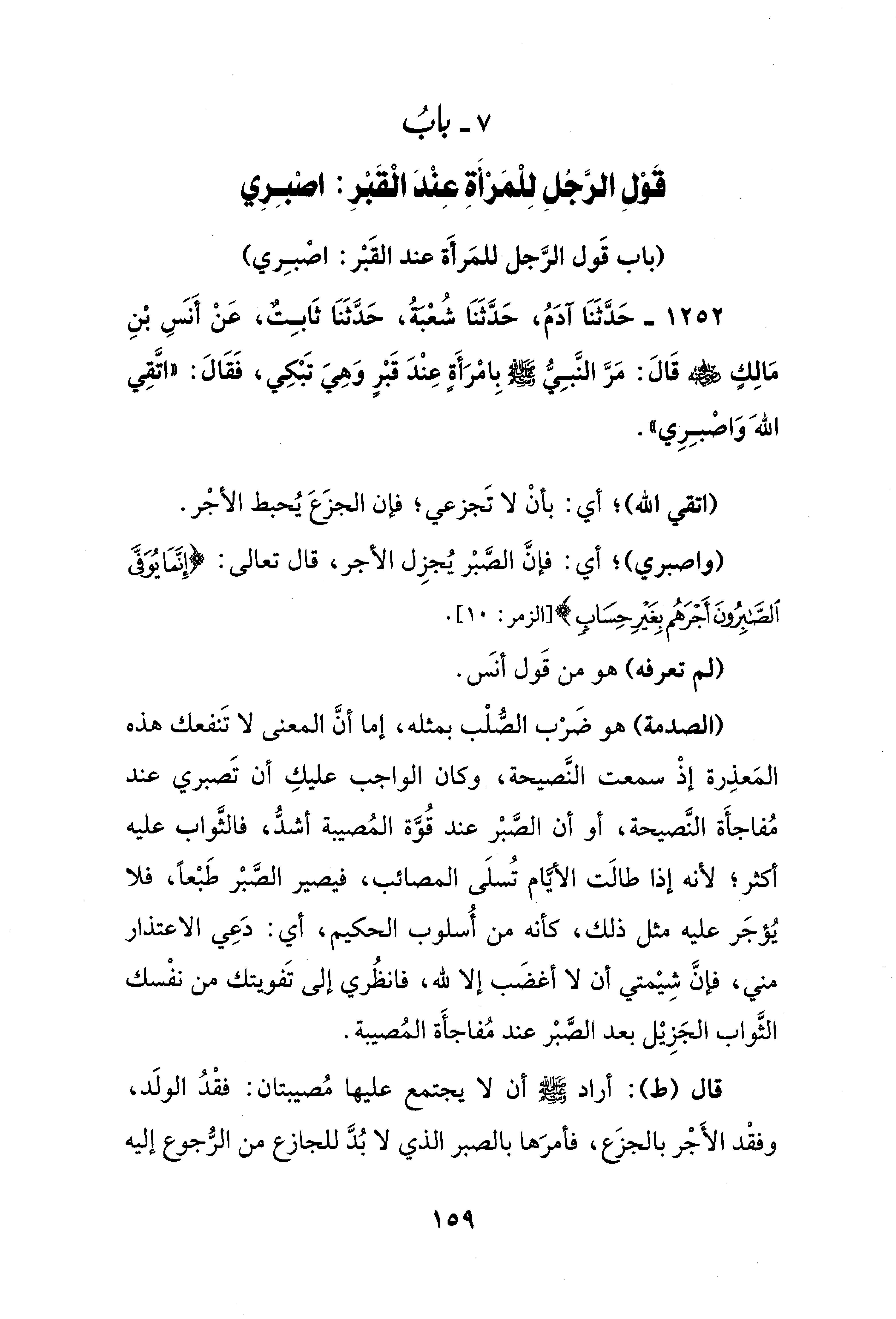 1252 - حَدَّثَنَا آدَمُ، حَدَّثَنَا شُعْبَةُ، حَدَّثَنَا ثَابِتٌ، عَنْ أَنَسِ بْنِ مَالِكٍ - رضي الله عنه - قَالَ: مَرَّ النَّبِيُّ - صلى الله عليه وسلم - بِامْرَأَةٍ عِنْدَ قَبْرٍ وَهِيَ تَبْكِي، فَقَالَ: "اتَّقِي اللهَ وَاصْبِرِي".