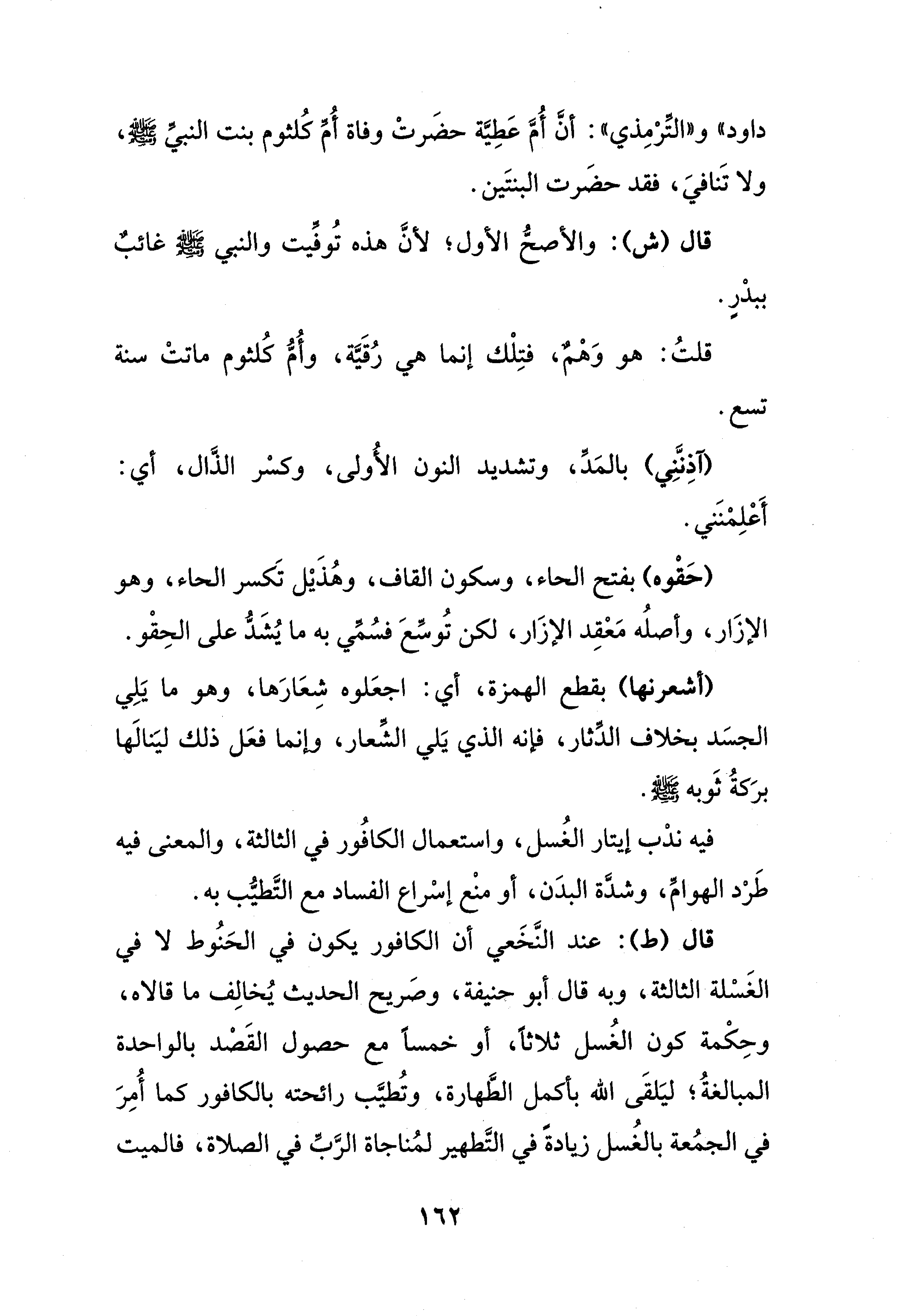 داود" و "التِّرْمِذي": أنَّ أُمَّ عَطِيَّة حضَرتْ وفاة أُمِّ كُلثوم بنت النبيِّ - صلى الله عليه وسلم -، ولا تَنافيَ، فقد حضَرت البنتَين.