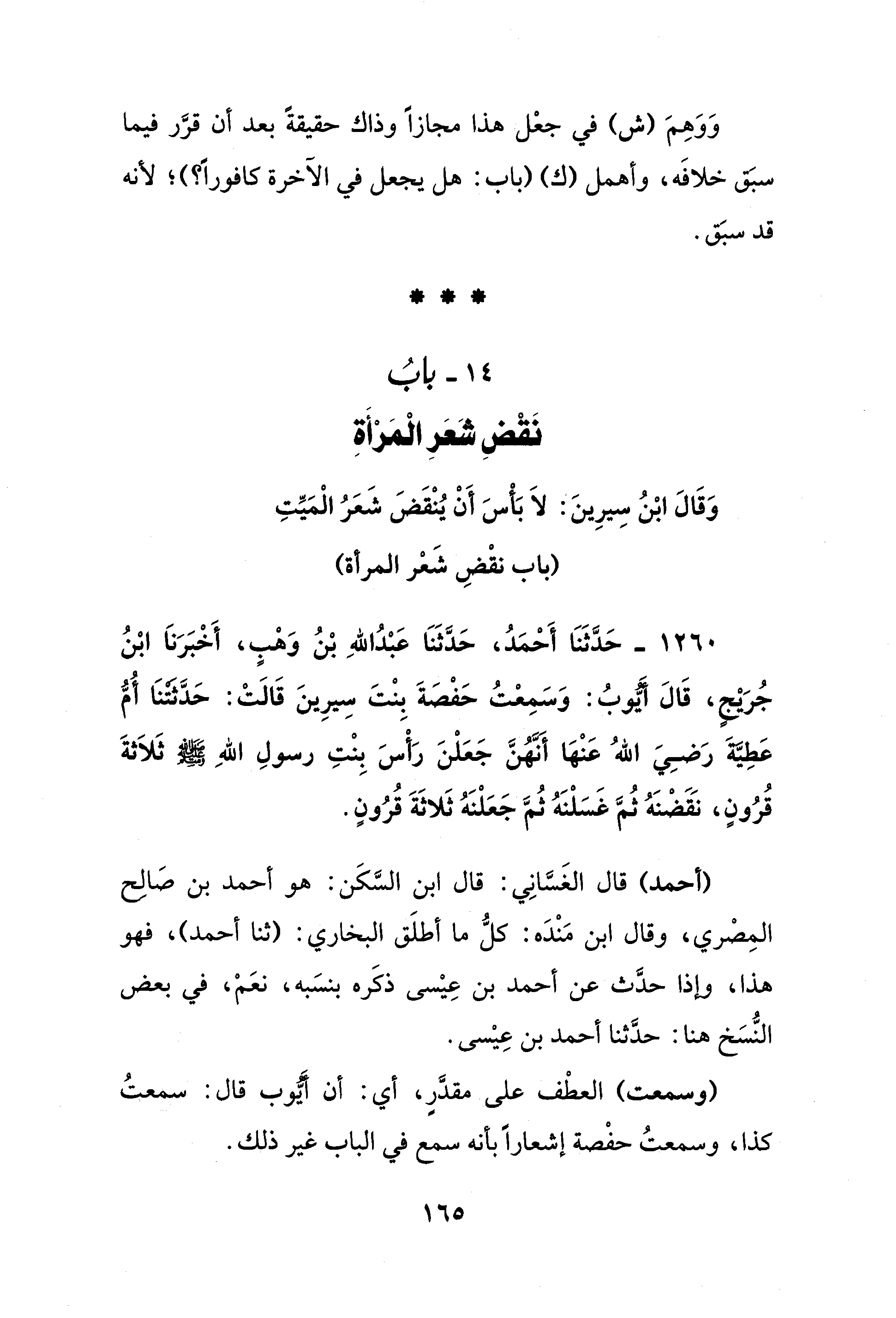 1260 - حَدَّثَنَا أَحْمَدُ، حَدَّثَنَا عَبْدُ اللهِ بْنُ وَهْبٍ، أَخْبَرَناَ ابْنُ جُرَيْجٍ، قَالَ أَيُّوبُ: وَسَمِعْتُ حَفْصَةَ بِنْتَ سِيرِينَ قَالَتْ: حَدَّثَتْنَا أُمُّ عَطِيَّةَ رَضِيَ اللهُ عَنْهَا أَنَّهُنَّ جَعَلْنَ رَأْسَ بِنْتِ رسولِ اللهِ - صلى الله عليه وسلم - ثَلاَثةَ قُرُونٍ، نَقَضْنَهُ ثُمَّ غَسَلْنَهُ ثُمَّ جَعَلْنَهُ ثَلاثَةَ قُرُونٍ.