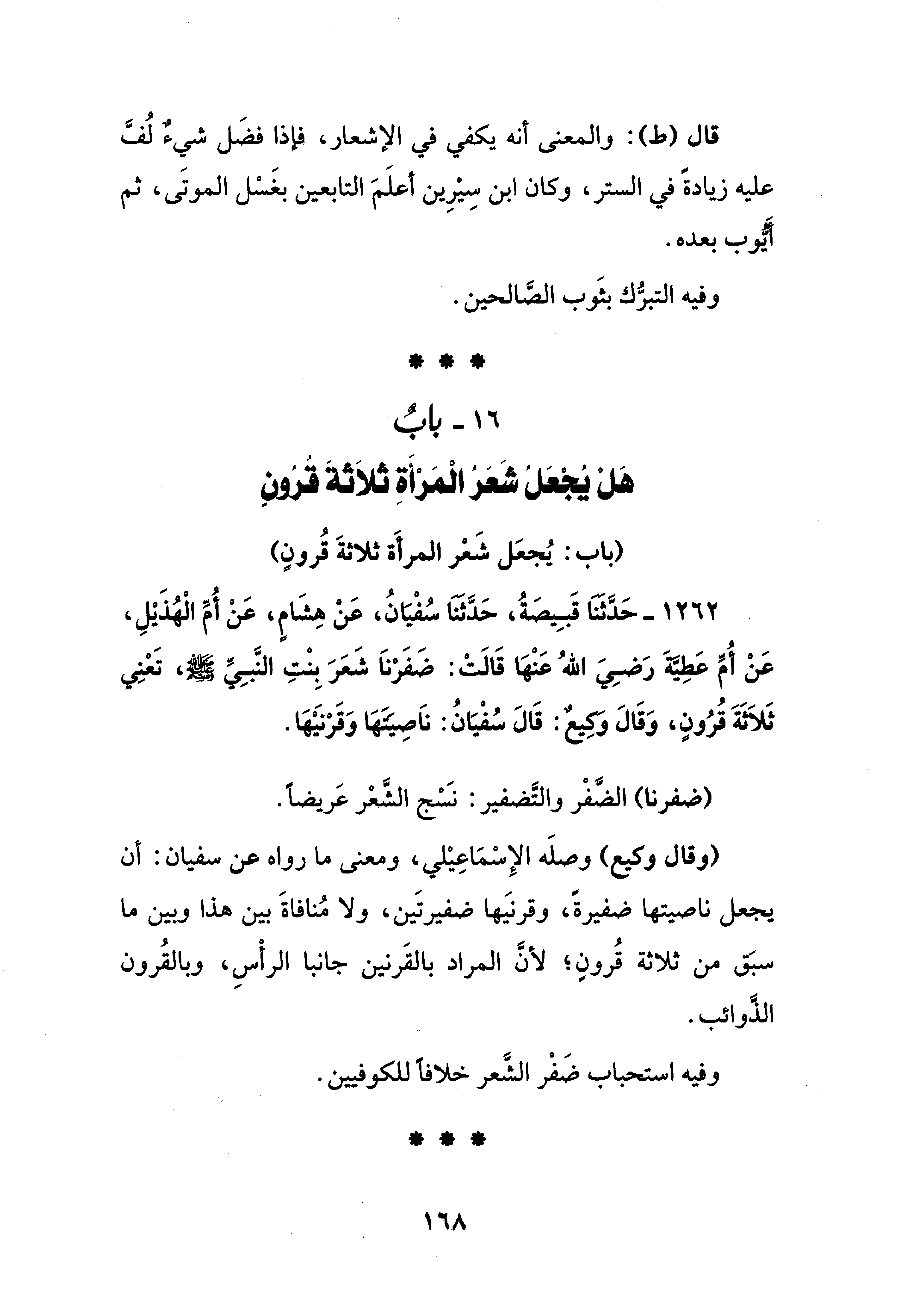 16 - بابٌ هَلْ يُجْعَلُ شَعَرُ الْمَرْأَةِ ثلاَثةَ قُرُونِ