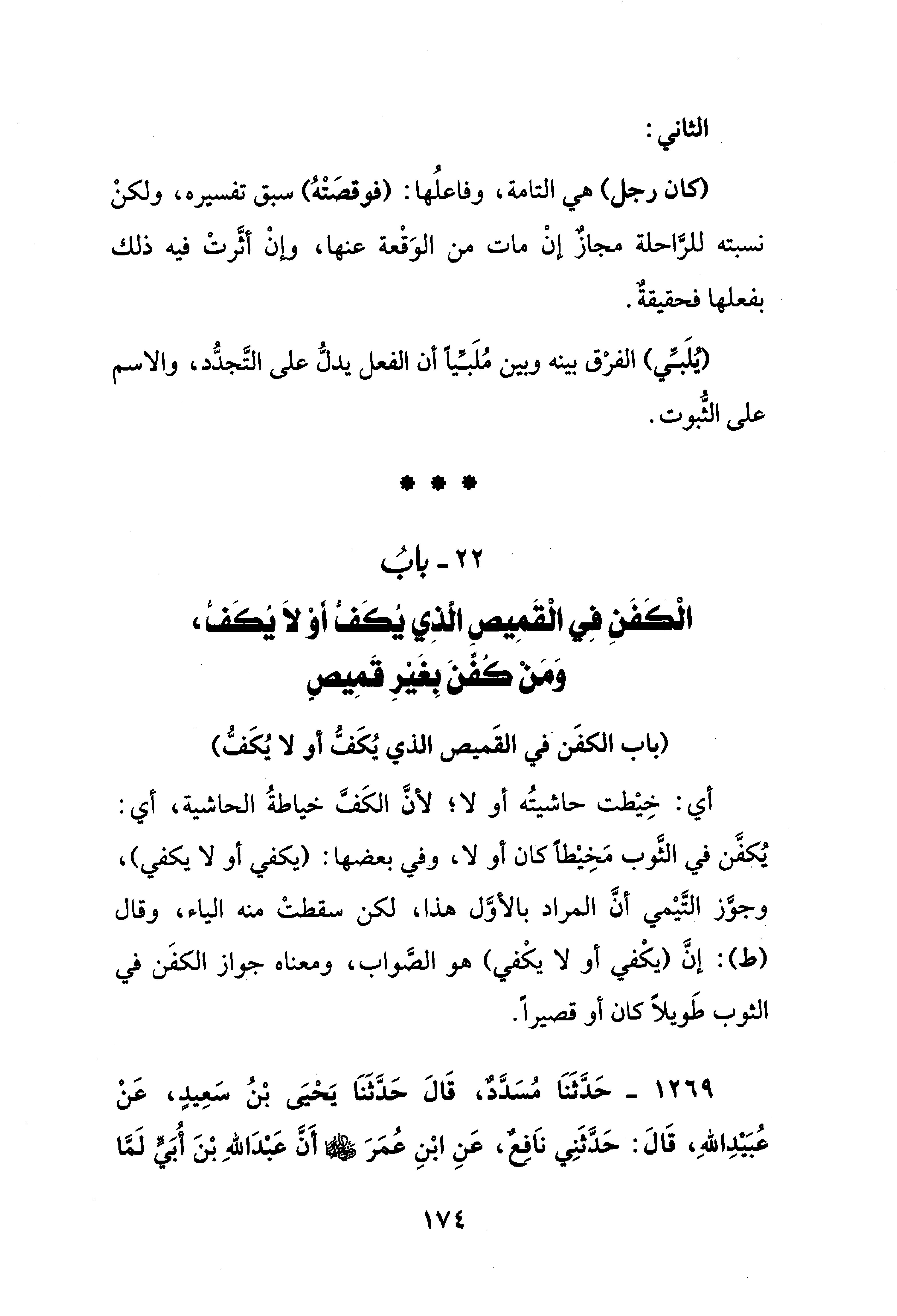 22 - بابُ الْكَفَنِ فِي الْقَميِصِ الَّذِي يُكَفُّ أوْ لاَ يُكَفُّ، وَمَنْ كُفِّنَ بِغَيْرِ قَمِيصِ