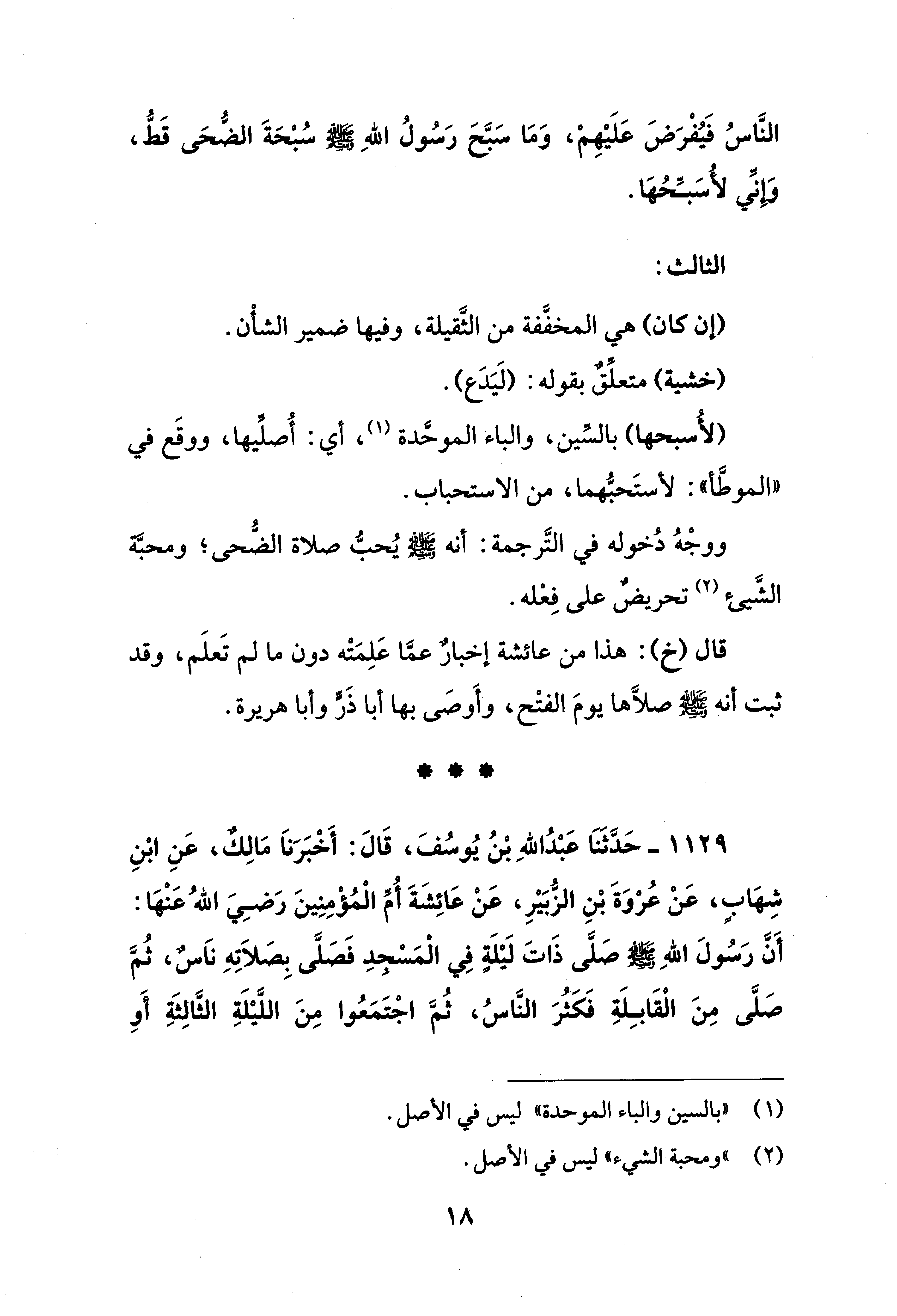 1129 - حَدَّثَنَا عَبْدُ اللهِ بْنُ يُوسُفَ، قَالَ: أَخْبَرَناَ مَالِكٌ، عَنِ ابْنِ شِهَابٍ، عَنْ عُرْوَةَ بْنِ الزُّبَيْرِ، عَنْ عَائِشَةَ أُمِّ الْمُؤْمِنِينَ رَضِيَ اللهُ عَنْهَا: أَنَّ رَسُولَ اللهِ - صلى الله عليه وسلم - صَلى ذَاتَ لَيْلَةٍ فِي الْمَسْجدِ فَصَلى بِصَلاَتِهِ ناَسٌ، ثُمَّ صَلَّى مِنَ الْقَابِلَةِ فَكَثُرَ الناسُ، ثُمَ اجْتَمَعُوا مِنَ اللَّيْلَةِ الثَّالِثَةِ أَوِ