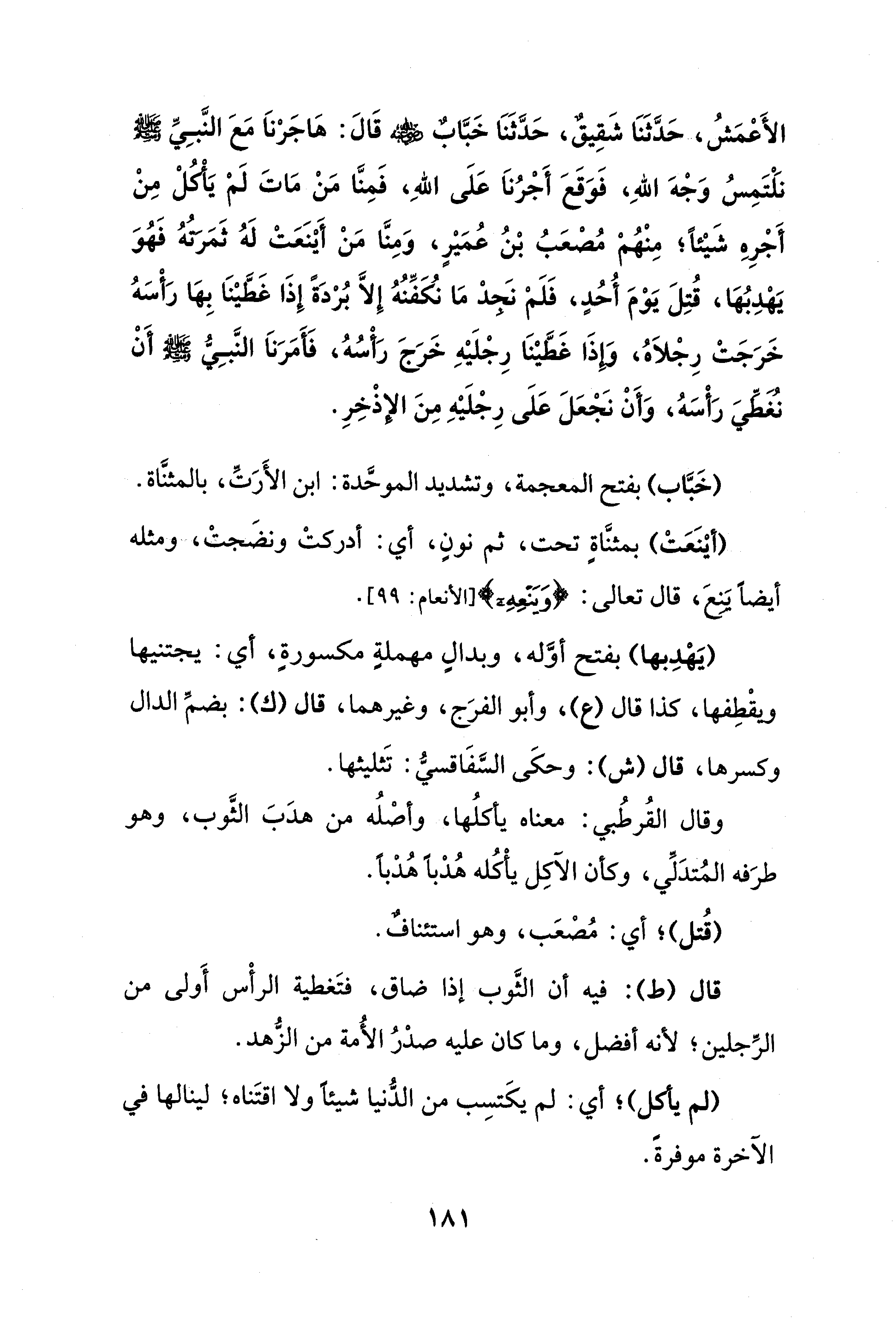 الأَعْمَشُ، حَدَّثَنَا شَقِيقٌ، حَدَّثَنَا خَبَّابٌ - رضي الله عنه - قَالَ: هَاجَرْناَ مَعَ النَّبِيِّ - صلى الله عليه وسلم - نَلْتَمِسُ وَجْهَ اللهِ، فَوَقَعَ أَجْرُناَ عَلَى اللهِ، فَمِنَّا مَنْ مَاتَ لَمْ يَأْكُلْ مِنْ أَجْرِهِ شَيْئًا؛ مِنْهُمْ مُصْعَبُ بْنُ عُمَيْرٍ، وَمِنَّا مَنْ أَيْنَعَتْ لَهُ ثَمَرَتُهُ فَهُوَ يَهْدِبُهَا، قُتِلَ يَوْمَ أُحُدٍ، فَلَمْ نَجِدْ مَا نُكَفِّنُهُ إِلَّا بُرْدَةً إِذَا غَطَّيْنَا بِهَا رَأْسَهُ خَرَجَتْ رِجْلاَهُ، وَإِذَا غَطَّيْنَا رِجْلَيهِ خَرَجَ رَأْسُهُ، فَأَمَرَناَ النَّبِيُّ - صلى الله عليه وسلم - أَنْ نُغَطِّيَ رَأْسَهُ، وَأَنْ نَجْعَلَ عَلَى رِجْلَيْهِ مِنَ الإِذْخِرِ.