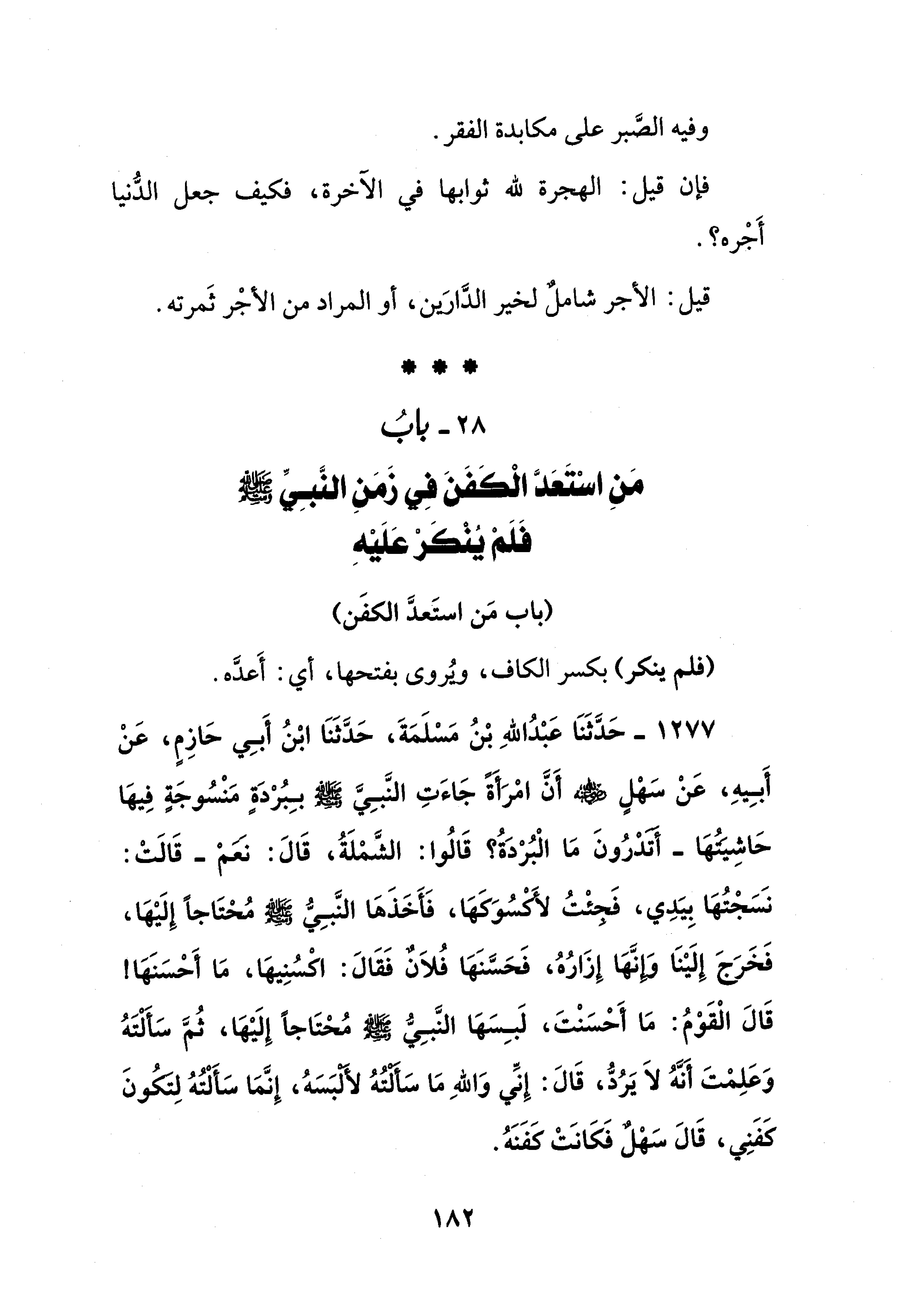 1277 - حَدَّثَنَا عَبْدُ اللهِ بْنُ مَسْلَمَةَ، حَدَّثَنَا ابْنُ أَبِي حَازِمٍ، عَنْ أَبِيهِ، عَنْ سَهْلٍ - رضي الله عنه - أَنَّ امْرَأَةً جَاءَتِ النَّبِيَّ - صلى الله عليه وسلم - بِبُرْدَةٍ مَنْسُوجَةٍ فِيهَا حَاشِيَتُهَا -أَتَدْرُونَ مَا الْبُرْدَةُ؟ قَالُوا: الشَّمْلَةُ، قَالَ: نَعَمْ- قَالَتْ: نَسَجْتُهَا بِيَدِي، فَجِئْتُ لأَكْسُوَكَهَا، فَأَخَذَهَا النَّبِيُّ - صلى الله عليه وسلم - مُحْتَاجًا إِلَيْهَا، فَخَرَجَ إِلَيْنَا وَإِنَّهَا إِزَارُهُ، فَحَسَّنَهَا فُلاَنٌ فَقَالَ: اكْسُنِيهَا، مَا أَحْسَنَهَا! قَالَ الْقَوْمُ: مَا أَحْسَنْتَ، لَبِسَهَا النَّبِيُّ - صلى الله عليه وسلم - مُحْتَاجًا إِلَيْهَا، ثُمَّ سَأَلْتَهُ وَعَلِمْتَ أَنَّهُ لاَ يَرُدُّ، قَالَ: إِنِّي وَاللهِ مَا سَأَلْتُهُ لأَلْبَسَهُ، إِنَّمَا سَأَلْتُهُ لِتَكُونَ كَفَنِي، قَالَ سَهْلٌ فَكَانَتْ كَفَنَهُ.