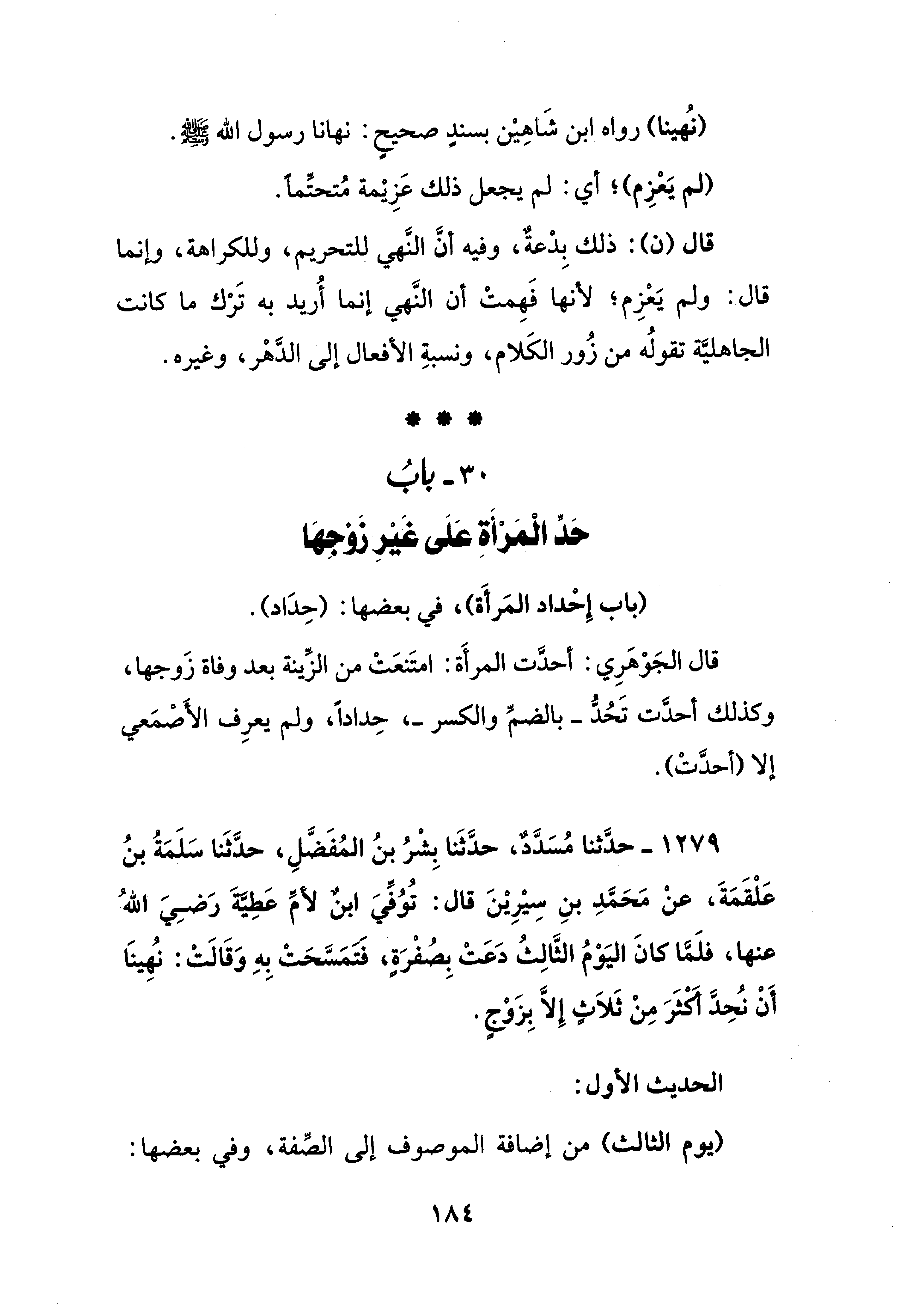 1279 - حدَّثنا مُسَدَّدٌ، حدَّثَنا بِشْرُ بنُ المُفَضَّلِ، حدَّثَنا سَلَمَةُ بنُ عَلْقَمَةَ، عنْ مَحَمَّدِ بنِ سِيْرِيْنَ قال: تُوُفِّيَ ابنٌ لأمِّ عَطِيَّةَ رَضِيَ اللهُ عنها، فلَمَّا كانَ اليَوْمُ الثَّالِثُ دَعَتْ بِصُفْرَةٍ، فَتَمَسَّحَتْ بِهِ وَقَالَتْ: نُهِينَا أَنْ نُحِدَّ أَكْثَرَ مِنْ ثَلاَثٍ إِلَّا بِزَوْجٍ.