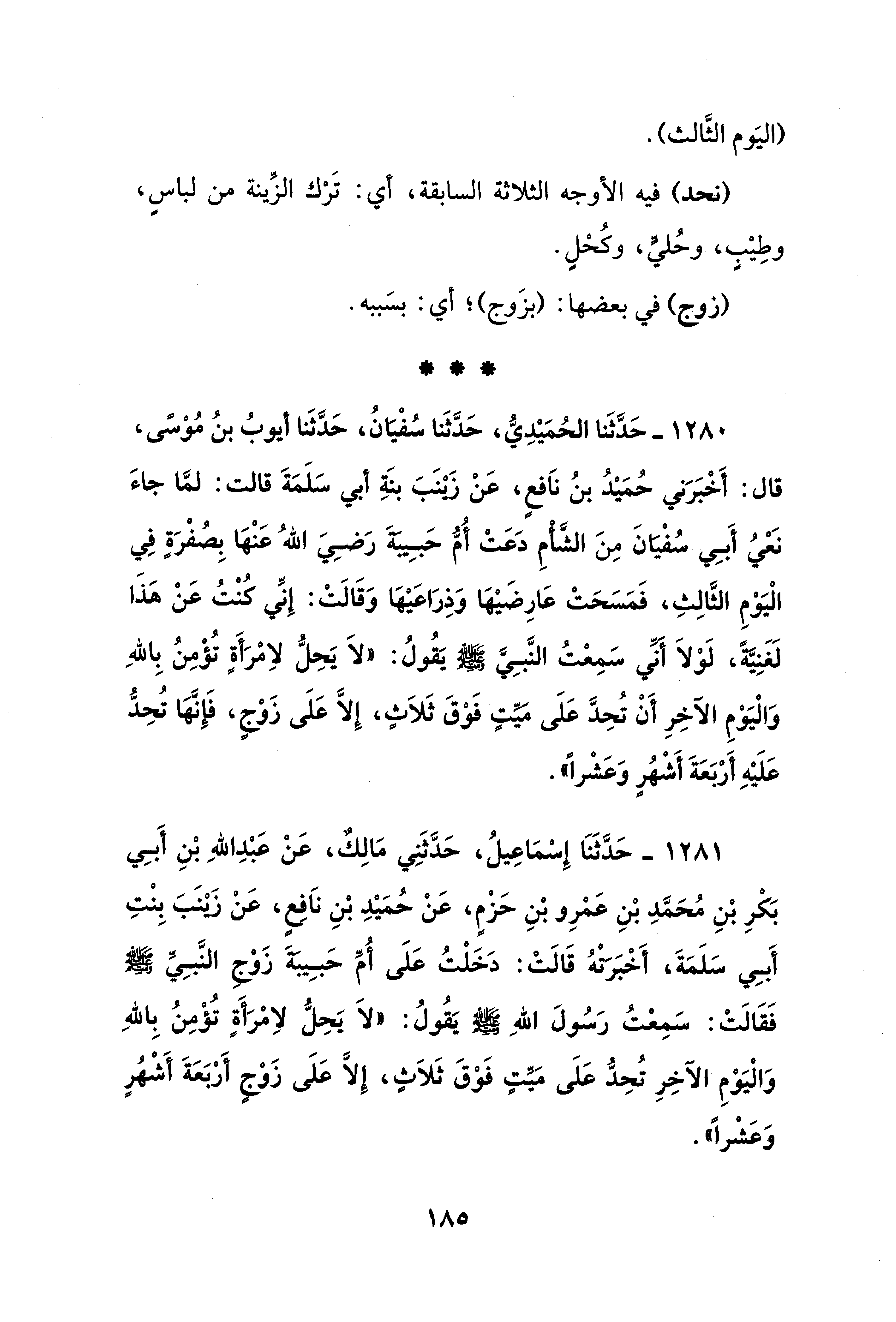 1280 - حَدَّثَنا الحُمَيْدِيُّ، حَدَّثَنا سُفْيَانُ، حَدَّثَنا أيوبُ بنُ مُوْسى، قال: أَخْبَرَني حُمَيْدُ بنُ نَافعٍ، عَنْ زيْنَبَ بنَةِ أبي سَلَمَةَ قالت: لمَّا جاءَ نَعْيُ أَبِي سُفْيَانَ مِنَ الشَّأْمِ دَعَتْ أُمُّ حَبِيبَةَ رَضِيَ اللهُ عَنْهَا بِصُفْرَةٍ فِي الْيَوْمِ الثَّالِثِ، فَمَسَحَتْ عَارِضَيْهَا وَذِرَاعَيْهَا وَقَالَتْ: إِنِّي كُنْتُ عَنْ هَذَا لَغَنِيَّةً، لَوْلاَ أَنِّي سَمِعْتُ النَّبِيَّ - صلى الله عليه وسلم - يَقُولُ: "لاَ يَحِلُّ لاِمْرَأَةٍ تُؤْمِنُ بِاللهِ وَالْيَوْمِ الآخِرِ أَنْ تُحِدَّ عَلَى مَيِّتٍ فَوْقَ ثَلاَثٍ، إِلَّا عَلَى زَوْجٍ، فَإِنَّهَا تُحِدُّ عَلَيْهِ أَرْبَعَةَ أَشْهُرٍ وَعَشْرًا".