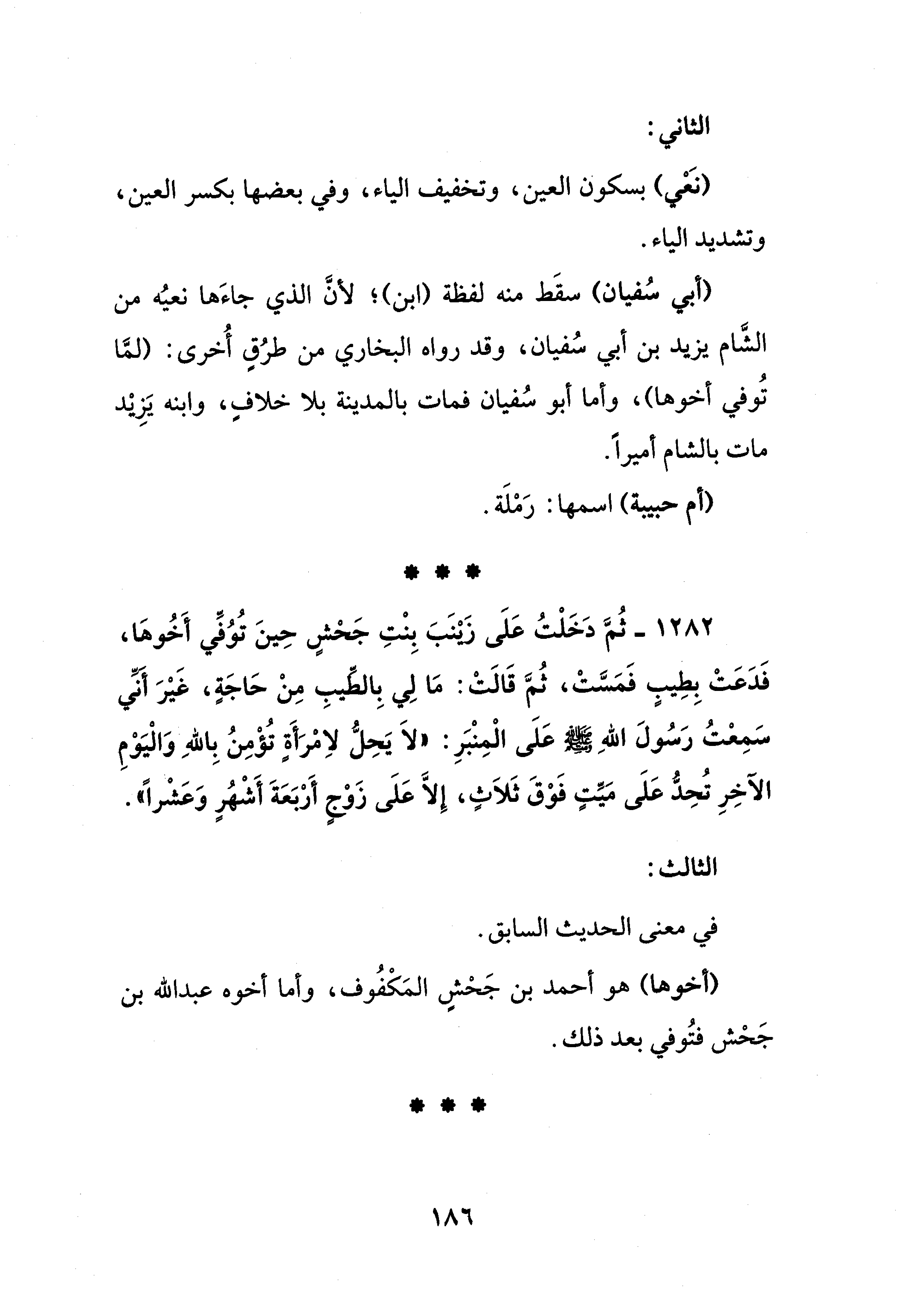 1282 - ثُمَّ دَخَلْتُ عَلَى زينَبَ بِنْتِ جَحْشٍ حِينَ تُوُفِّي أَخُوهَا، فَدَعَتْ بِطِيبٍ فَمَسَّتْ، ثُمَّ قَالَتْ: مَا لِي بِالطِّيبِ مِنْ حَاجَةٍ، غَيْرَ أَنِّي سَمِعْتُ رَسُولَ اللهِ - صلى الله عليه وسلم - عَلَى الْمِنْبَرِ: "لاَ يَحِلُّ لاِمْرَأَةٍ تُؤْمِنُ بِاللهِ وَالْيَوْمِ الآخِرِ تُحِدُّ عَلَى مَيِّتٍ فَوْقَ ثَلاَثٍ، إِلَّا عَلَى زَوْجٍ أَرْبَعَةَ أَشْهُرٍ وَعَشْرًا".