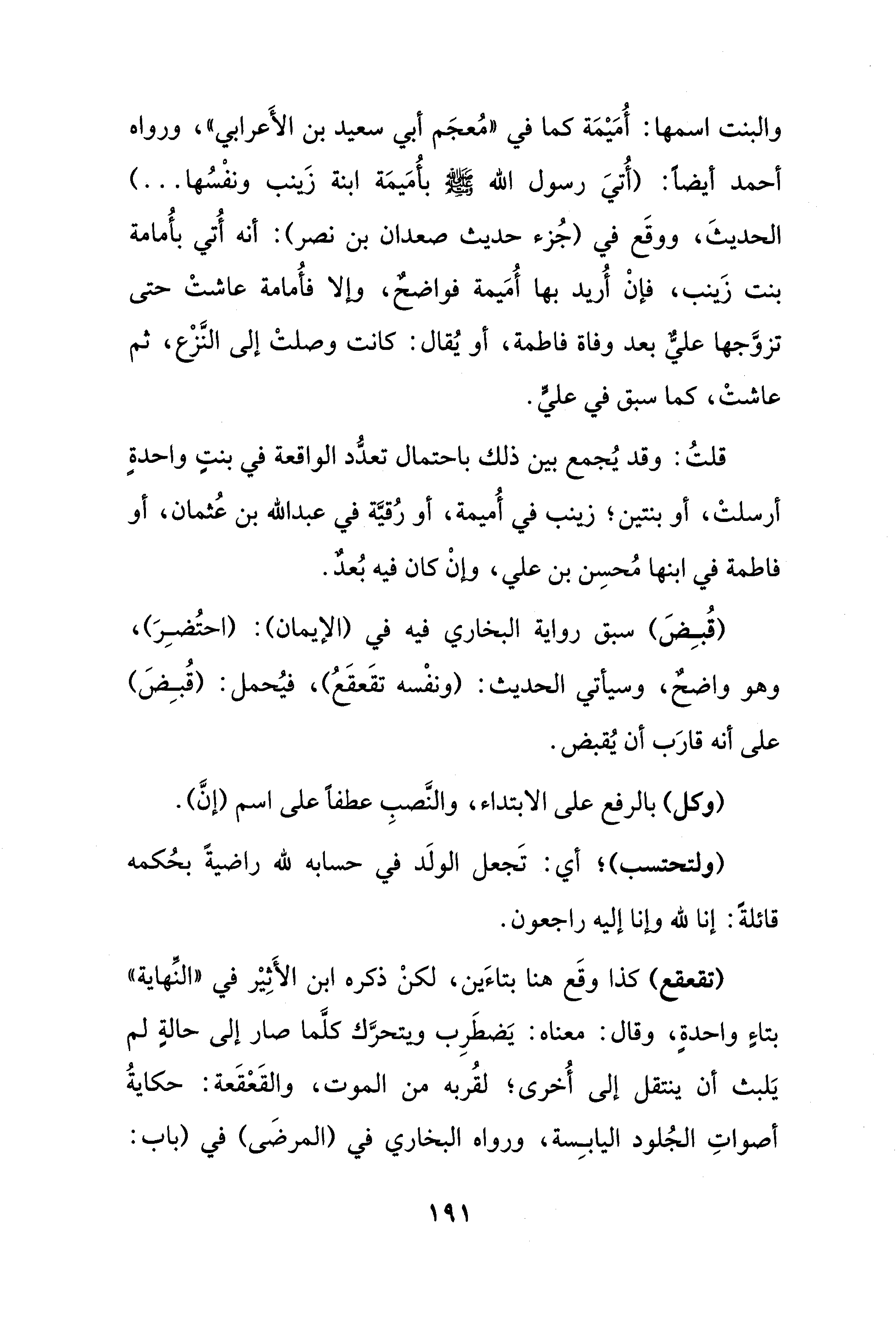 والبنت اسمها: أُمَيْمَة كما في "مُعجَم أبي سعيد بن الأَعرابي" ورواه أحمد أيضًا: (أُتيَ رسول الله - صلى الله عليه وسلم - بأُمَيمَة ابنة زَينب ونفْسُها ...) الحديثَ، ووقَع في (جُزء حديث صعدان بن نصر): أنه أُتي بأُمامة بنت زَينب، فإنْ أُريد بها أُمَيمة فواضحٌ، وإلا فأُمامة عاشتْ حتى تزوَّجها عليٌّ بعد وفاة فاطمة، أو يُقال: كانت وصلتْ إلى النَّزْع، ثم عاشتْ، كما سبق في عليٍّ.