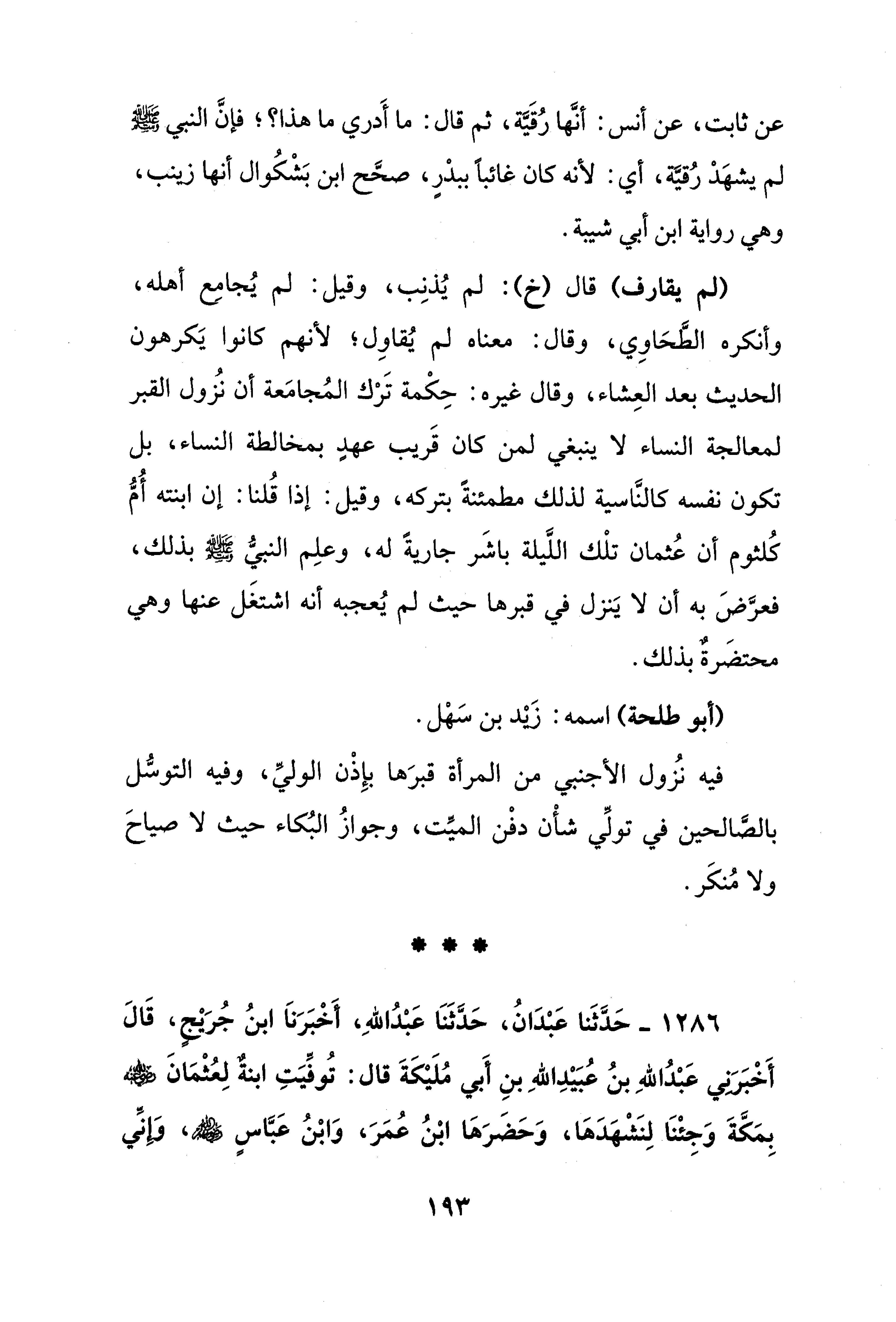 عن ثابت، عن أنس: أنَّها رُقَيَّة، ثم قال: ما أَدري ما هذا؟، فإنَّ النبي - صلى الله عليه وسلم - لم يشهَدْ رُقيَّة، أي: لأنه كان غائبًا ببدْرٍ، صحَّح ابن بَشْكُوال أنها زينب، وهي رواية ابن أبي شيبة.