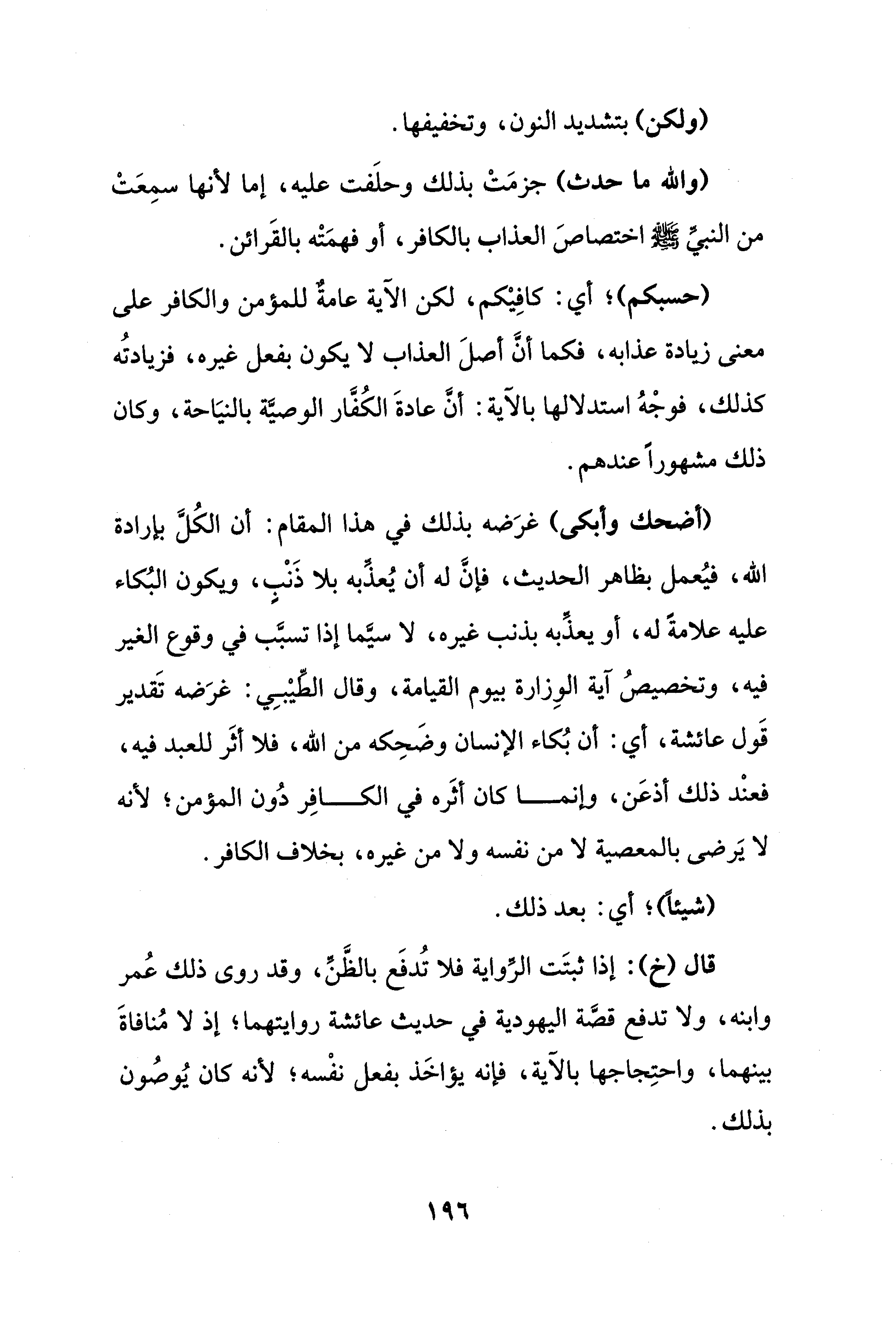 (أضحك وأبكى) غرَضه بذلك في هذا المقام: أن الكُلَّ بإرادة الله، فيُعمل بظاهر الحديث، فإنَّ له أن يُعذِّبه بلا ذَنْبٍ، ويكون البُكاء عليه علامةً له، أو يعذِّبه بذنب غيره، لا سيَّما إذا تسبَّب في وقوع الغير فيه، وتخصيصُ آية الوِزارة بيوم القيامة، وقال الطِّيْبِي: غرَضه تَقدير قَول عائشة، أي: أن بُكاء الإنسان وضَحِكه من الله، فلا أثَر للعبد فيه، فعنْد ذلك أذعَن، وإنما كان أثَره في الكافِر دُون المؤمن، لأنه لا يَرضى بالمعصية لا من نفسه ولا من غيره، بخلاف الكافر.