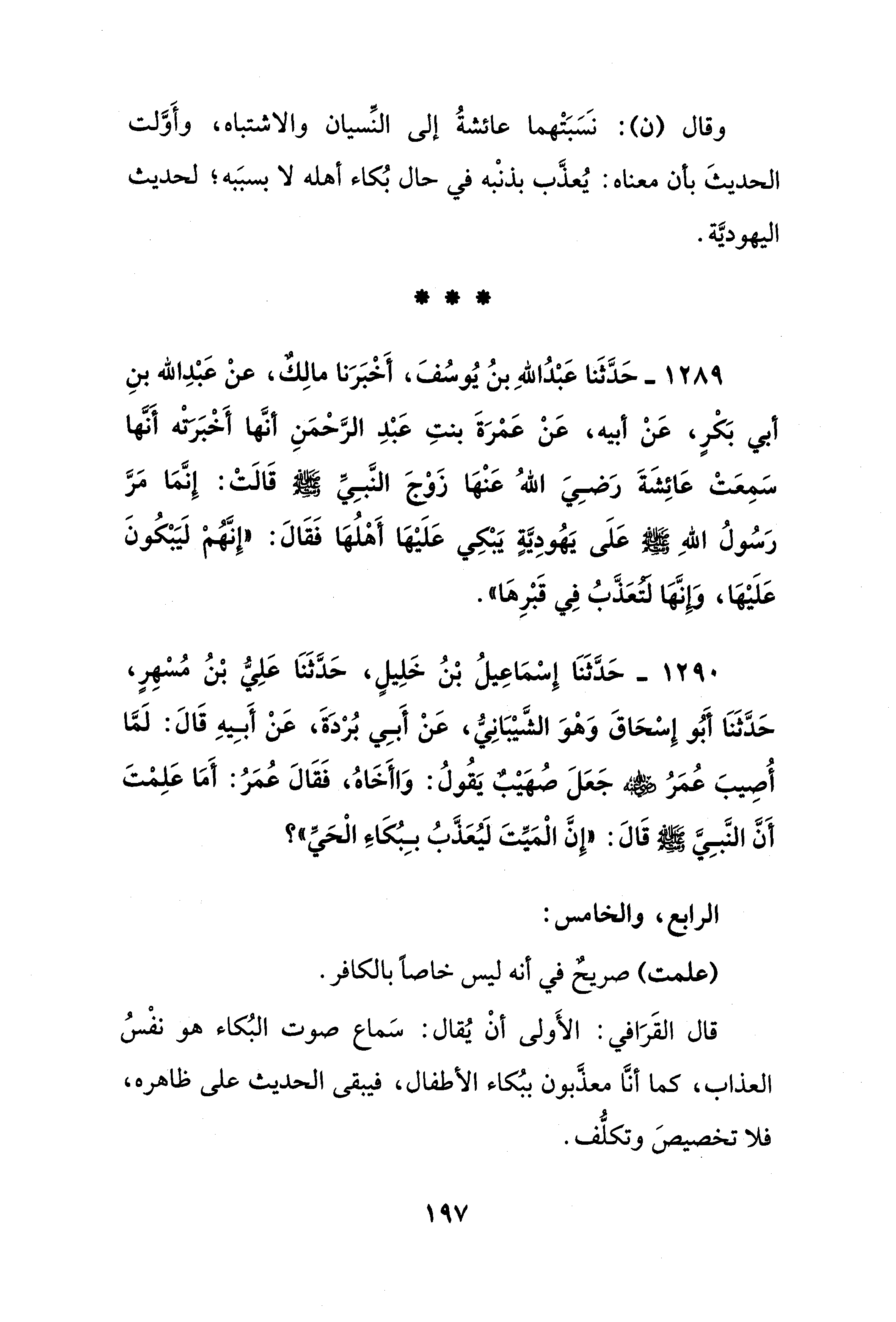 1289 - حَدَّثَنا عَبْدُ اللهِ بنُ يُوسُفَ، أَخْبَرَنا مالِكٌ، عنْ عَبْدِ الله بنِ أبي بَكْرٍ، عَنْ أبيه، عَنْ عَمْرَةَ بنتِ عَبْدِ الرَّحْمَنِ أنَّها أَخْبَرتْه أَنَّها سَمِعَتْ عَائِشَةَ رَضِيَ اللهُ عَنْهَا زَوْجَ النَّبِيِّ - صلى الله عليه وسلم - قَالَتْ: إِنَّمَا مَرَّ رَسُولُ اللهِ - صلى الله عليه وسلم - عَلَى يَهُودِيَّةٍ يَبْكِي عَلَيْهَا أَهْلُهَا فَقَالَ: "إِنَّهُمْ لَيَبْكُونَ عَلَيْهَا، وَإِنَّهَا لَتُعَذَّبُ فِي قَبْرِهَا".