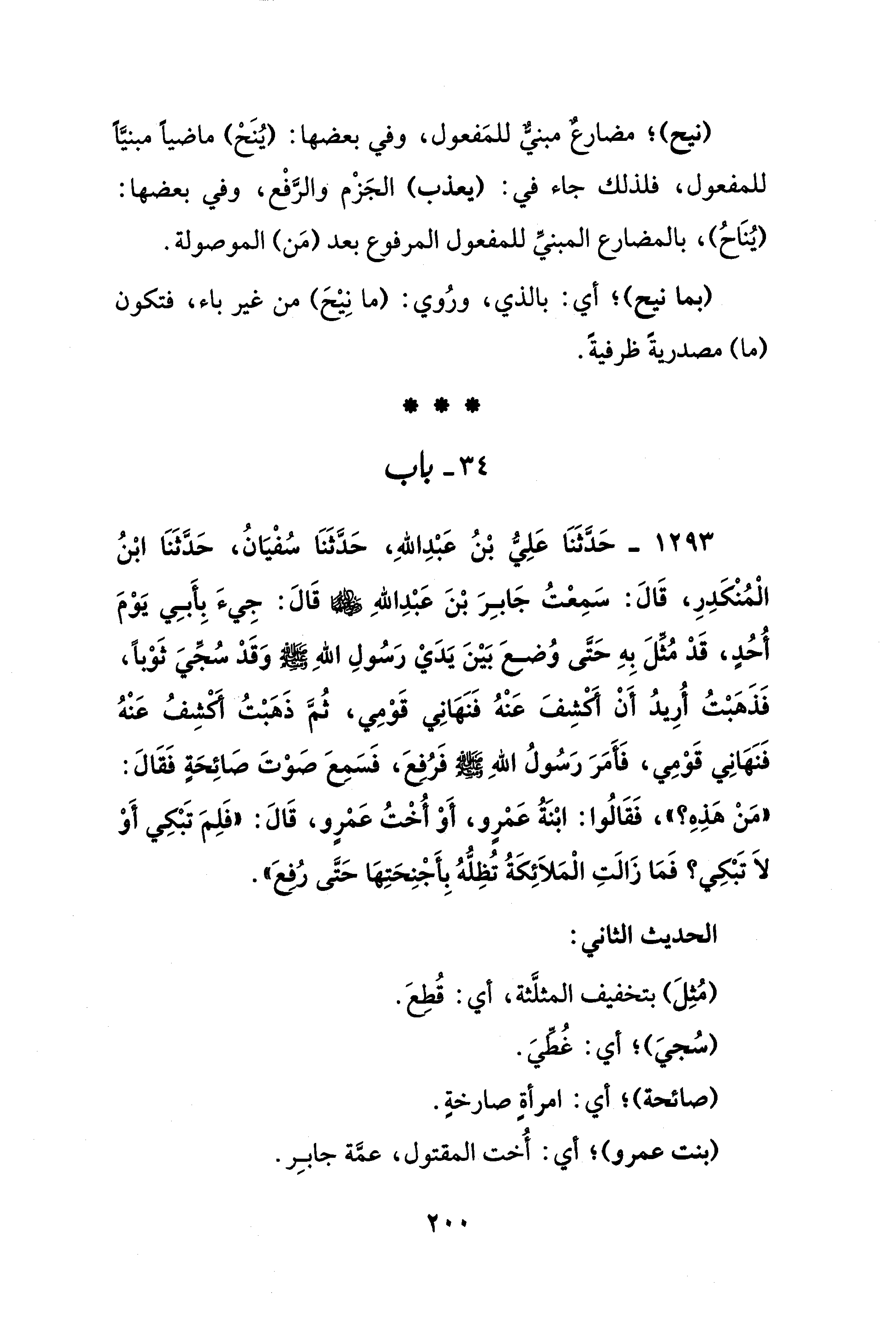 1293 - حَدَّثَنَا عَلِيُّ بْنُ عَبْدِ اللهِ، حَدَّثَنَا سُفْيَانُ، حَدَّثَنَا ابْنُ الْمُنْكَدِرِ، قَالَ: سَمِعْتُ جَابِرَ بْنَ عَبْدِ اللهِ - رضي الله عنه - قَالَ: جِيءَ بِأَبِي يَوْمَ أُحُدٍ، قَدْ مُثِّلَ بِهِ حَتَّى وُضعَ بَيْنَ يَدَيْ رَسُولِ اللهِ - صلى الله عليه وسلم - وَقَدْ سُجِّيَ ثَوْبًا، فَذَهَبْتُ أرِيدُ أَنْ أَكْشِفَ عَنْهُ فَنَهَانِي قَوْمِي، ثُمَّ ذَهَبْتُ أَكْشِفُ عَنْهُ فَنَهَانِي قَوْمِي، فَأَمَرَ رَسُولُ اللهِ - صلى الله عليه وسلم - فَرُفِعَ، فَسَمِعَ صَوْتَ صَائِحَةٍ فَقَالَ: "مَنْ هَذِهِ؟ " فَقَالُوا: ابْنَةُ عَمْرٍو، أَوْ أُخْتُ عَمْرٍو، قَالَ: "فَلِمَ تَبْكِي أَوْ لاَ تَبْكِي؟ فَمَا زَالَتِ الْمَلاَئِكَةُ تُظِلُّهُ بِأَجْنِحَتِهَا حَتَّى رُفِعَ".