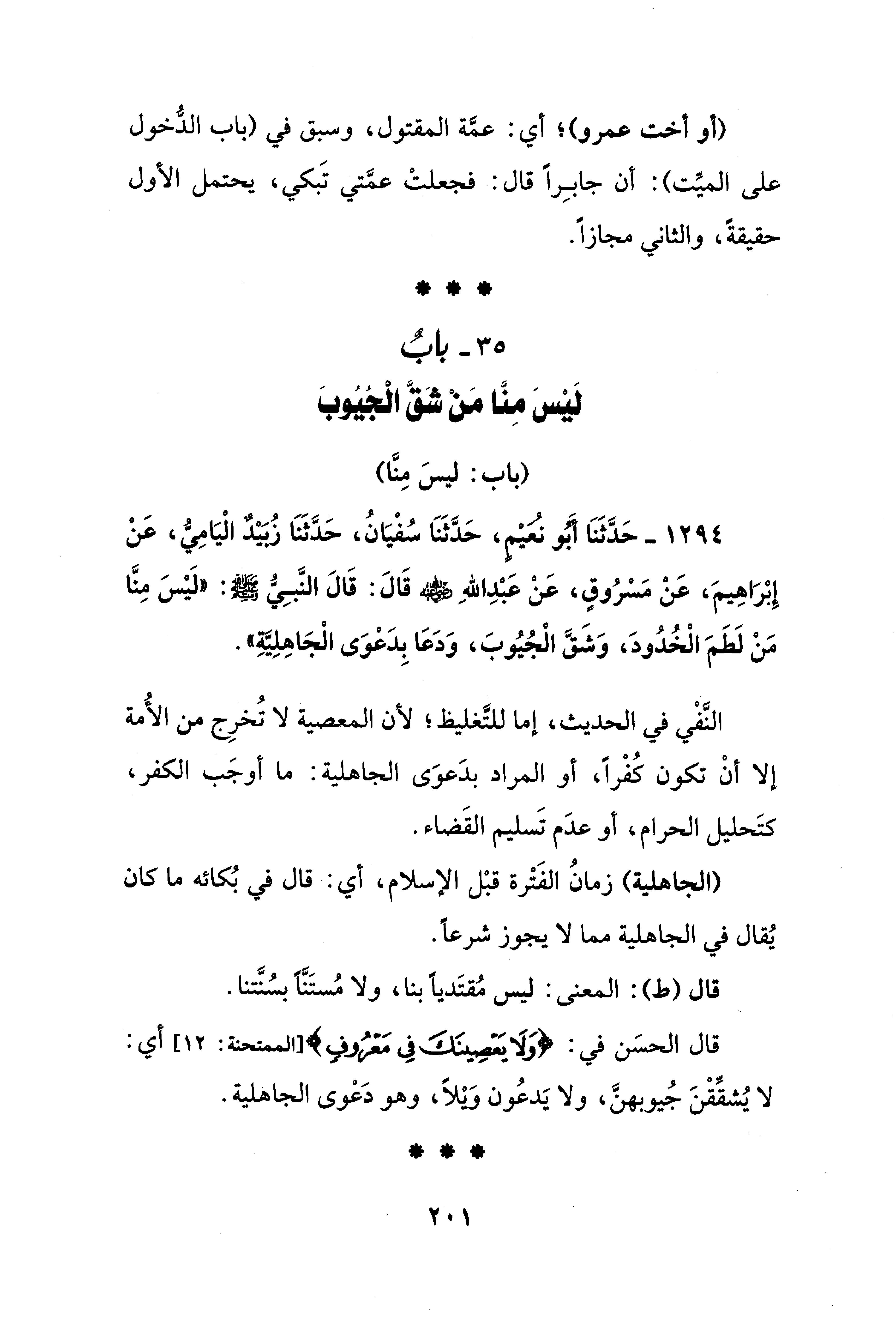 1294 - حَدَّثَنَا أَبُو نُعَيْمٍ، حَدَّثَنَا سُفْيَانُ، حَدَّثَنَا زُبَيْدٌ الْيَامِيُّ، عَنْ إِبْرَاهِيمَ، عَنْ مَسْرُوقٍ، عَنْ عَبْدِ اللهِ - رضي الله عنه - قَالَ: قَالَ النَّبِيُّ - صلى الله عليه وسلم -: "لَيْسَ مِنَّا مَنْ لَطَمَ الْخُدُودَ، وَشَقَّ الْجُيُوبَ، وَدَعَا بِدَعْوَى الْجَاهِلِيَّةِ".