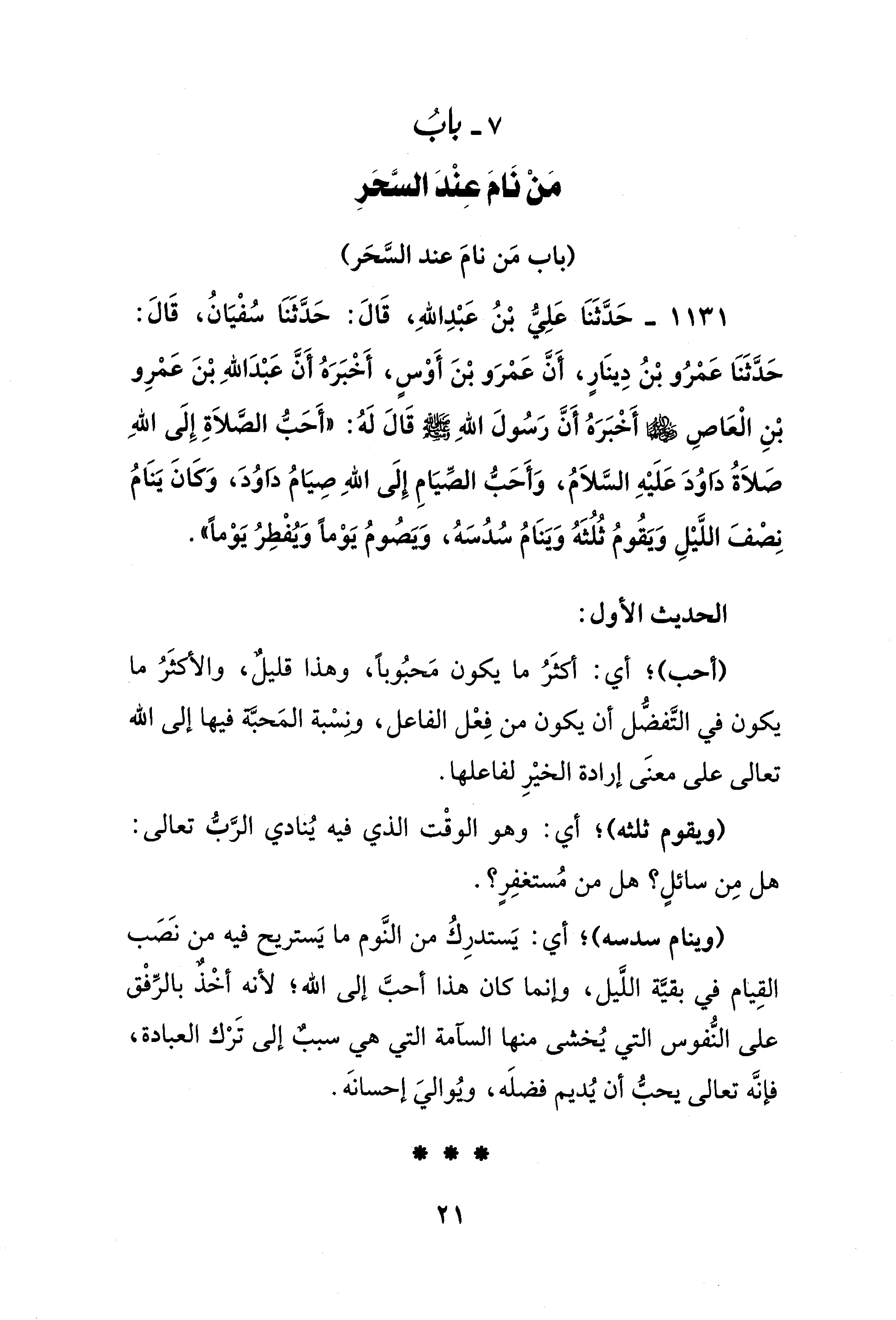 1131 - حَدَّثَنَا عَلِيُّ بْنُ عَبْدِ اللهِ، قَالَ: حَدَّثَنَا سُفْيَانُ، قَالَ: حَدَّثَنَا عَمْرُو بْنُ دِينَارٍ، أَنَّ عَمْرَو بْنَ أَوْسٍ، أَخْبَرَهُ أَنَّ عَبْدَ اللهِ بْنَ عَمْرِو بْنِ الْعَاصِ - رضي الله عنهما - أَخْبَرَهُ أَنَّ رَسُولَ اللهِ - صلى الله عليه وسلم - قَالَ لَهُ: "أَحَبُّ الصَّلاَةِ إِلَى اللهِ صَلاَةُ داوُدَ عَلَيْهِ السَّلاَمُ، وَأَحَبُّ الصِّيَامِ إِلَى اللهِ صِيَامُ داوُدَ، وَكَانَ يَنَامُ نِصْفَ اللَّيْلِ وَيَقُومُ ثُلُثَهُ وَيَنَامُ سُدُسَهُ، وَيَصُومُ يَوْمًا وَيُفْطِرُ يَوْمًا".
