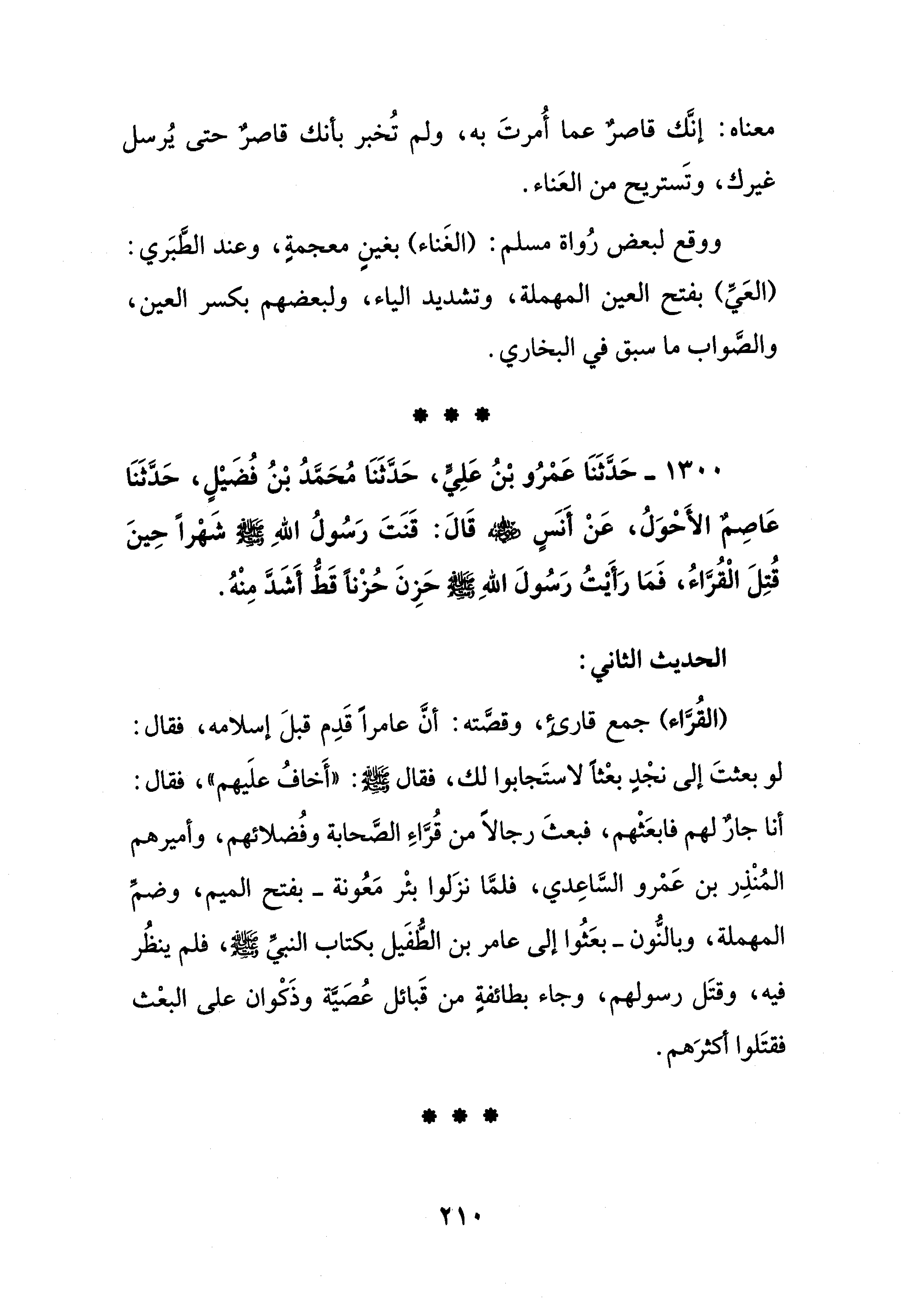1300 - حَدَّثَنَا عَمْرُو بْنُ عَلِيٍّ، حَدَّثَنَا مُحَمَّدُ بْنُ فُضَيْلٍ، حَدَّثَنَا عَاصِمٌ الأَحْوَلُ، عَنْ أَنسٍ - رضي الله عنه - قَالَ: قَنَتَ رَسُولُ اللهِ - صلى الله عليه وسلم - شَهْرًا حِينَ قُتِلَ الْقُرَّاءُ، فَمَا رَأَيْتُ رَسُولَ اللهِ - صلى الله عليه وسلم - حَزِنَ حُزْنًا قَطُّ أَشَدَّ مِنْهُ.