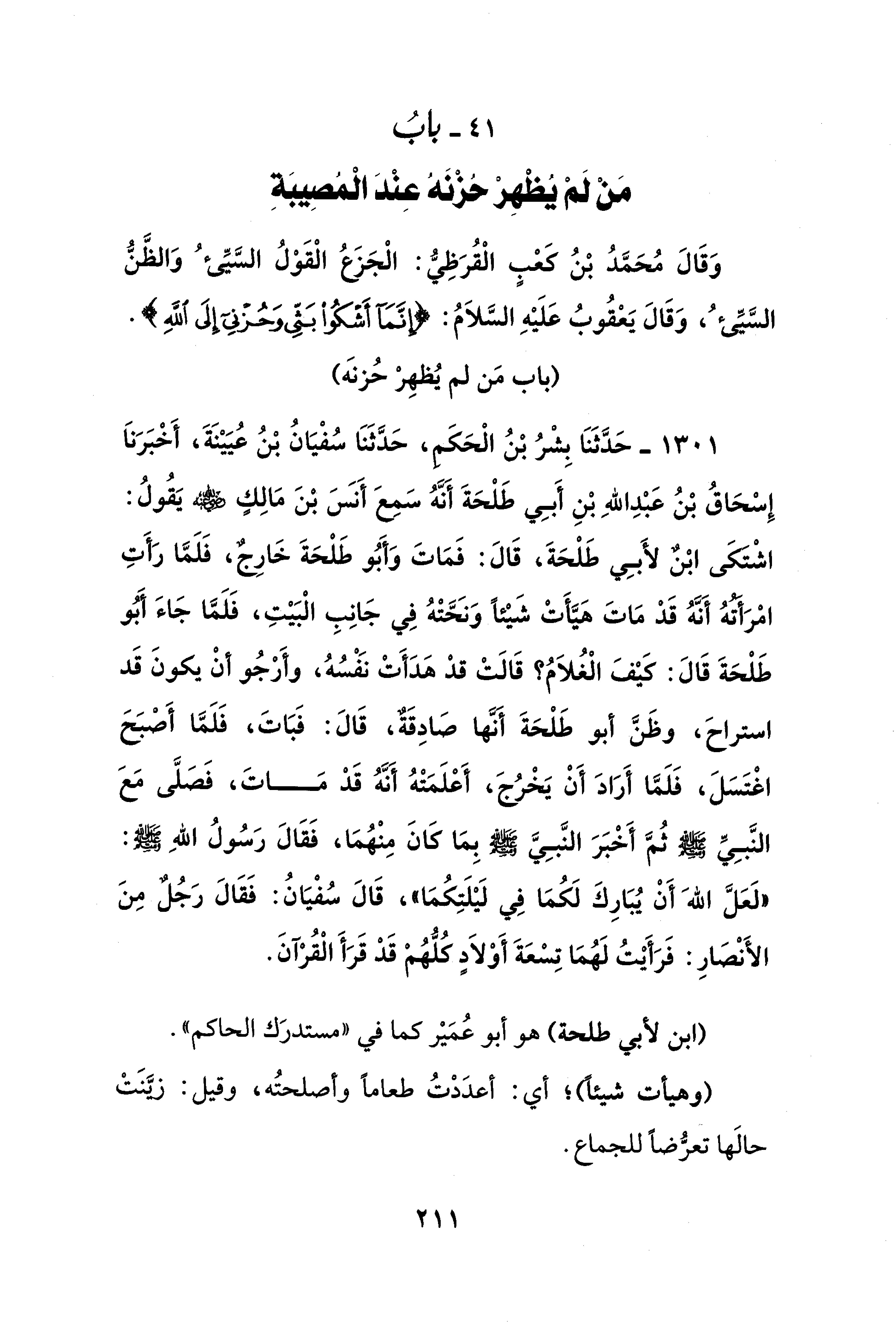 1301 - حَدَّثَنَا بِشْرُ بْنُ الْحَكَمِ، حَدَّثَنَا سُفْيَانُ بْنُ عُيَيْنَةَ، أَخْبَرَناَ إِسْحَاقُ بْنُ عَبْدِ اللهِ بْنِ أَبِي طَلْحَةَ أَنَّهُ سَمِعَ أَنَسَ بْنَ مَالِكٍ - رضي الله عنه - يَقُولُ: اشْتَكَى ابْنٌ لأَبِي طَلْحَةَ، قَالَ: فَمَاتَ وَأَبُو طَلْحَةَ خَارِجٌ، فَلَمَّا رَأَتِ امْرَأَتُهُ أَنَّهُ قَدْ مَاتَ هَيَّأَتْ شَيْئًا وَنَحَّتْهُ فِي جَانِبِ الْبَيْتِ، فَلَمَّا جَاءَ أَبُو طَلْحَةَ قَالَ: كَيْفَ الْغُلاَمُ؟ قَالَتْ قدْ هَدَأَتْ نَفْسُهُ، وأَرْجُو أنْ يكونَ قَد استراحَ، وظَنَّ أبو طَلْحَةَ أَنَّها صَادِقَةٌ، قَالَ: فَبَاتَ، فَلَمَّا أَصْبَحَ اغْتَسَلَ، فَلَمَّا أَرَادَ أَنْ يَخْرُجَ، أَعْلَمَتْهُ أَنَّهُ قَدْ مَاتَ، فَصَلَّى مَعَ النَّبِيِّ - صلى الله عليه وسلم - ثُمَّ أَخْبَرَ النَّبِيَّ - صلى الله عليه وسلم - بِمَا كَانَ مِنْهُمَا، فَقَالَ رَسُولُ اللهِ - صلى الله عليه وسلم -: "لَعَلَّ اللهَ أَنْ يُبَارِكَ لَكُمَا فِي لَيْلَتِكُمَا" قَالَ سُفْيَانُ: فَقَالَ رَجُلٌ مِنَ الأَنْصَارِ: فَرَأَيْتُ لَهُمَا تِسْعَةَ أَوْلاَدٍ كُلُّهُمْ قَدْ قَرَأَ الْقُرْآنَ.