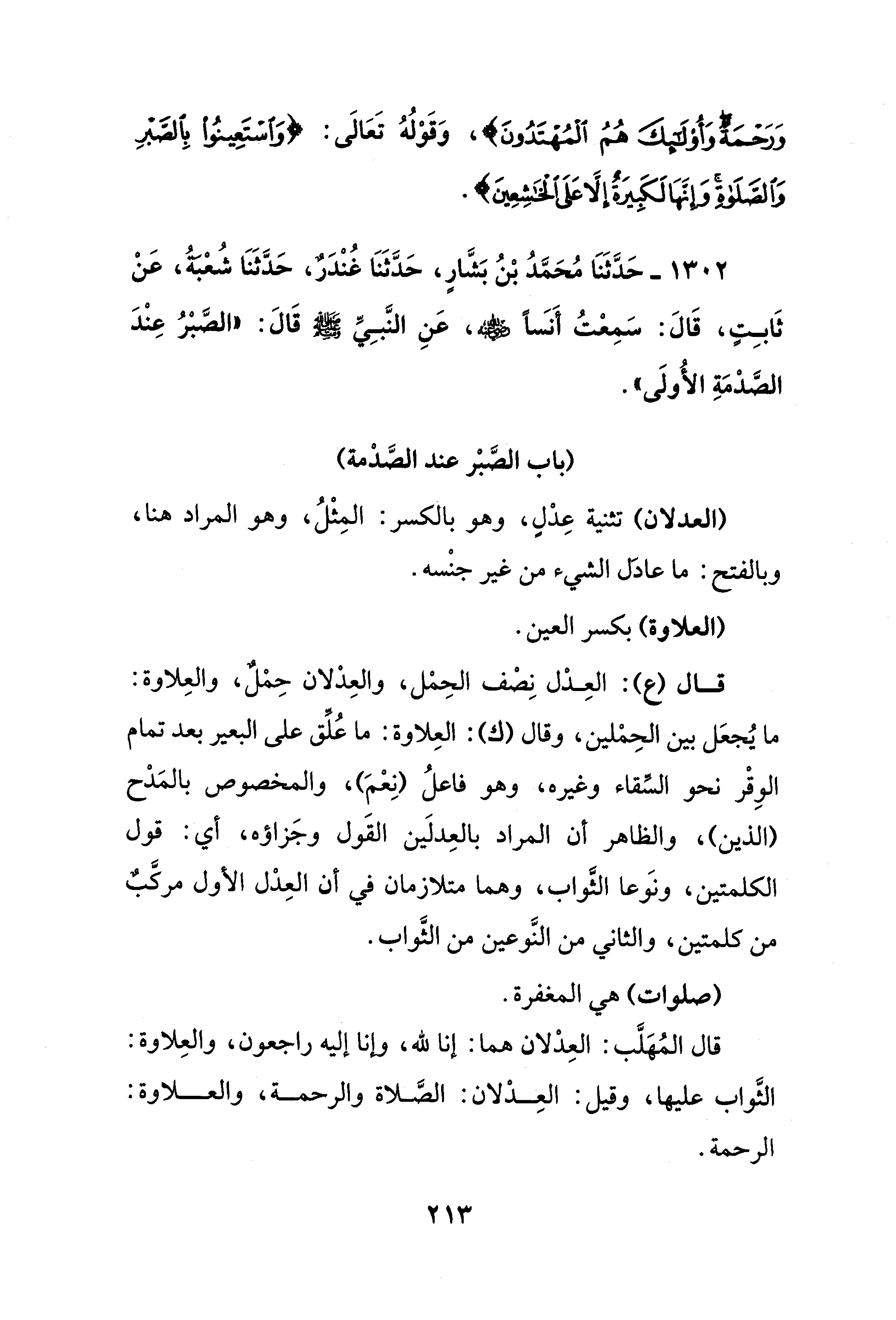 1302 - حَدَّثَنَا مُحَمَّدُ بْنُ بَشَّارٍ، حَدَّثَنَا غُنْدَرٌ، حَدَّثَنَا شُعْبَةُ، عَنْ ثَابِتٍ، قَالَ: سَمِعْتُ أَنَسًا - رضي الله عنه -، عَنِ النَّبِيِّ - صلى الله عليه وسلم - قَالَ: "الصَّبْرُ عِنْدَ الصَّدْمَةِ الأُولَى".