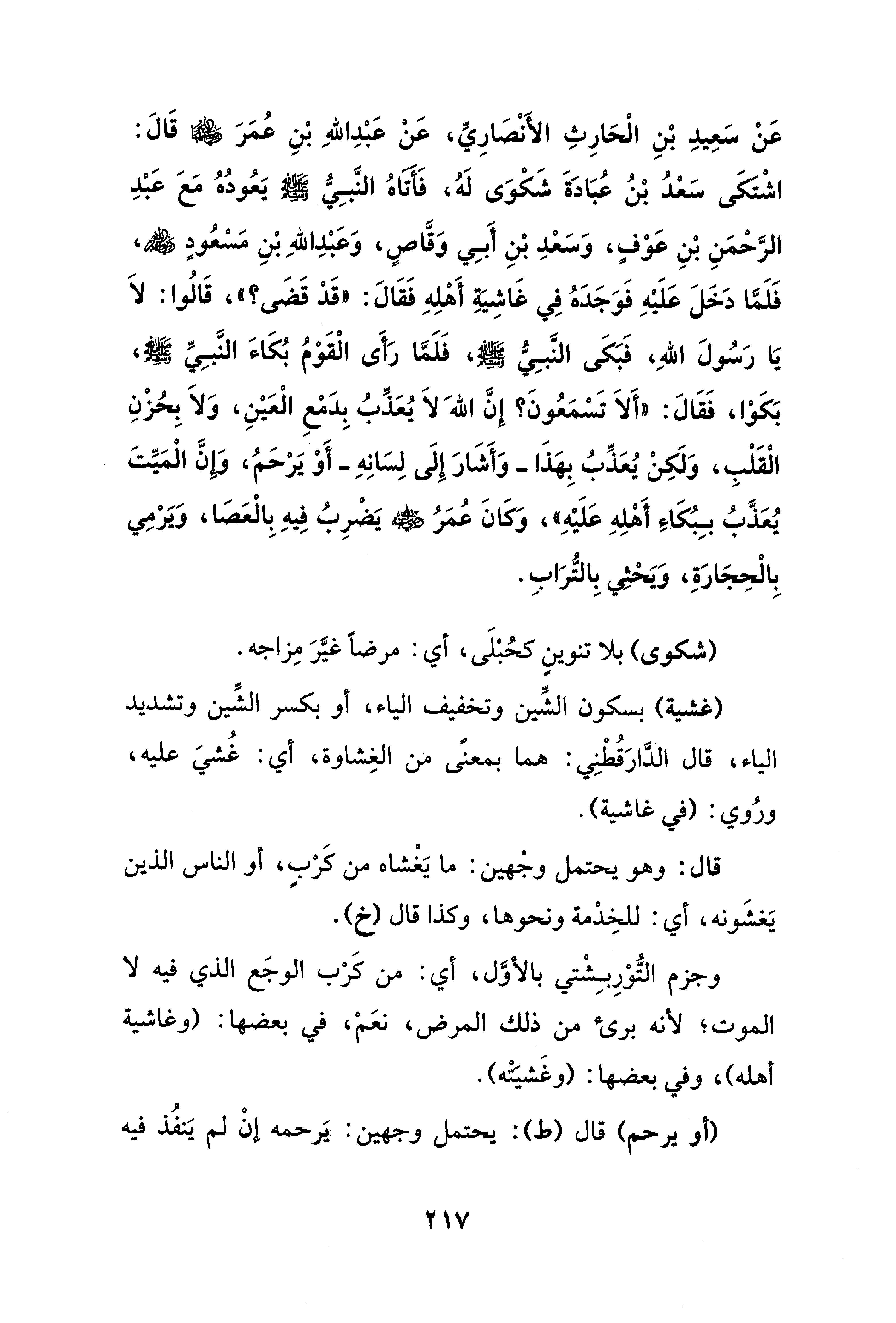 عَنْ سَعِيدِ بْنِ الْحَارِثِ الأَنْصَارِيِّ، عَنْ عَبْدِ اللهِ بْنِ عُمَرَ - رضي الله عنه - قَالَ: اشْتكَى سَعْدُ بْنُ عُبَادَةَ شَكْوَى لَهُ، فَأتاهُ النَّبِيُّ - صلى الله عليه وسلم - يَعُودُهُ مَعَ عَبْدِ الرَّحْمَنِ بْنِ عَوْفٍ، وَسَعْدِ بْنِ أَبِي وَقَّاصٍ، وَعَبْدِ اللهِ بْنِ مَسْعُودٍ - رضي الله عنه -، فَلَمَّا دَخَلَ عَلَيْهِ فَوَجَدَهُ فِي غَاشِيَةِ أَهْلِهِ فَقَالَ: "قَدْ قَضَى؟ "، قَالُوا: لاَ يَا رَسُولَ اللهِ، فَبَكَى النَّبِيُّ - صلى الله عليه وسلم -، فَلَمَّا رَأَى الْقَوْمُ بُكَاءَ النَّبِيِّ - صلى الله عليه وسلم -، بَكَوْا، فَقَالَ: "أَلاَ تَسْمَعُونَ؟ إِنَّ اللهَ لاَ يُعَذِّبُ بِدَمْعِ الْعَيْنِ، وَلاَ بِحُزْنِ الْقَلْبِ، وَلَكِنْ يُعَذِّبُ بِهَذَا -وَأَشَارَ إِلَى لِسَانِهِ- أَوْ يَرْحَمُ، وَإِنَّ الْمَيِّتَ يُعَذَّبُ بِبُكَاءِ أَهْلِهِ عَلَيْهِ"، وَكانَ عُمَرُ - رضي الله عنه - يَضْرِبُ فِيهِ بِالْعَصَا، وَيَرْمِي بِالْحِجَارَةِ، وَيَحْثِي بِالتُّرَابِ.