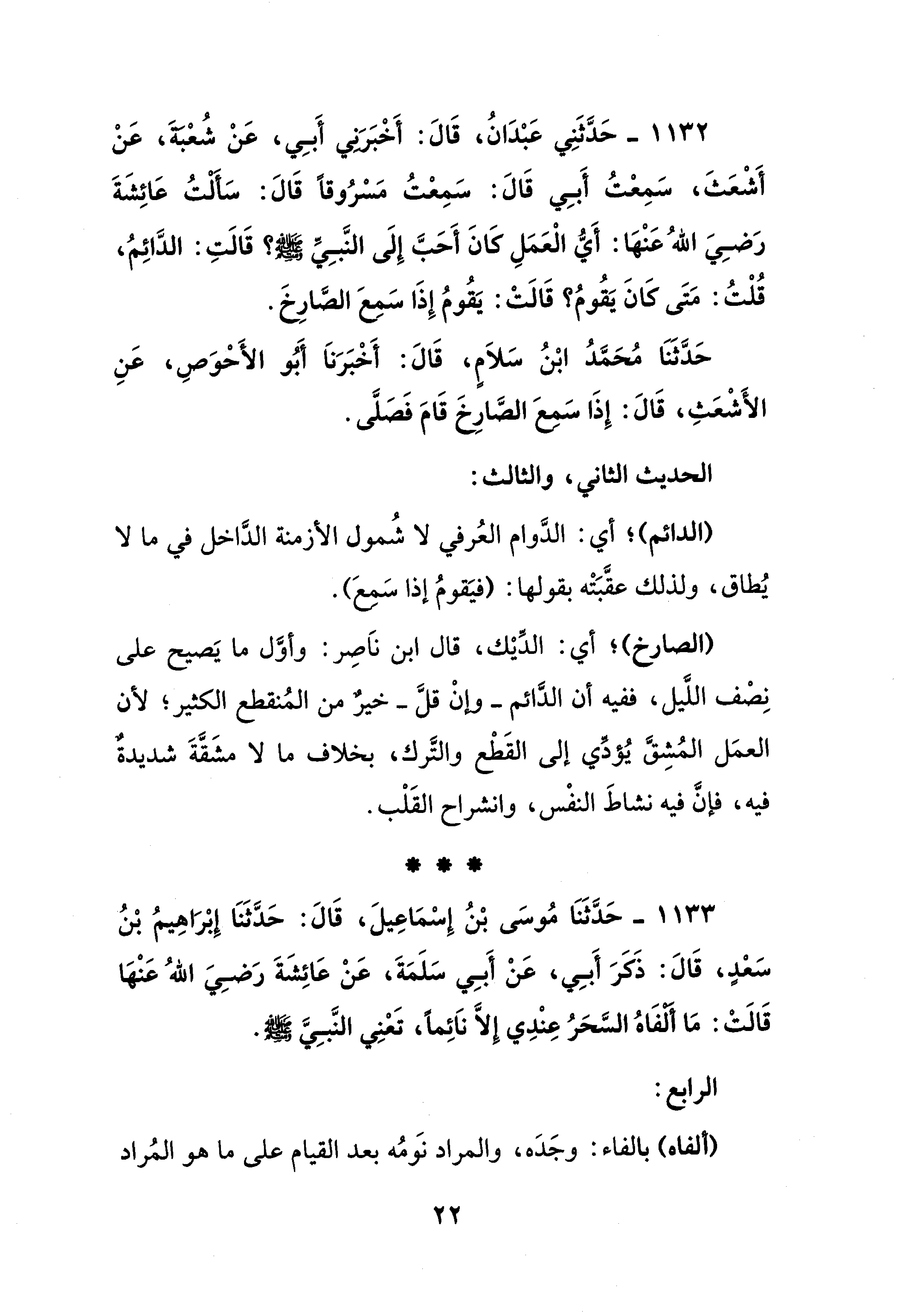 1132 - حَدَّثَنِي عَبْدَانُ، قَالَ: أَخْبَرَني أَبِي، عَنْ شُعْبةَ، عَنْ أَشْعَثَ، سَمِعْتُ أَبِي قَالَ: سَمِعْتُ مَسْرُوقًا قَالَ: سَألْتُ عَائِشَةَ رَضِيَ اللهُ عَنْهَا: أَيُّ الْعَمَلِ كَانَ أَحَبَّ إِلَى النَّبِيِّ - صلى الله عليه وسلم -؟ قَالَتِ: الدَّائِمُ، قُلْتُ: مَتَى كانَ يَقُومُ؟ قَالَتْ: يَقُومُ إِذَا سَمِعَ الصَّارِخَ.