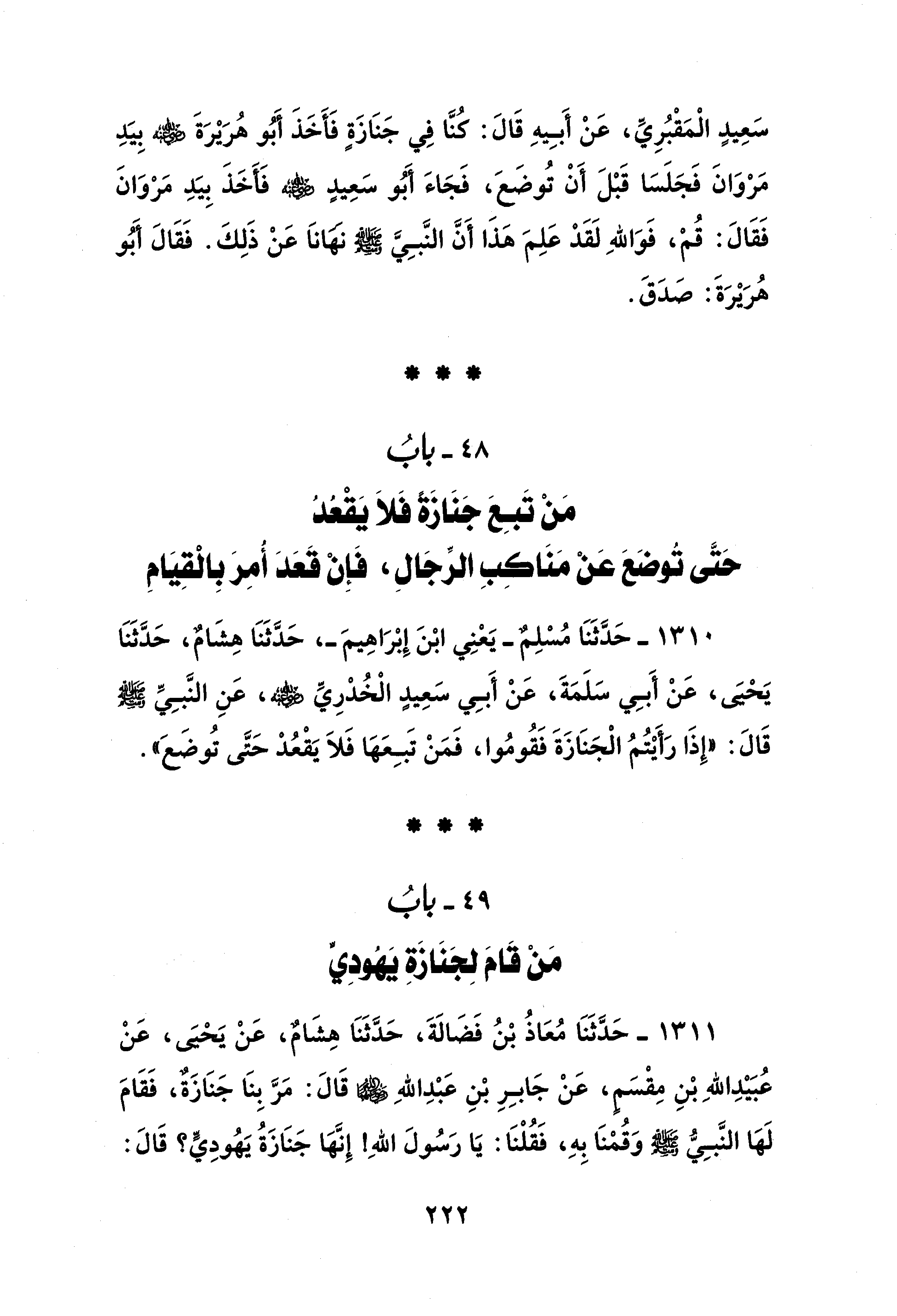 48 - بابُ مَنْ تَبِعَ جَنَازَةً فَلاَ يَقْعُدُ حَتَّى تُوضَعَ عَنْ مَنَاكِبِ الرِّجَالِ، فَإِنْ قَعَدَ أُمِرَ بِالْقِيَامِ