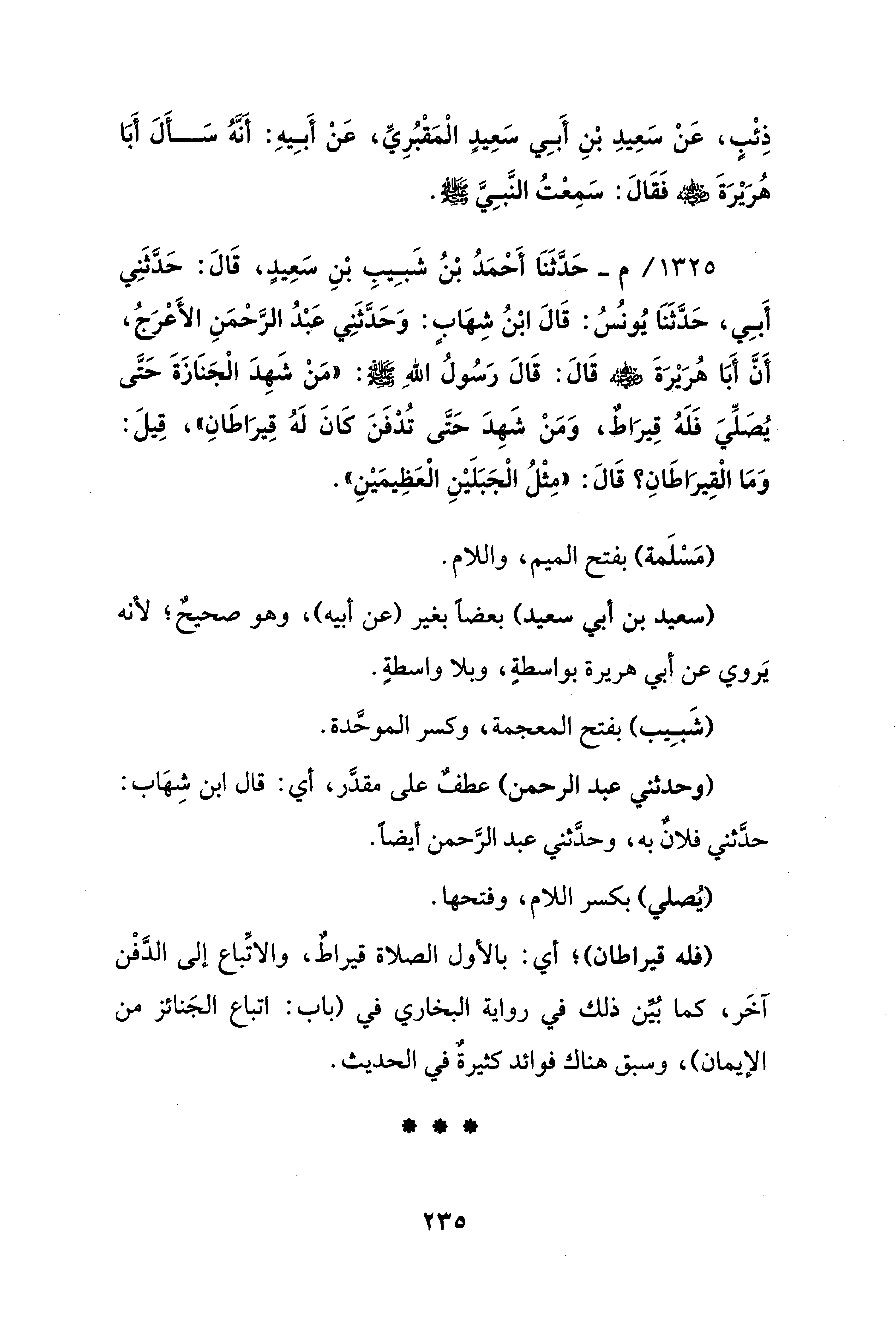 1325 / -م - حَدَّثَنَا أَحْمَدُ بْنُ شَبِيبِ بْنِ سَعِيدٍ، قَالَ: حَدَّثَنِي أَبِي، حَدَّثَنَا يُونسُ: قَالَ ابْنُ شِهَابٍ: وَحَدَّثَنِي عَبْدُ الرَّحْمَنِ الأَعْرَجُ، أَنَّ أَبَا هُرَيْرَةَ - رضي الله عنه - قَالَ: قَالَ رَسُولُ اللهِ - صلى الله عليه وسلم -: "مَنْ شَهِدَ الْجَنَازَةَ حَتَّى يُصَلِّيَ فَلَهُ قِيرَاطٌ، وَمَنْ شَهِدَ حَتَّى تُدْفَنَ كَانَ لَهُ قِيرَاطَانِ"، قِيلَ: وَمَا الْقِيرَاطَانِ؟ قَالَ: "مِثْلُ الْجَبَلَيْنِ الْعَظِيمَيْنِ".
