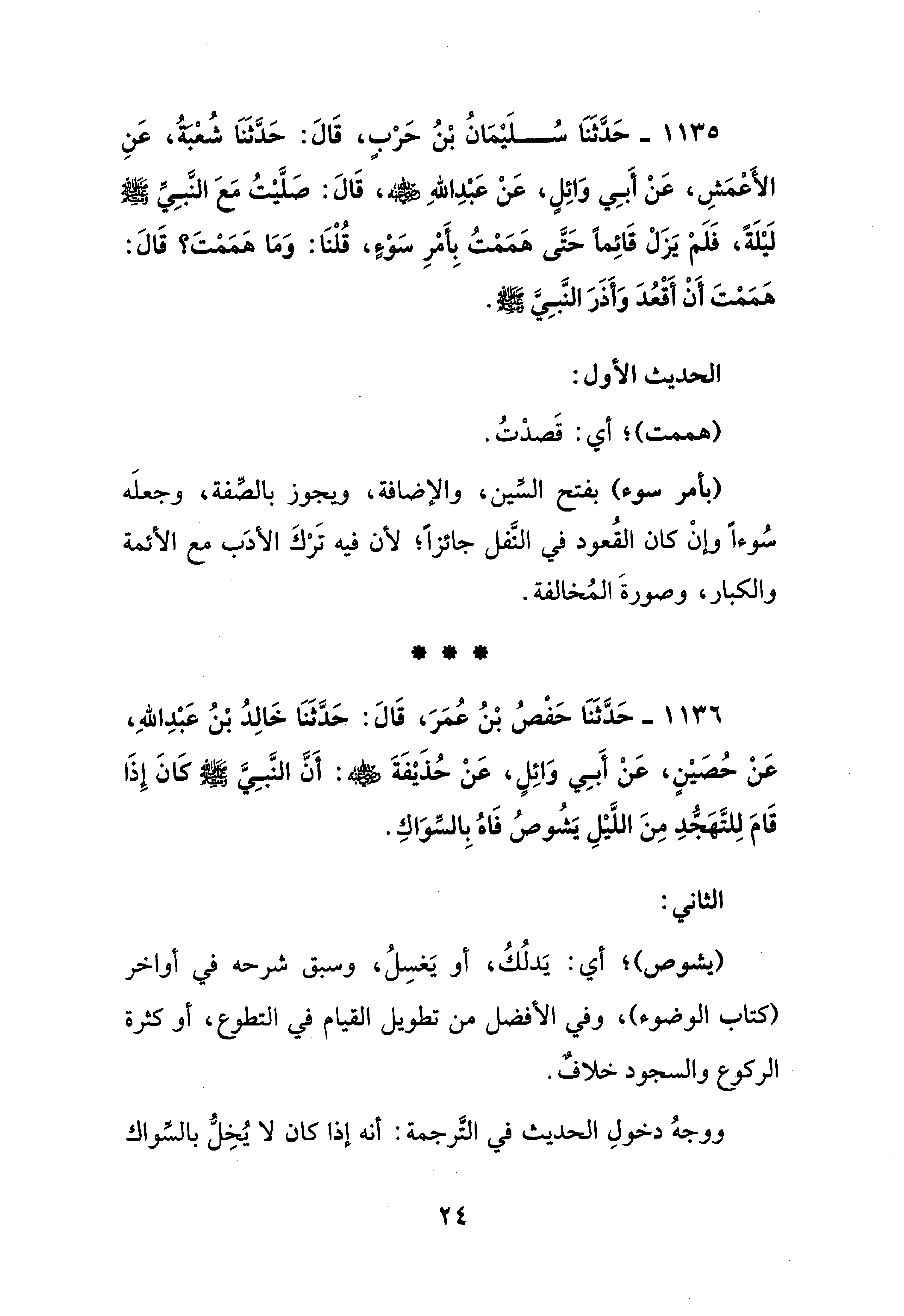 1135 - حَدَّثَنَا سُلَيْمَانُ بْنُ حَرْبٍ، قَالَ: حَدَّثَنَا شُعْبةُ، عَنِ الأَعْمَشِ، عَنْ أَبِي وَائِلٍ، عَنْ عَبْدِ اللهِ - رضي الله عنه -، قَالَ: صَلَّيْتُ مَعَ النَّبِيِّ - صلى الله عليه وسلم - لَيْلَةً، فَلَمْ يَزَلْ قَائِمًا حَتَّى هَمَمْتُ بِأمْرِ سَوْءً، قُلْنَا: وَمَا هَمَمْتَ؟ قَالَ: هَمَمْتَ أَنْ أَقْعُدَ وَأَذَرَ النَّبِيَّ - صلى الله عليه وسلم -.