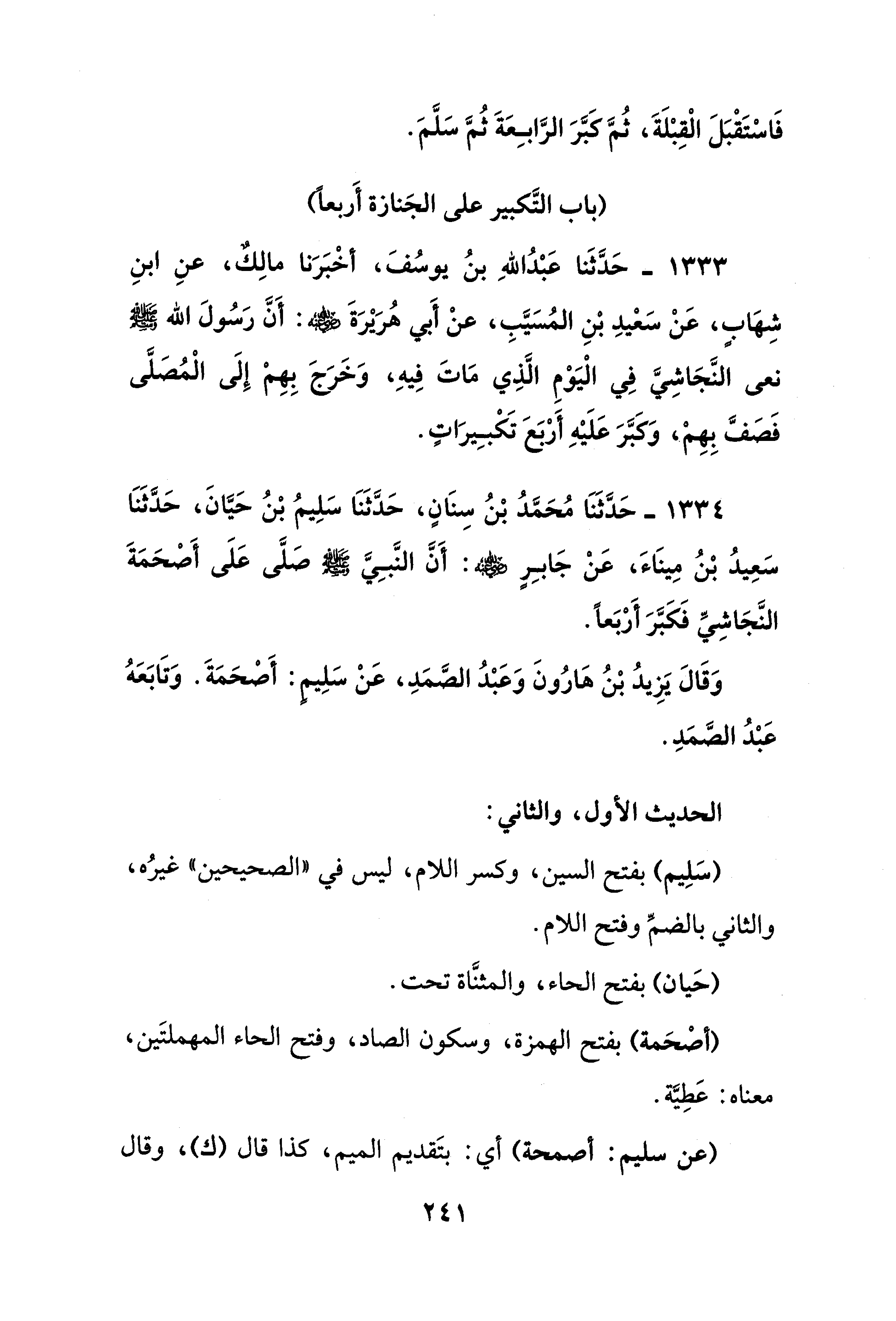 1333 - حَدَّثَنا عَبْدُ اللهِ بنُ يوسُفَ، أخْبَرَنا مالِكٌ، عنِ ابنِ شِهَابٍ، عَنْ سَعْيدِ بْنِ المُسَيَّبِ، عنْ أَبي هُرَيْرَةَ - رضي الله عنه -: أَنَّ رَسُولَ الله - صلى الله عليه وسلم - نعى النَّجَاشِيَّ فِي الْيَوْمِ الَّذِي مَاتَ فِيهِ، وَخَرَجَ بِهِمْ إِلَى الْمُصَلَّى فَصَفَّ بِهِمْ، وَكَبَّرَ عَلَيْهِ أَرْبَعَ تَكْبِيرَاتٍ.