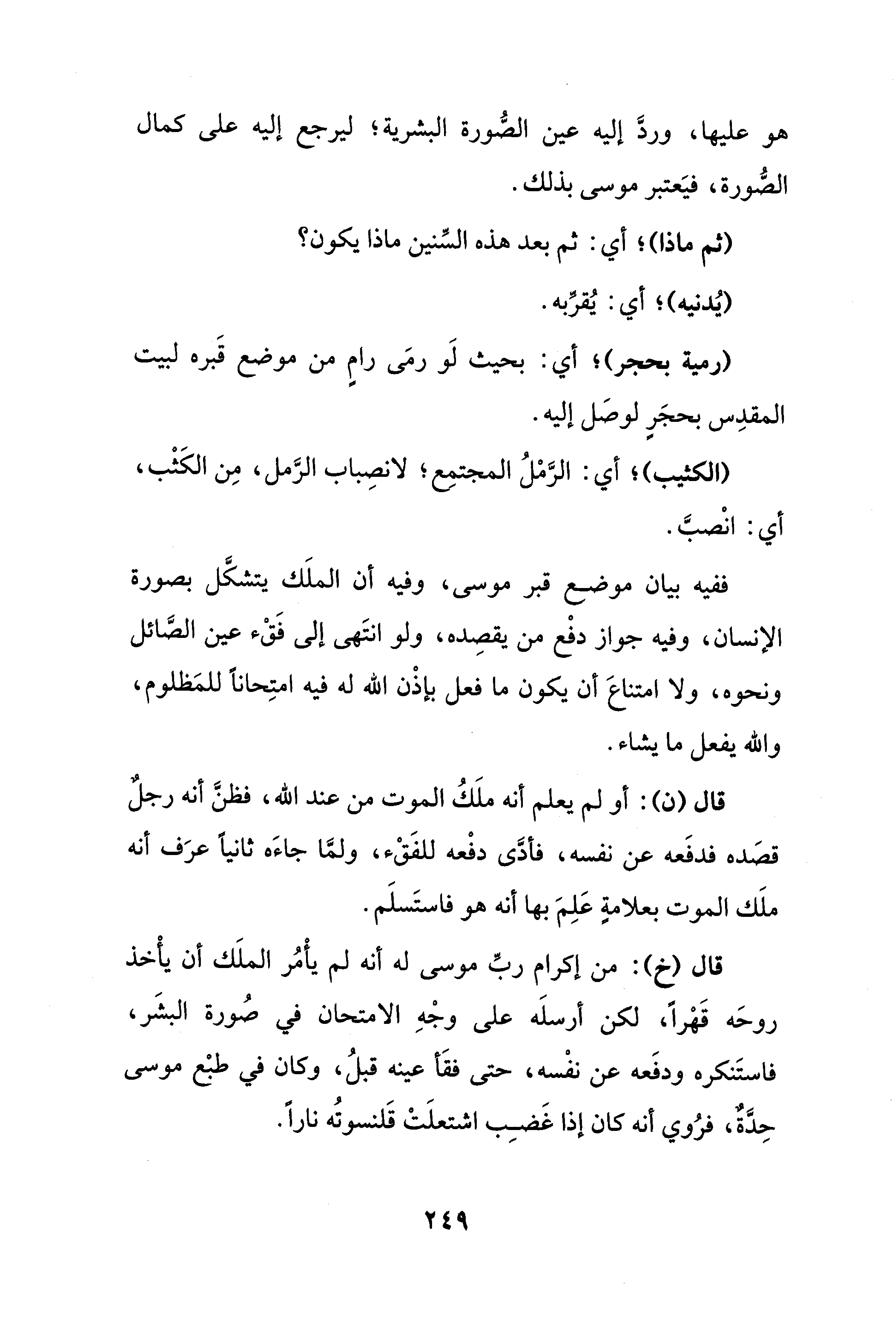 قال (خ): من إكرام ربِّ موسى له أنه لم يأْمر الملَك أن يأْخذ روحَه قَهْرًا، لكن أرسلَه على وجْهِ الامتحان في صُورة البشَر، فاستَنكره ودفَعه عن نفْسه، حتى فقَأ عينه قبلُ، وكان في طبْع موسى حِدَّةٌ، فرُوي أنه كان إذا غَصِب اشتعلَتْ قَلنسوتُه نارًا،