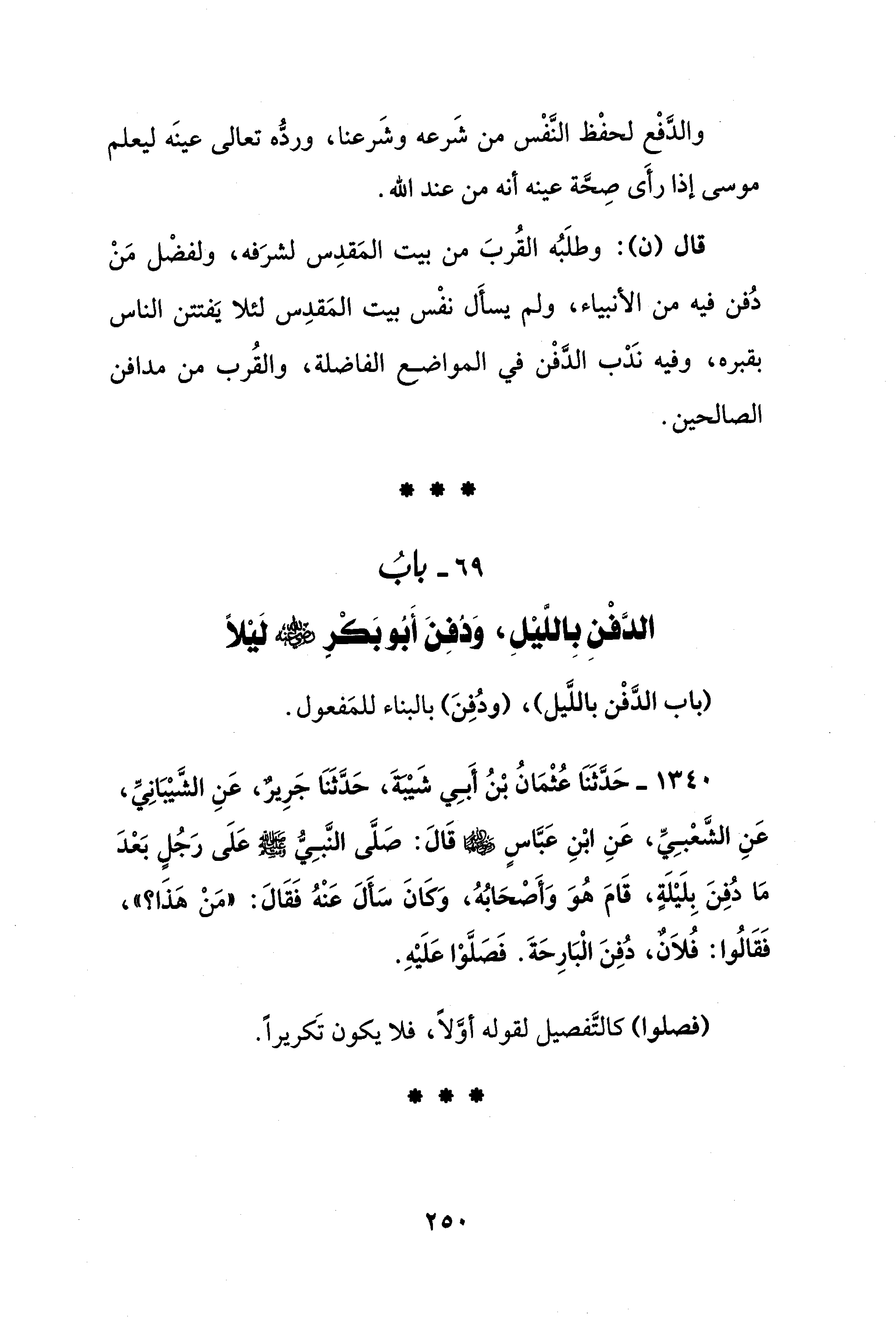 1340 - حَدَّثَنَا عُثْمَانُ بْنُ أَبِي شَيْبَةَ، حَدَّثَنَا جَرِيرٌ، عَنِ الشَّيْبَانِيِّ، عَنِ الشَّعْبِيِّ، عَنِ ابْنِ عَبَّاسٍ - رضي الله عنه - قَالَ: صَلَّى النَّبِيُّ - صلى الله عليه وسلم - عَلَى رَجُلٍ بَعْدَ مَا دُفِنَ بِلَيْلَةٍ، قَامَ هُوَ وَأَصْحَابُهُ، وَكَانَ سَأَلَ عَنْهُ فَقَالَ: "مَنْ هَذَا؟ "، فَقَالُوا: فُلاَنٌ، دُفِنَ الْبَارِحَةَ. فَصَلَّوْا عَلَيْهِ.